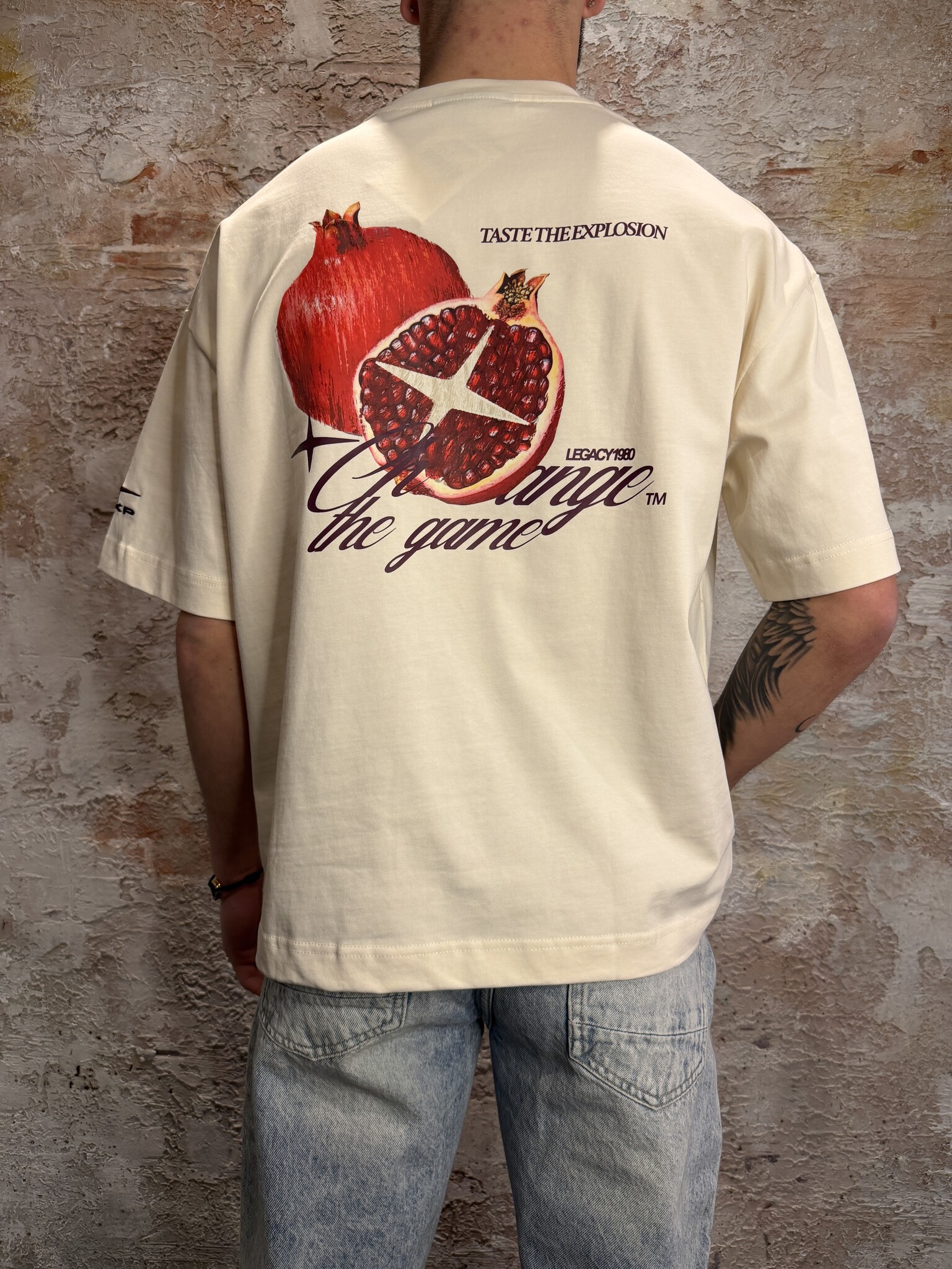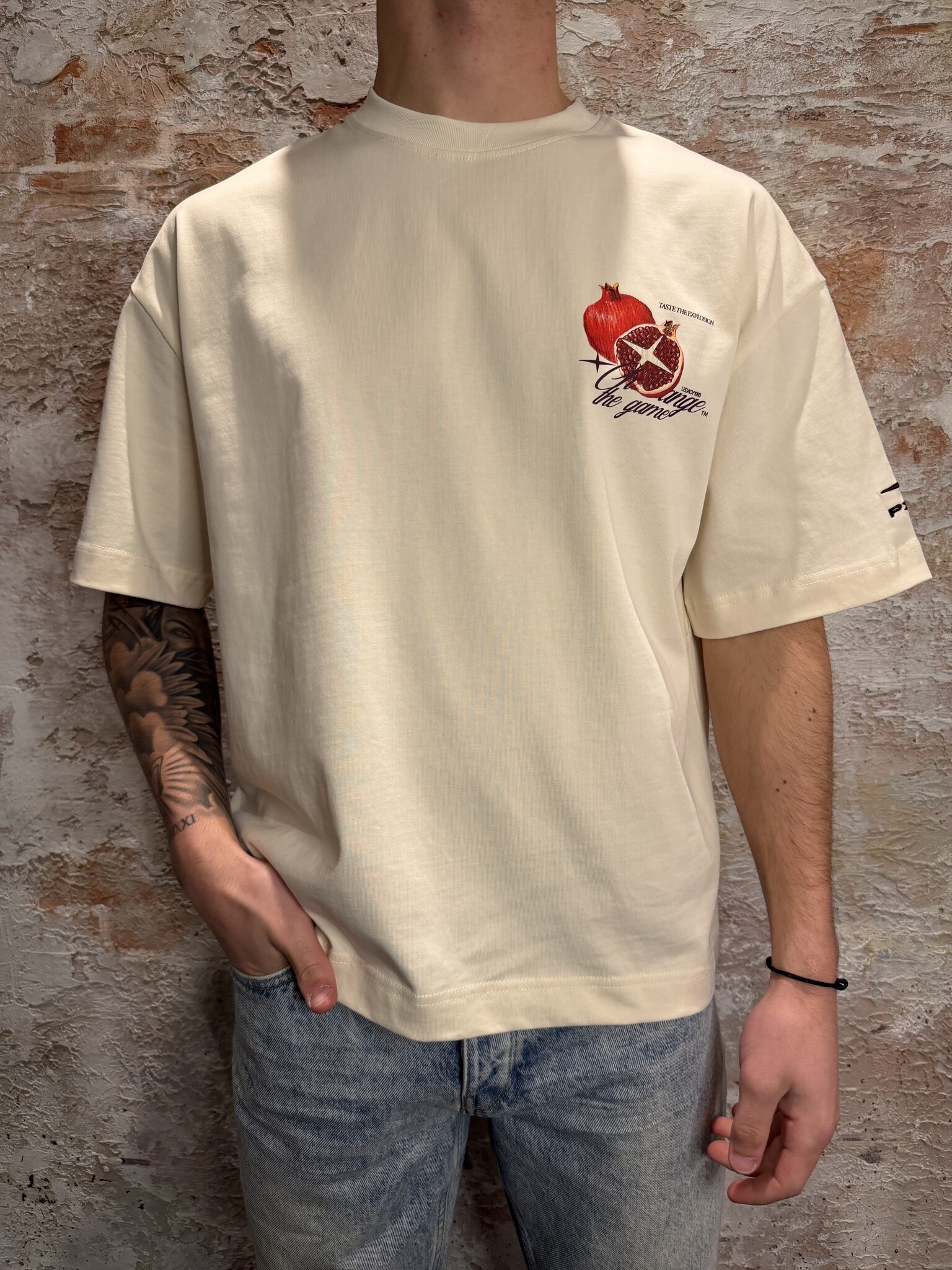 Project X Paris oversized T-shirt in off white met subtiel borstlogo en opvallende pomegranate backprint. Gemaakt van zachte katoenkwaliteit met comfortabele fit. Perfect voor een frisse streetwear look en makkelijk te combineren met jeans of short.