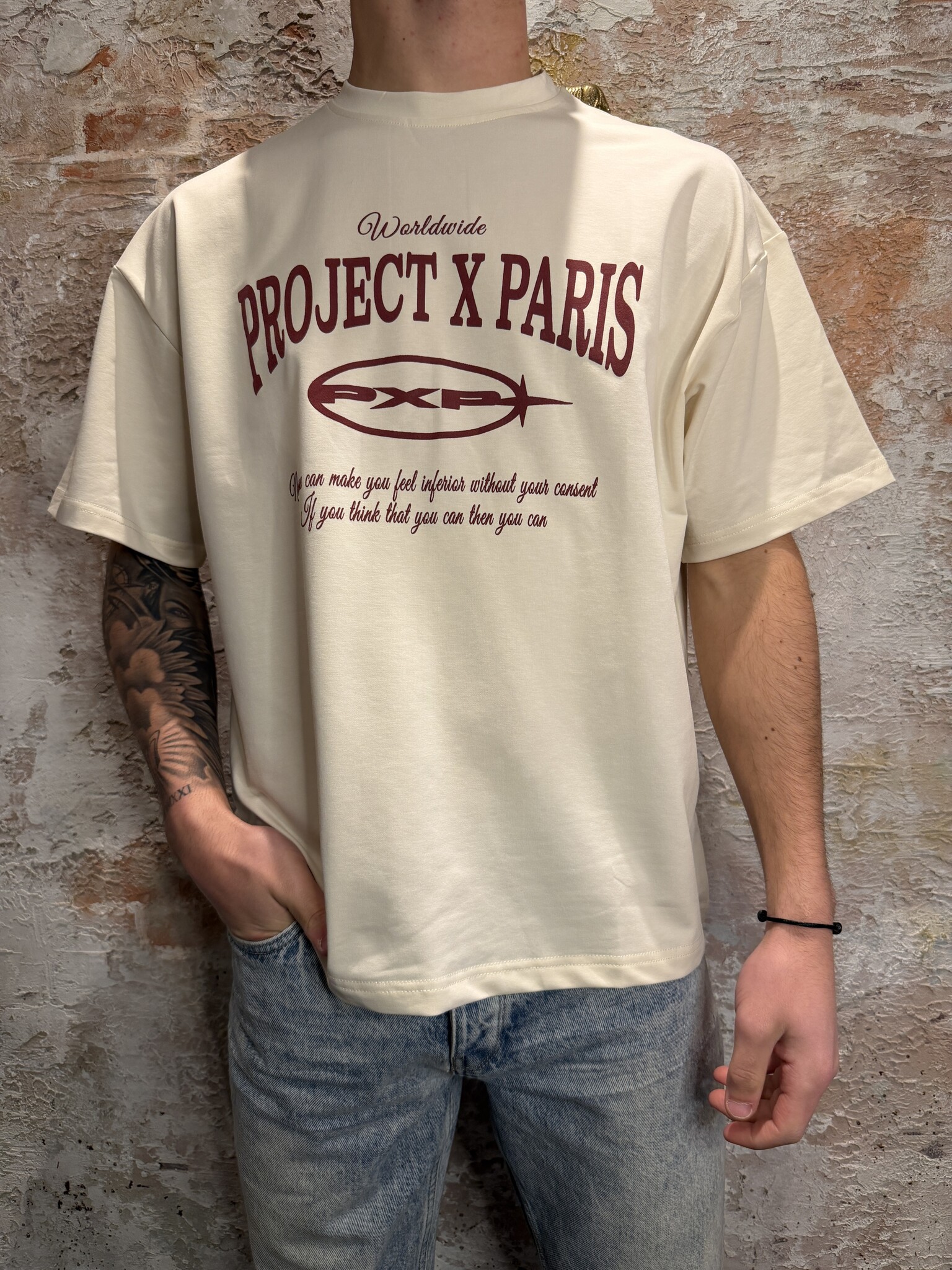 Project X Paris oversized T-shirt in off white met grote “Worldwide Project X Paris” frontprint en subtiele details. Gemaakt van comfortabele katoenkwaliteit met relaxte fit. Perfect voor een minimalistische streetwear look.