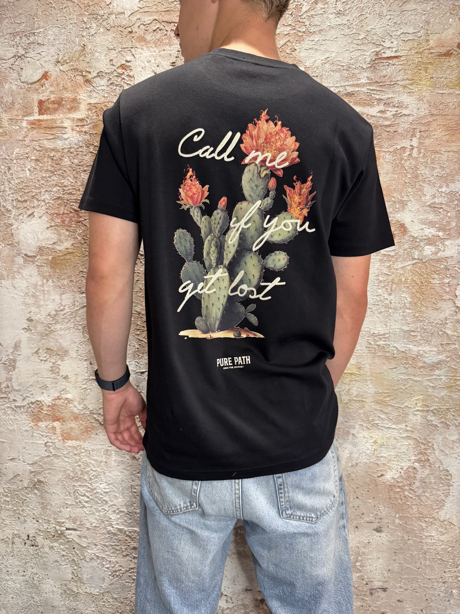et Pure Path Call Me If You Get Lost T-Shirt Black is een stijlvol shirt met een minimalistische frontprint en opvallende backprint van een cactus met bloemen. De tekst “Call me if you get lost” geeft een avontuurlijke twist. Gemaakt van zacht katoen.