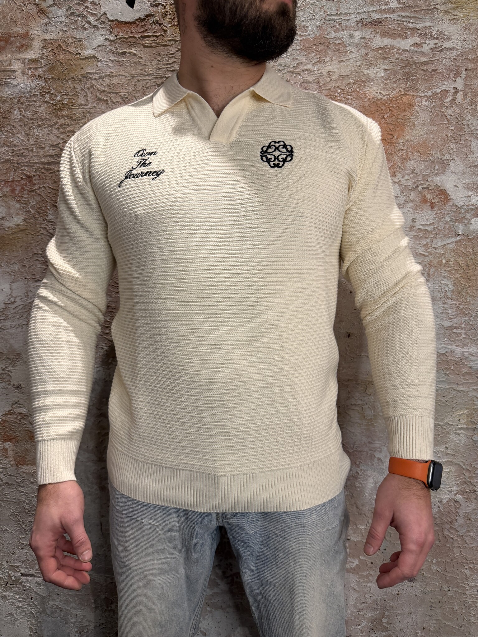 Pure Path Embroidered Knit Polo Off White is een stijlvolle heren polo in gebreide kwaliteit met subtiele borduursels op de borst. De off white kleur en ribboorden geven een luxe, moderne uitstraling. Perfect voor een smart casual look.