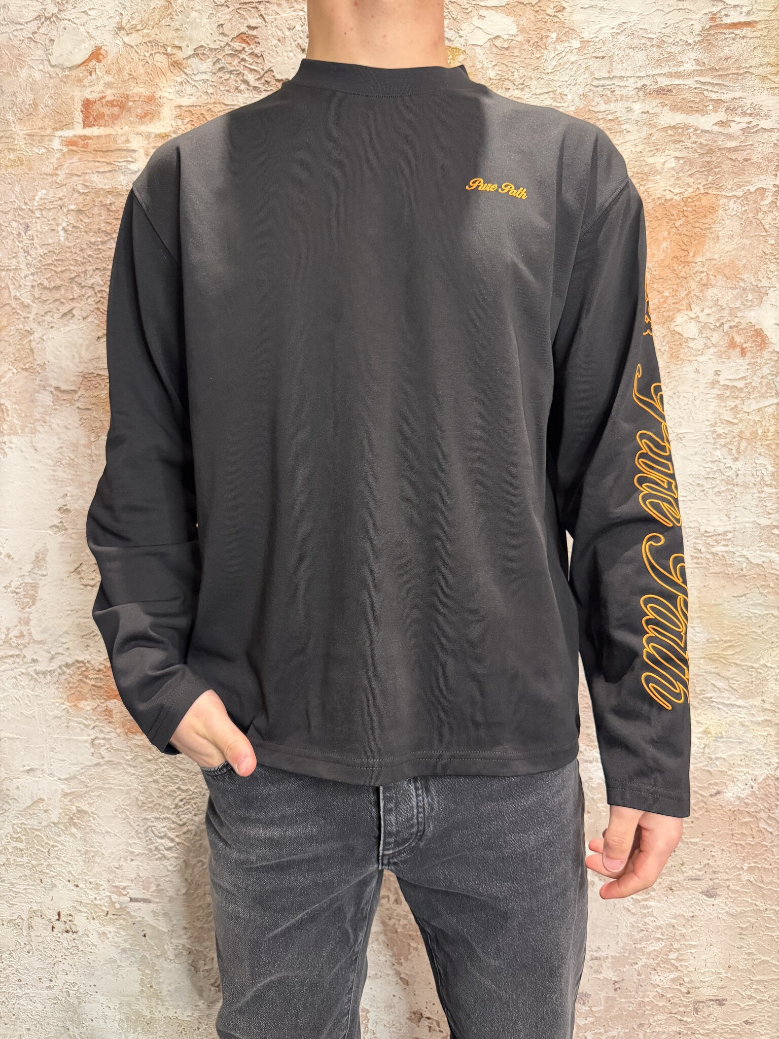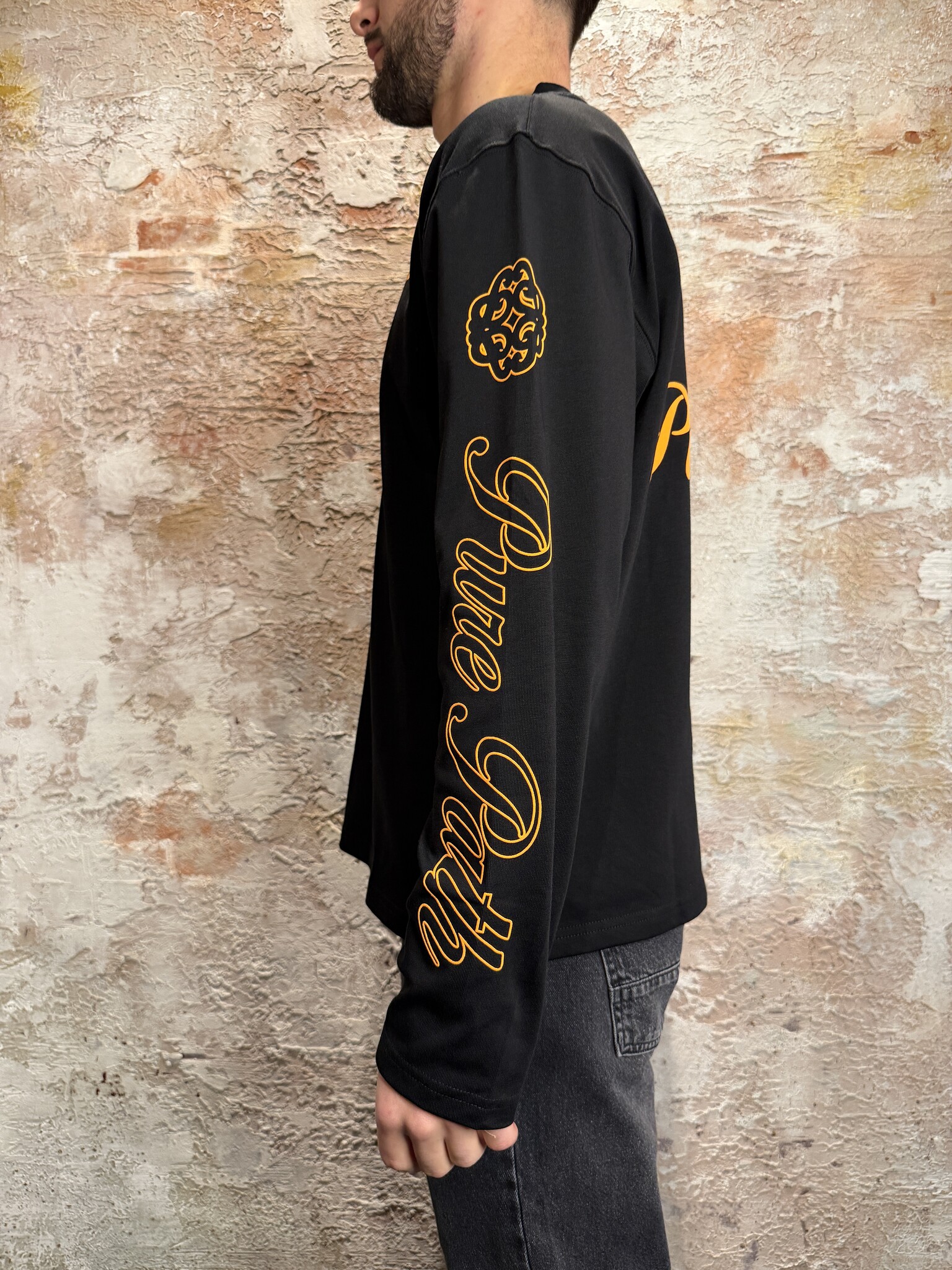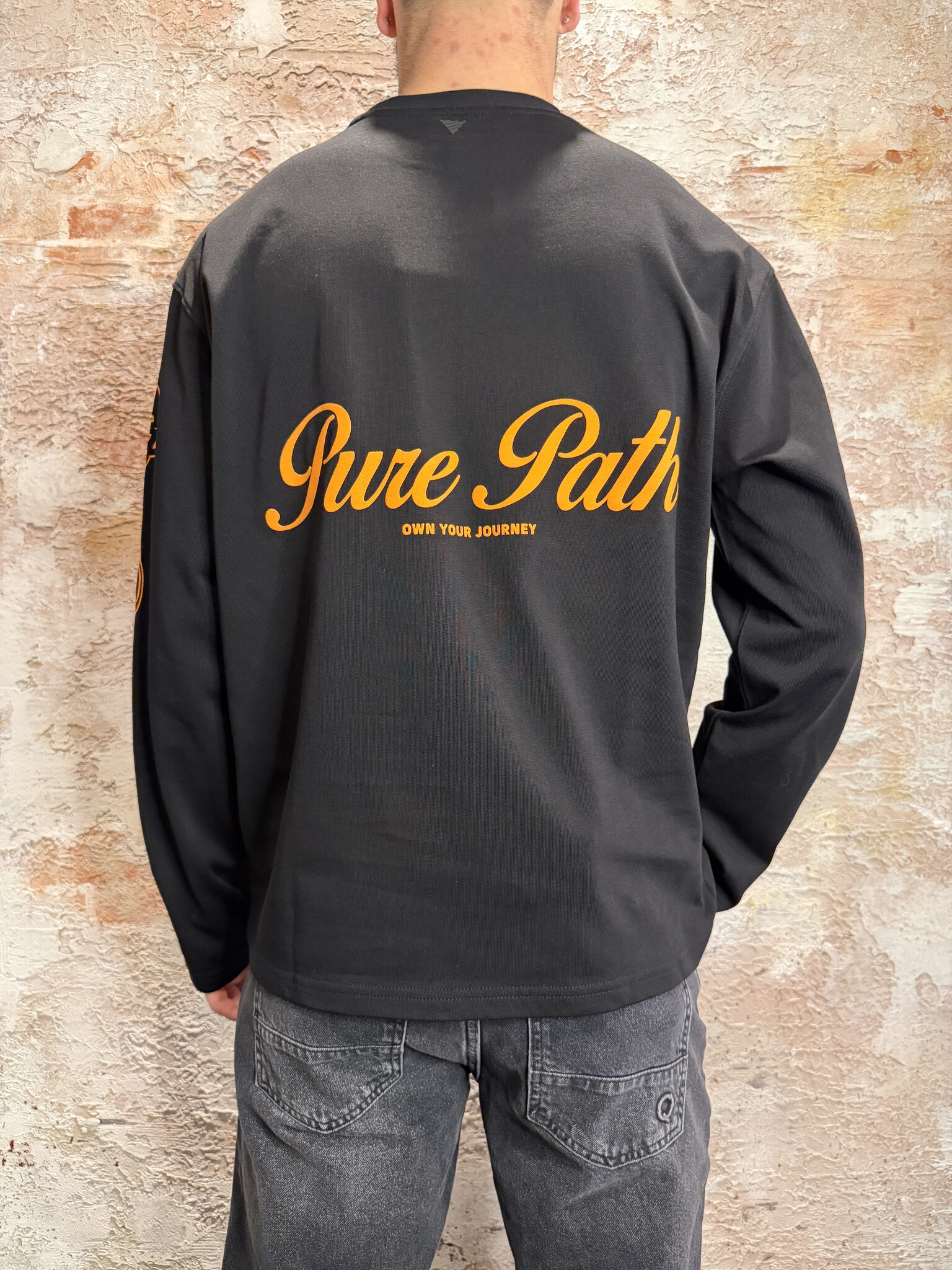 Pure Path longsleeve in zwart met orange logo prints op borst, mouw en rug. Comfortabele regular fit en zachte katoenkwaliteit. Perfect voor een statement Kingsday outfit of casual streetwear look. Makkelijk te combineren met jeans of short.