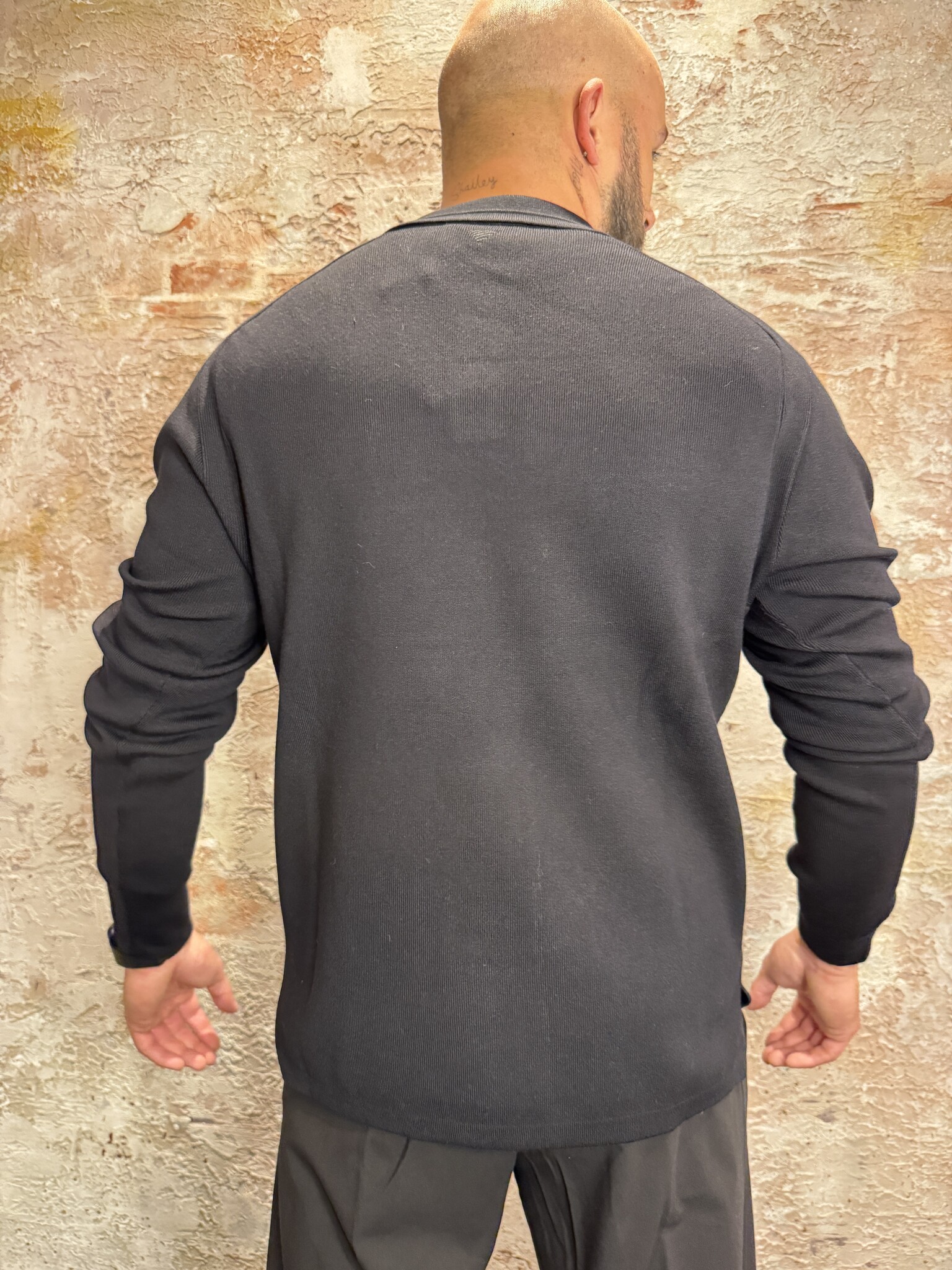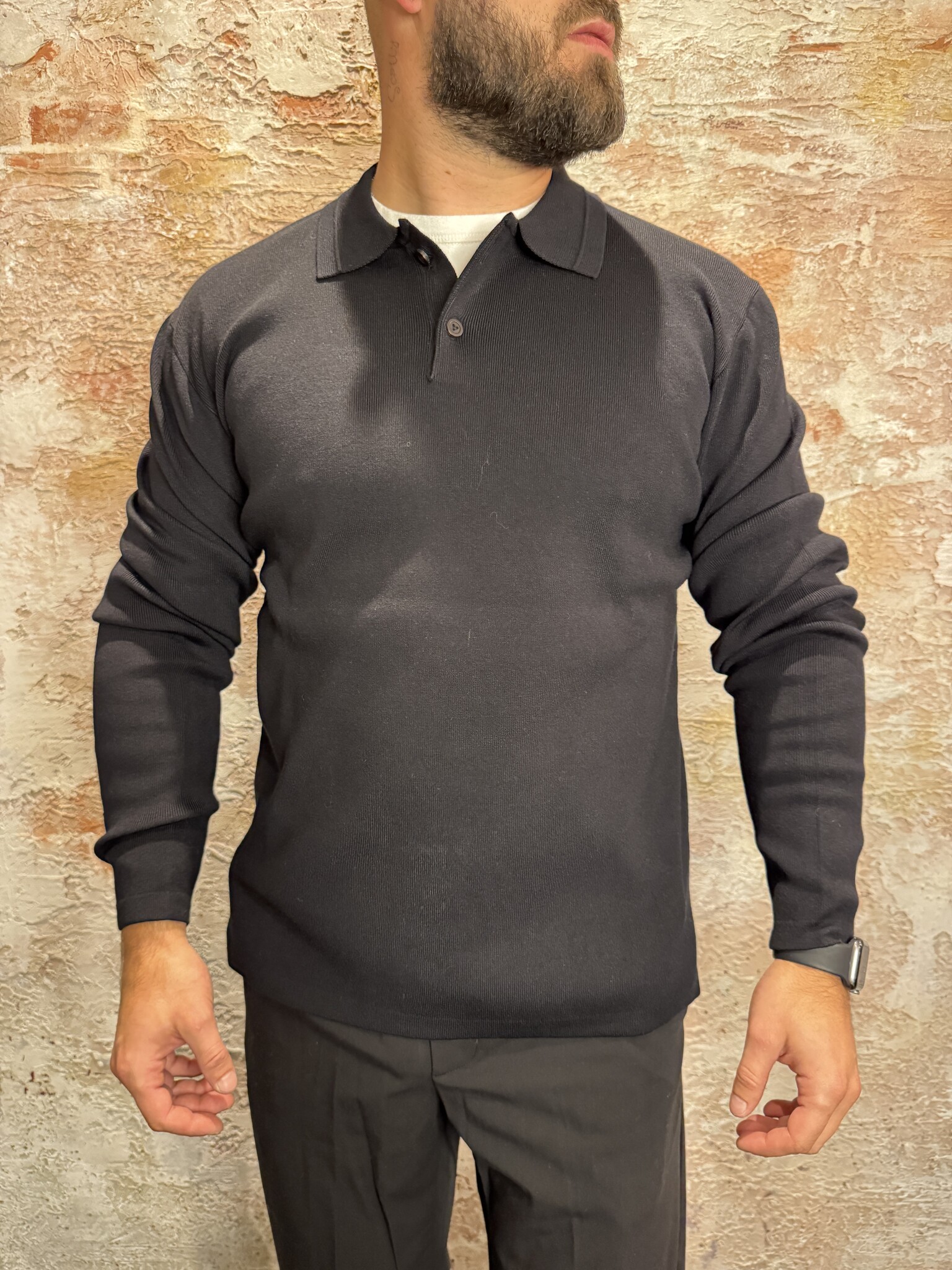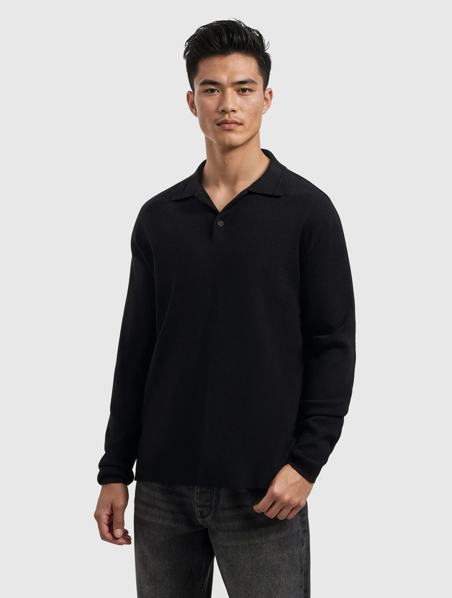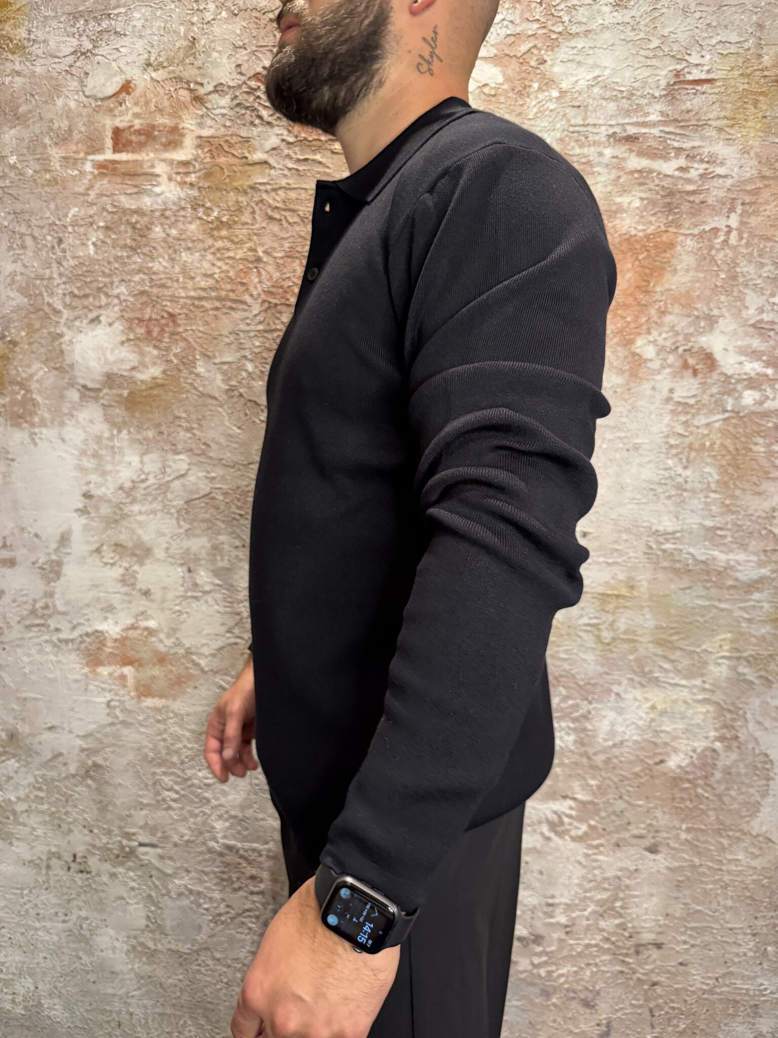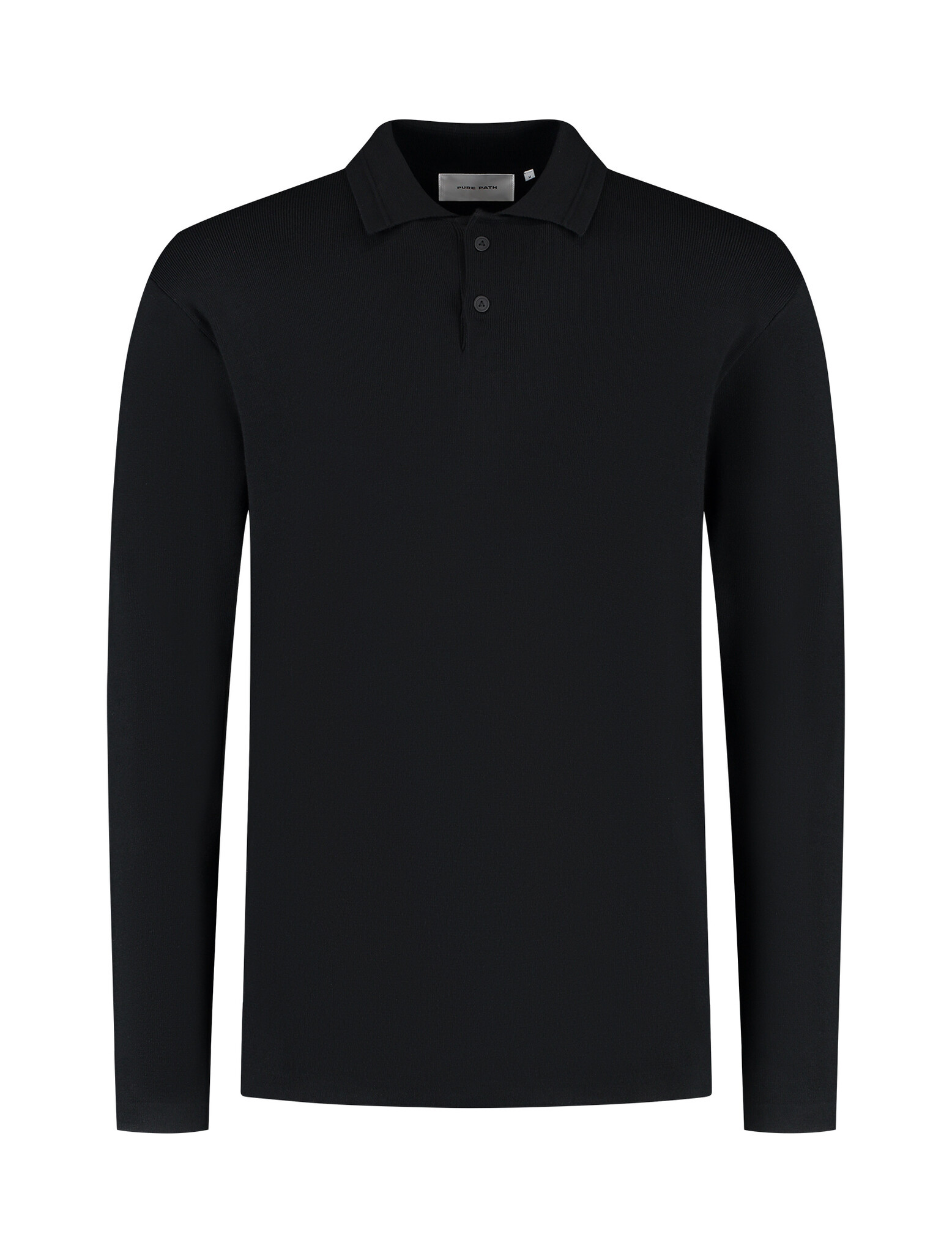 Pure Path Heavy Knit Polo Black. Luxe lange mouwen polo van zware knit kwaliteit in zwart. Comfortabel, stijlvol en modern. Perfect voor zowel casual als zakelijke outfits, een tijdloze essential voor iedere garderobe. Losvallend.