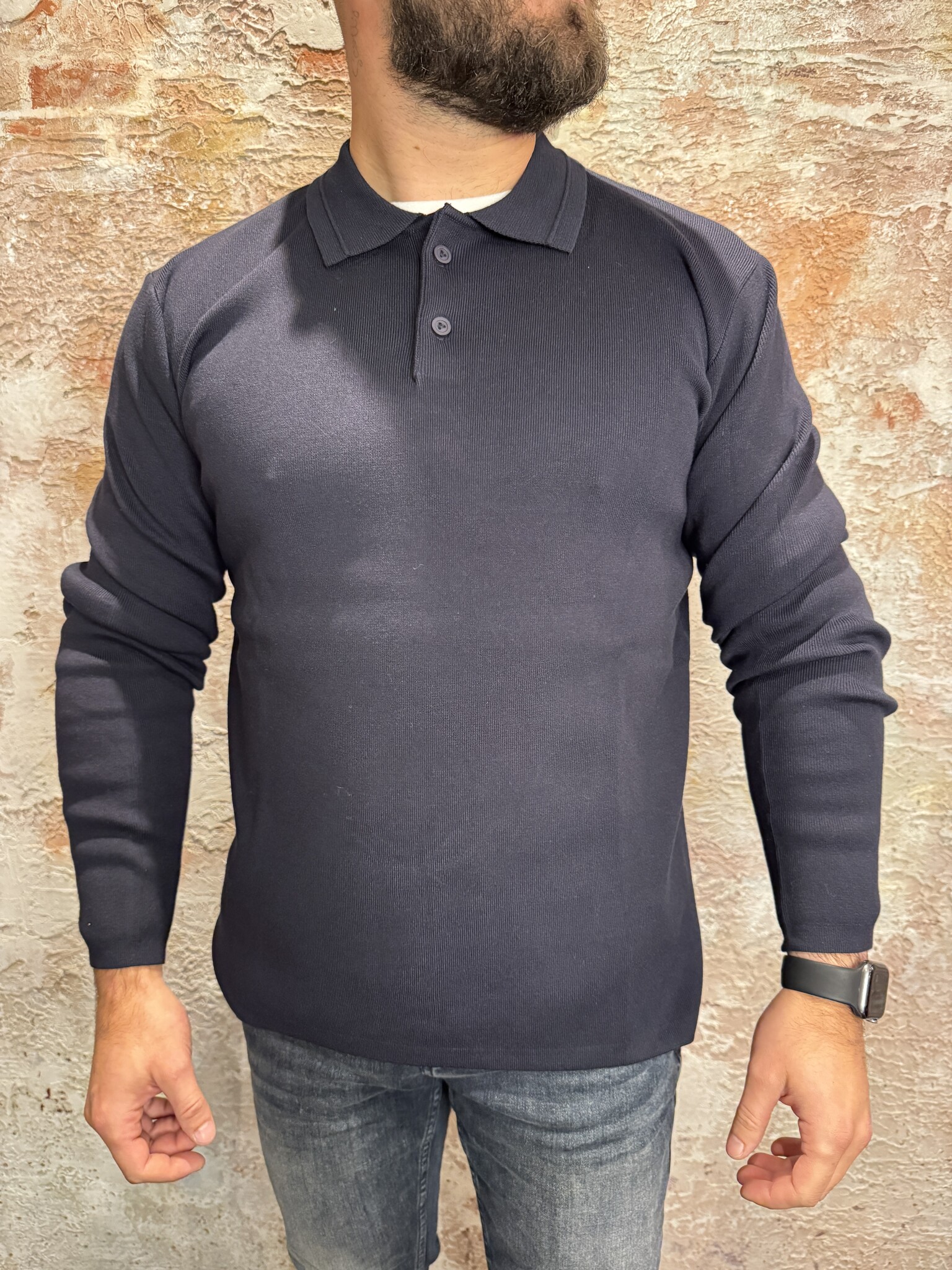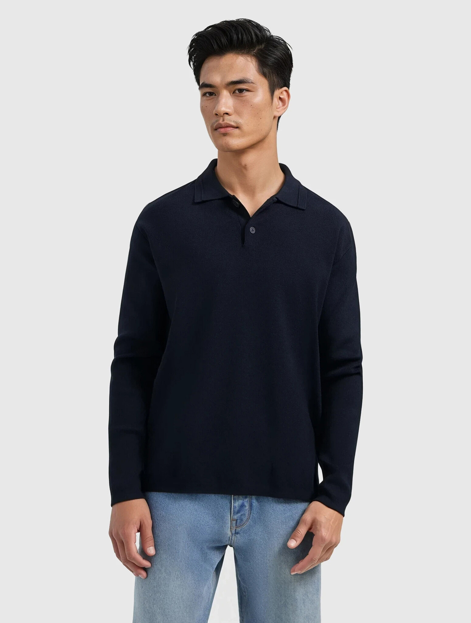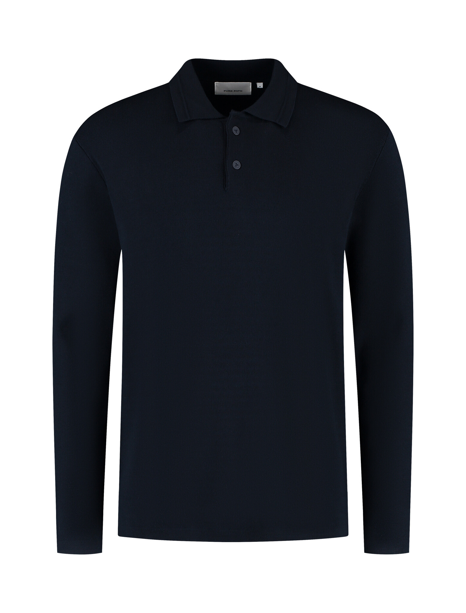 Pure Path Heavy Knit Polo Dark Navy. Luxe lange mouwen polo van zware knit kwaliteit in donkerblauw. Comfortabel, stijlvol en modern. Perfect voor zowel casual als zakelijke outfits, een tijdloze essential voor iedere garderobe. Losvallend.