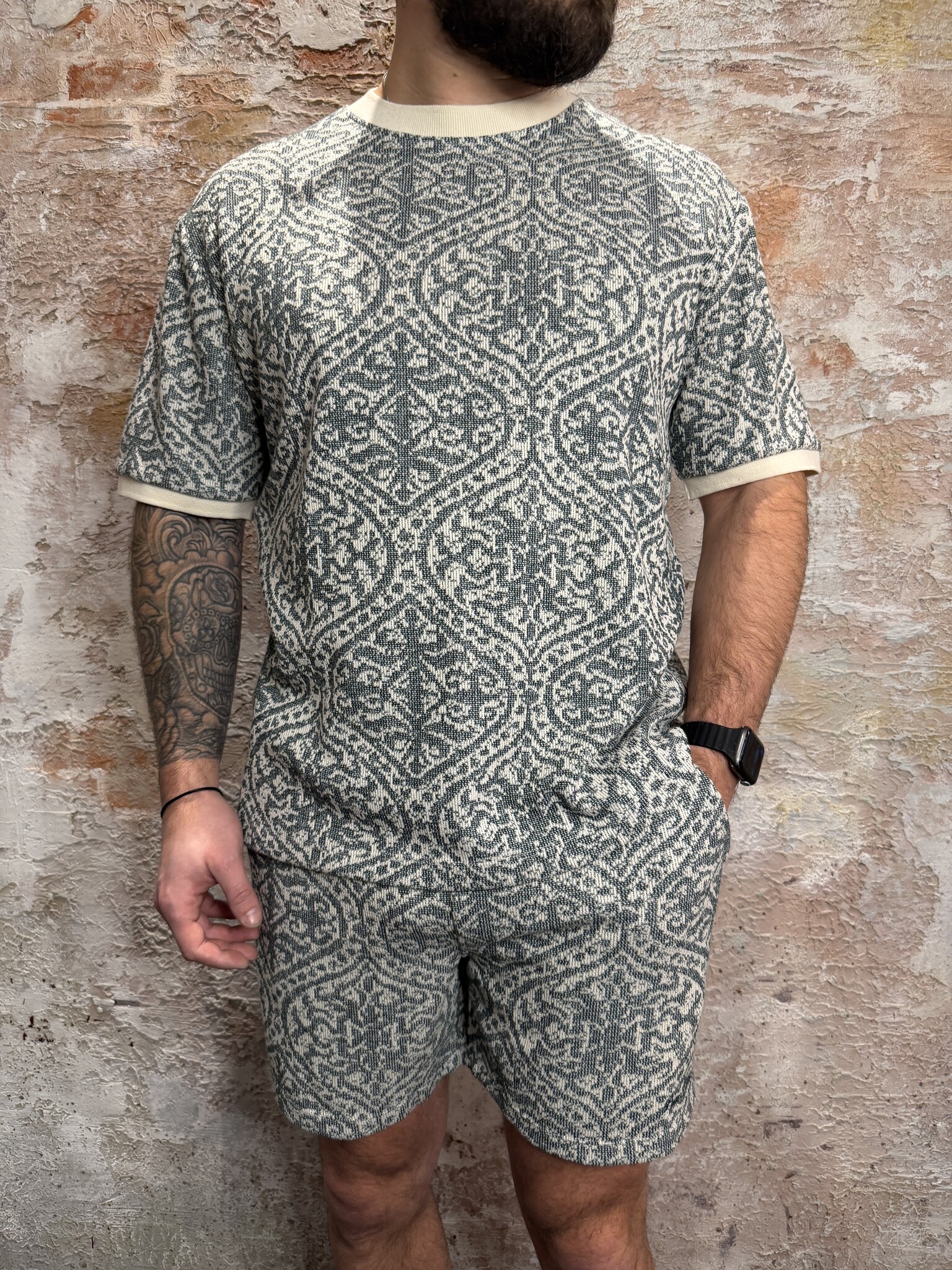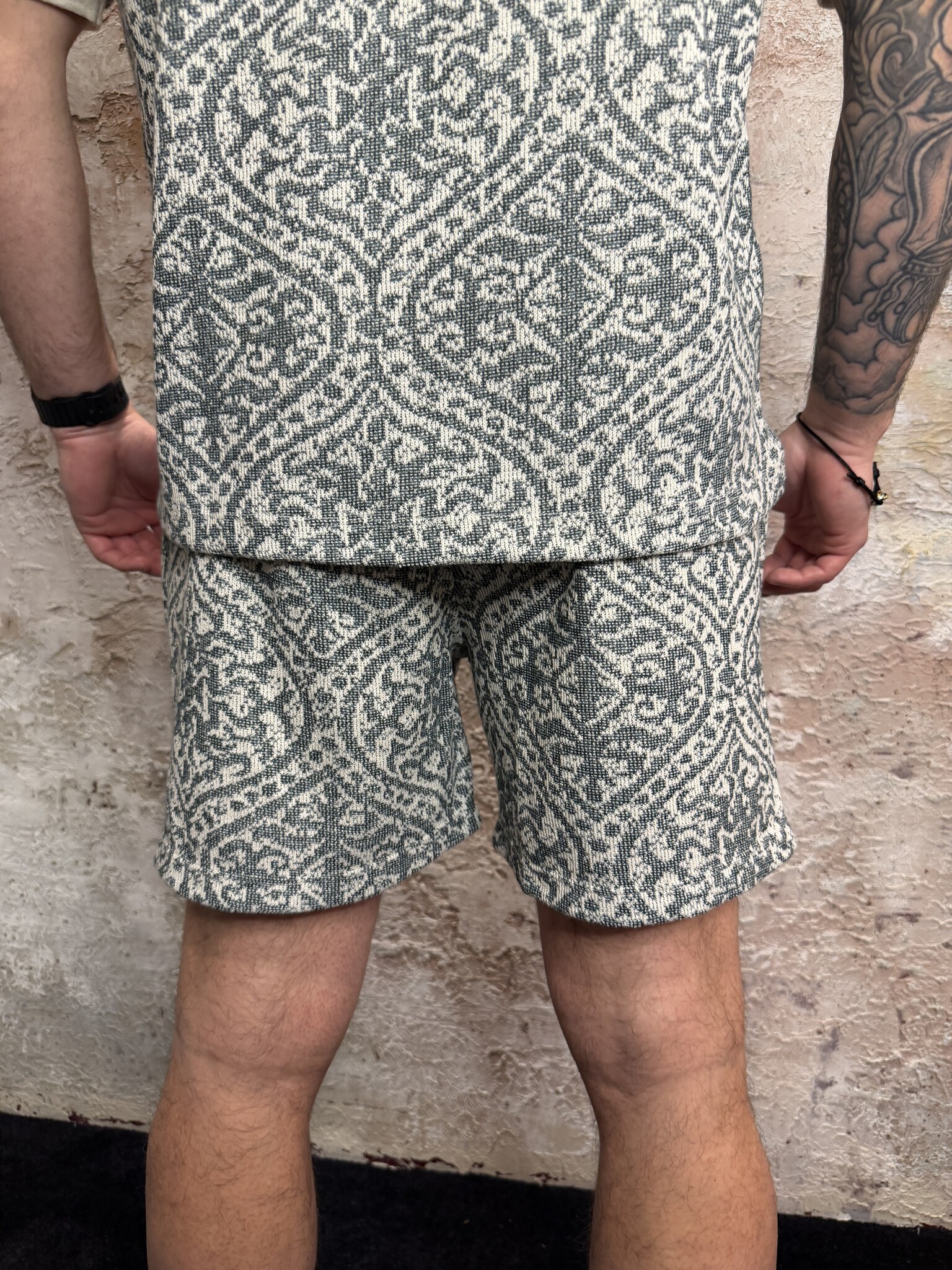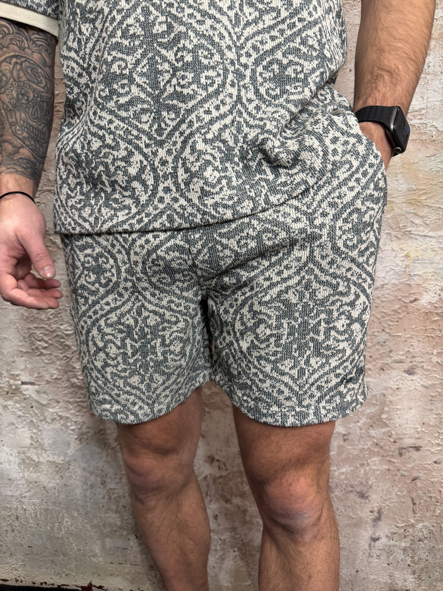 Stijlvolle Pure Path heren shorts met luxe jacquard patroon in emerald groen. Deze comfortabele zomer short voor heren heeft een zachte stof, moderne fit en unieke all-over print. Perfect te combineren met het bijpassende shirt voor een complete set