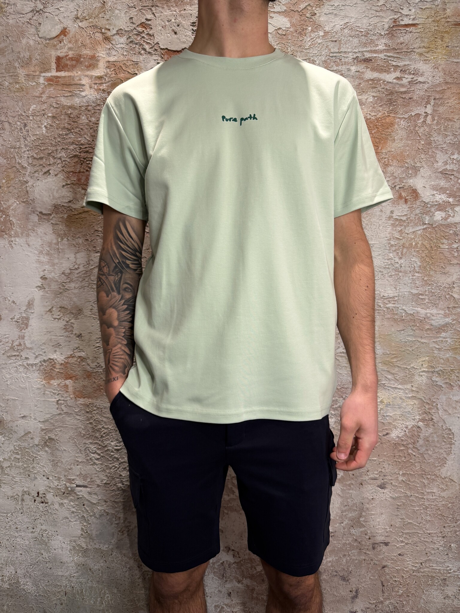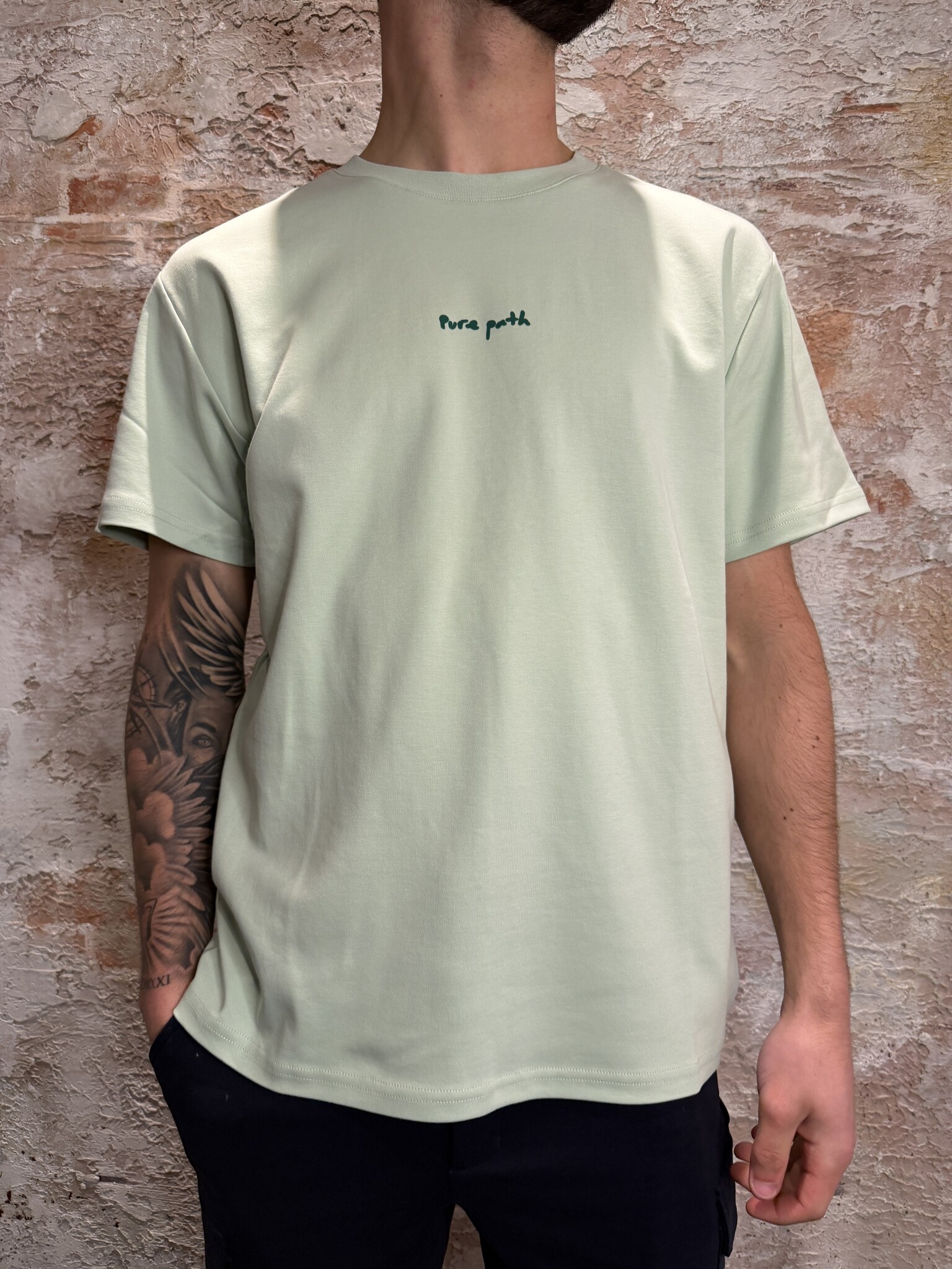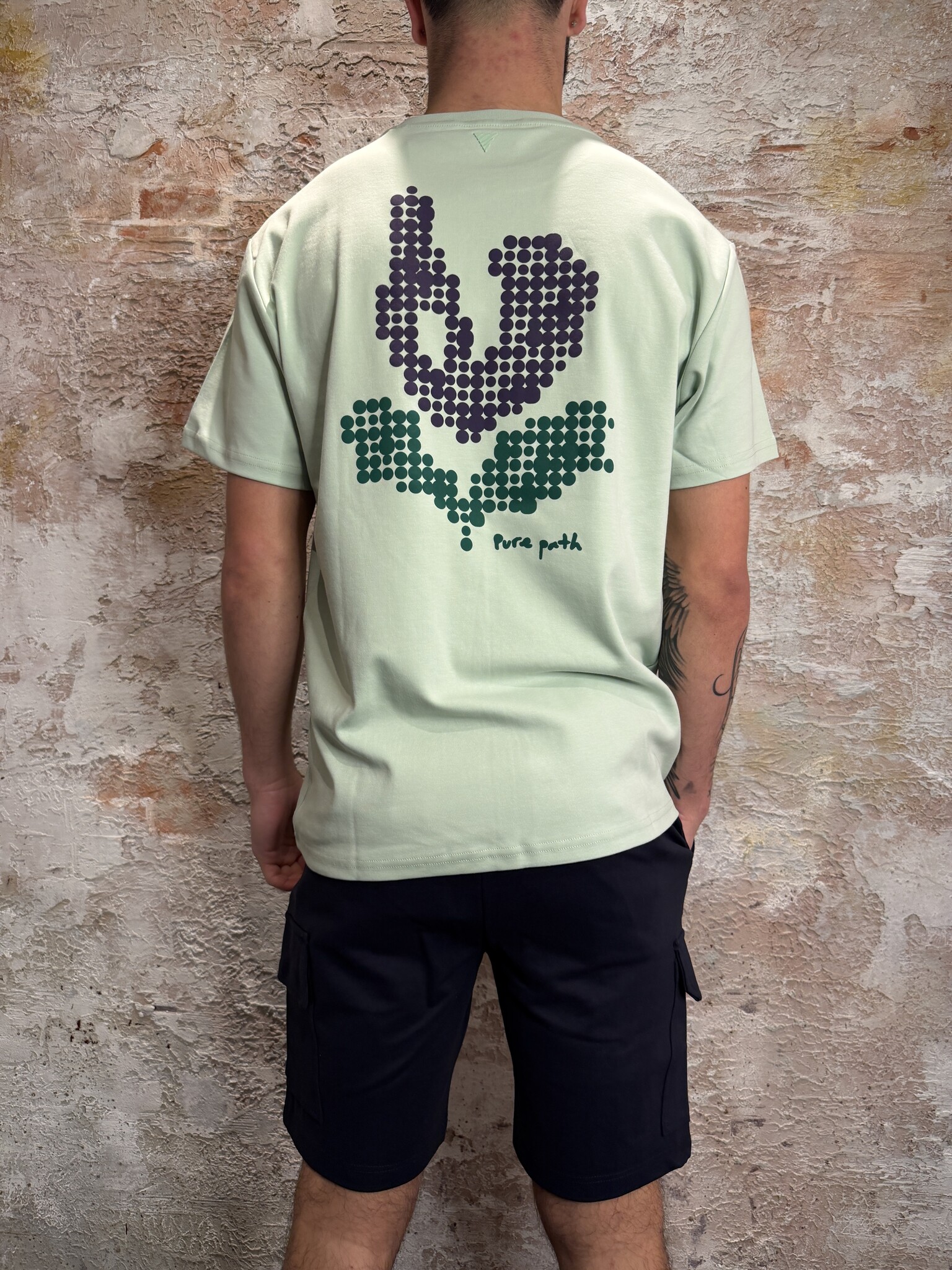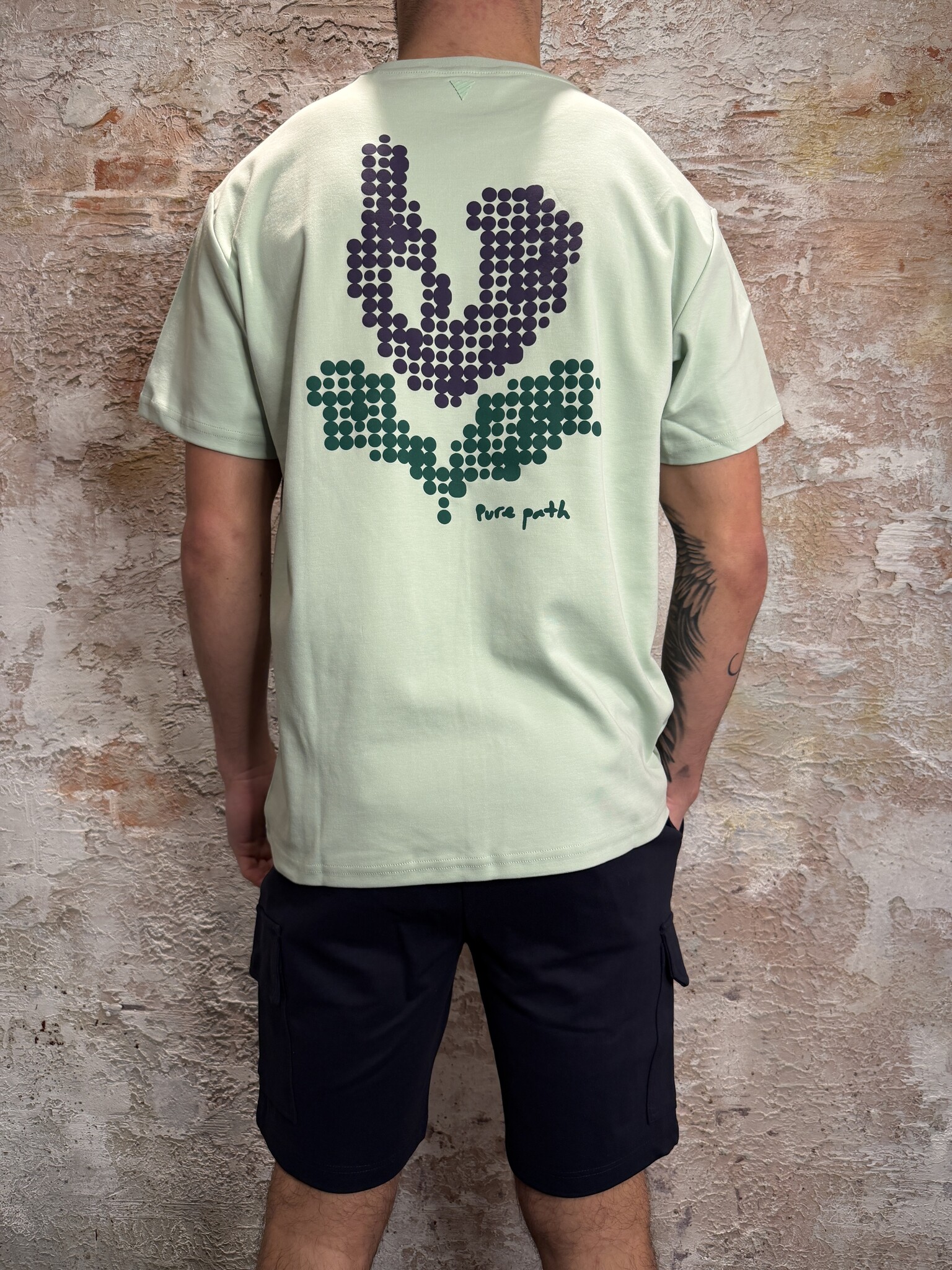 Pure Path Pixel Flower T-shirt licht groen met minimalistisch logo op de borst en opvallende pixel bloemenprint op de rug. Gemaakt van comfortabele kwaliteit met een moderne fit. Perfect voor een frisse, zomerse look met een stijlvolle uitstraling.