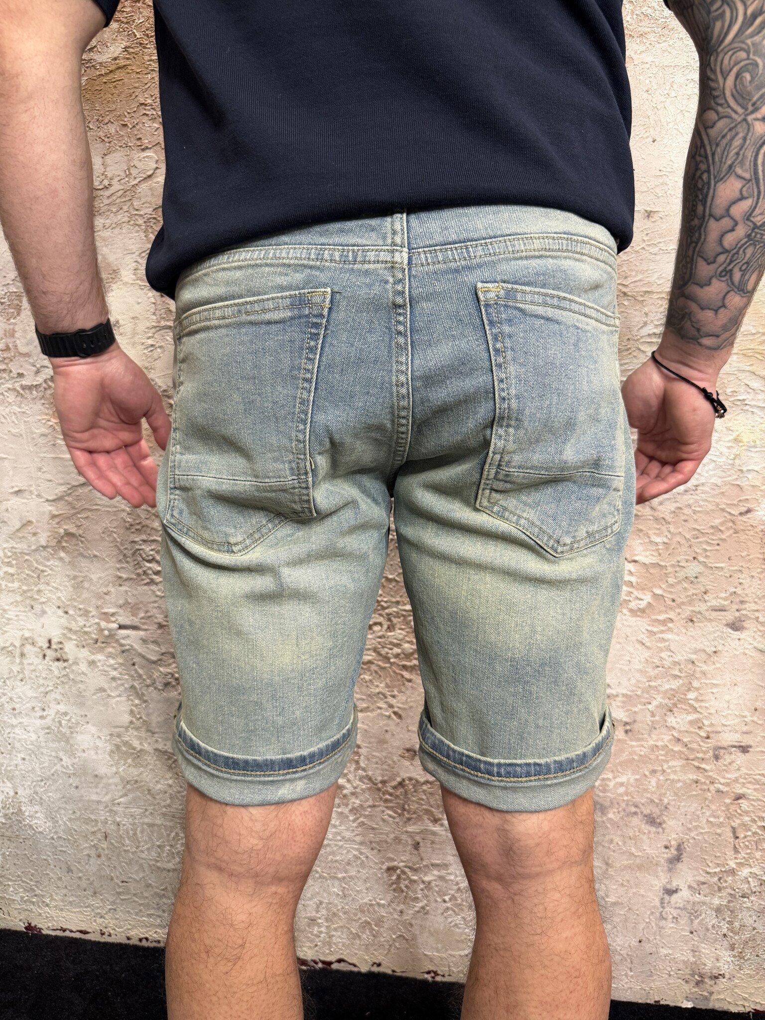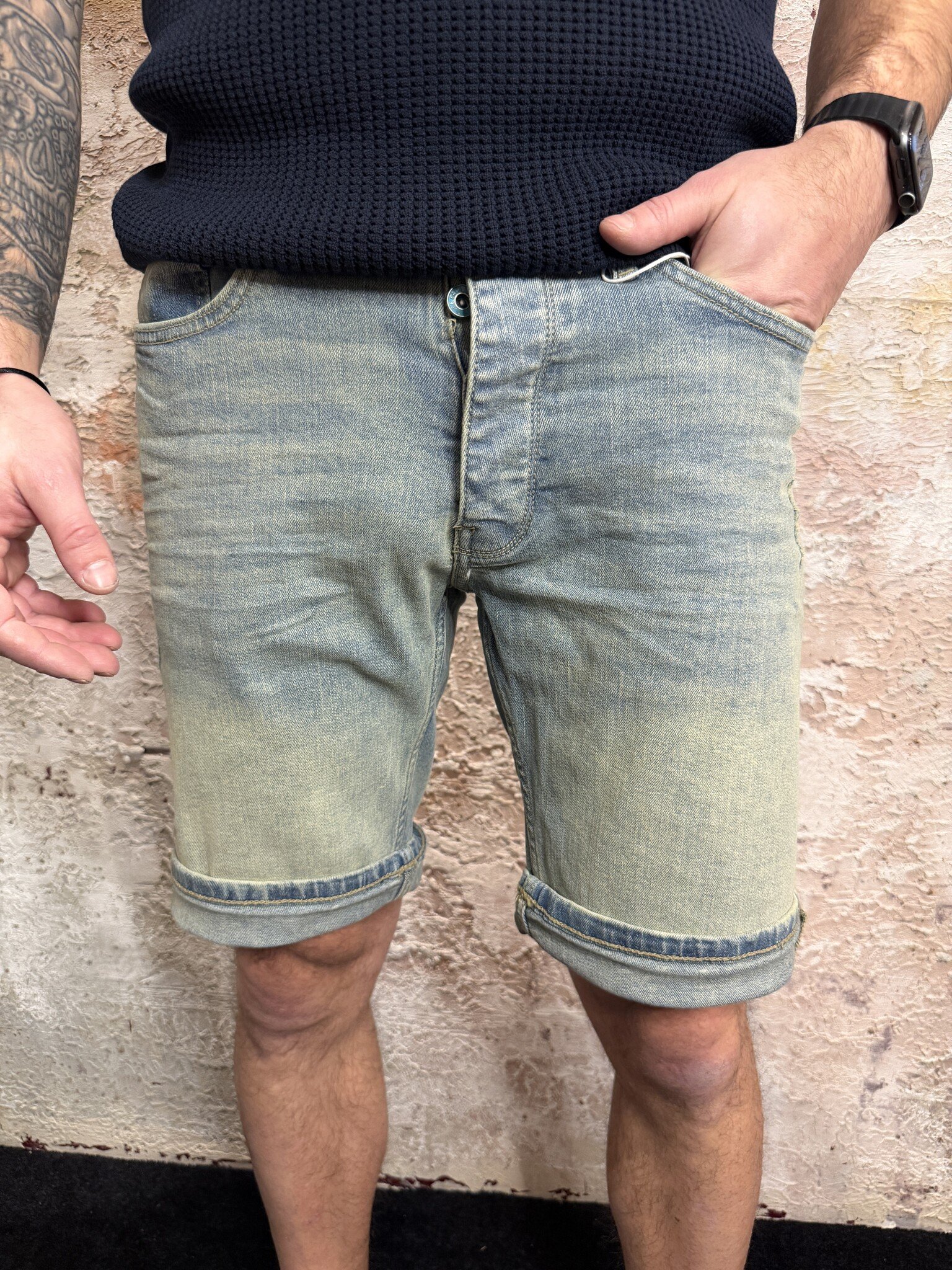 Pure Path heren denim short in unieke blue green wassing. De Miles short heeft een comfortabele slim fit, zachte stretch denim en omgeslagen pijpen. Perfecte zomer short voor heren die makkelijk combineert met T-shirts en polo’s voor een casual look.
