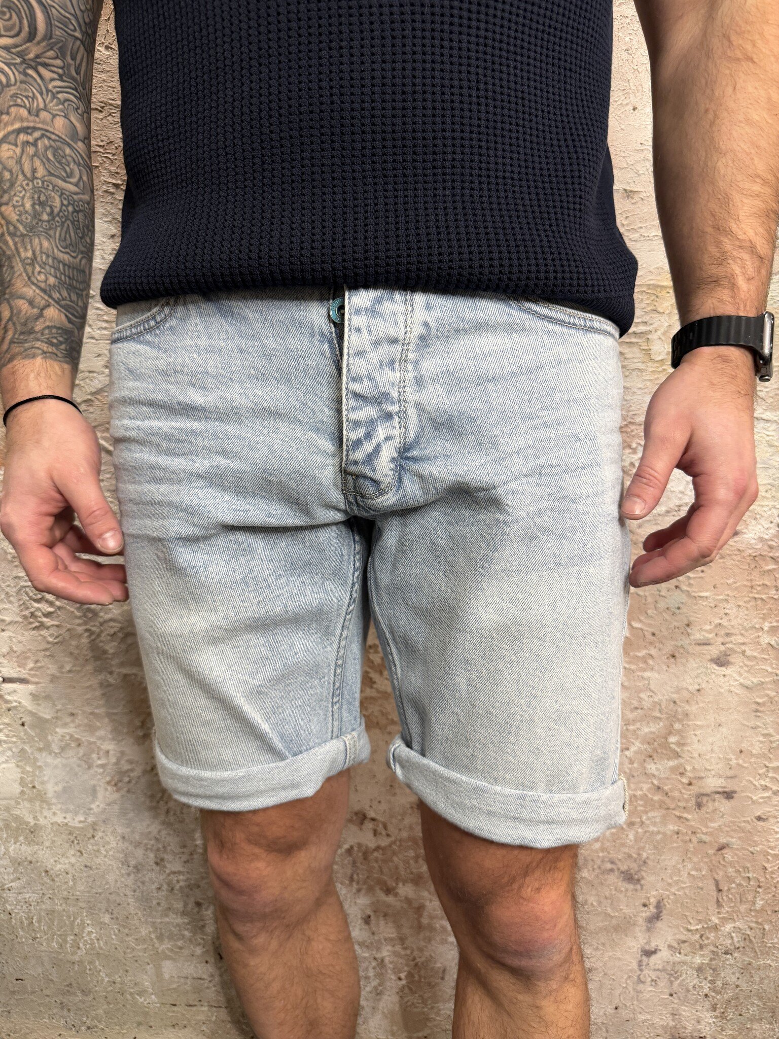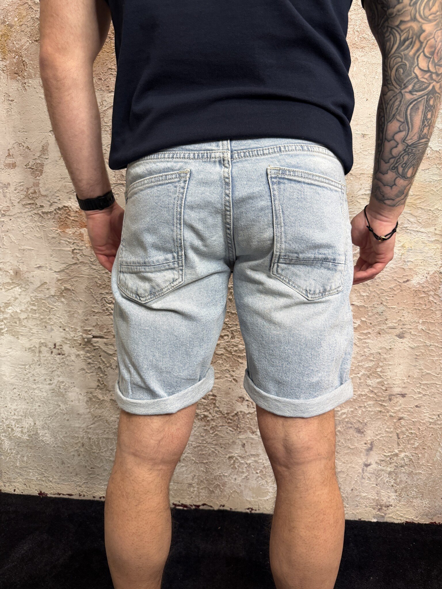 Pure Path heren denim short in een licht blauwe wassing. De Miles short heeft een comfortabele slim fit, zachte stretch denim en omgeslagen pijpen. Perfecte zomer short voor heren die makkelijk combineert met T-shirts en polo’s voor een casual look.