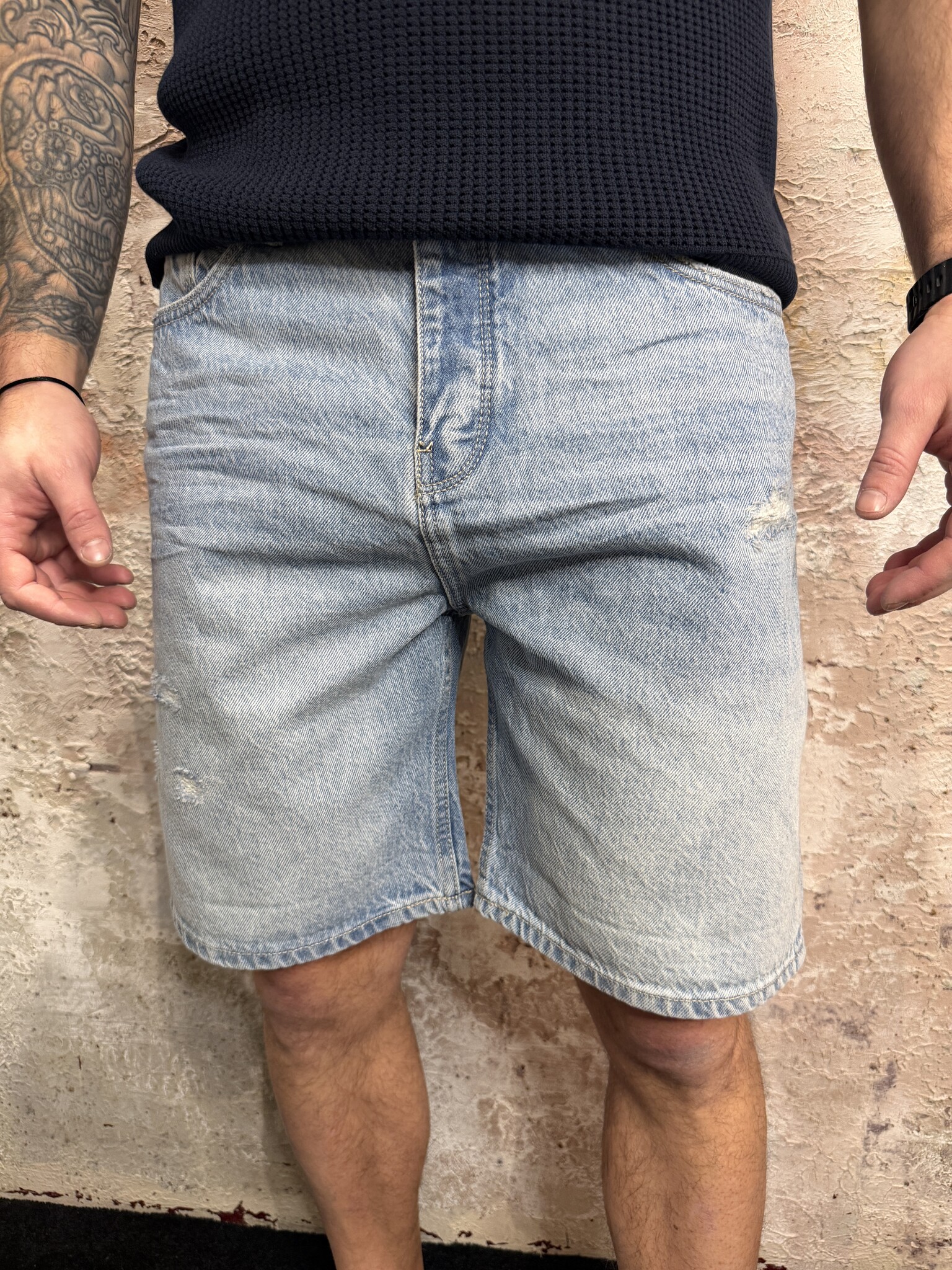 Stoere Pure Path heren denim short in lichtblauwe wassing. De Owen short heeft een comfortabele regular fit, subtiele destroyed details en zachte denim kwaliteit. Perfecte zomer short voor heren die makkelijk te combineren is met T-shirts en polo’s.