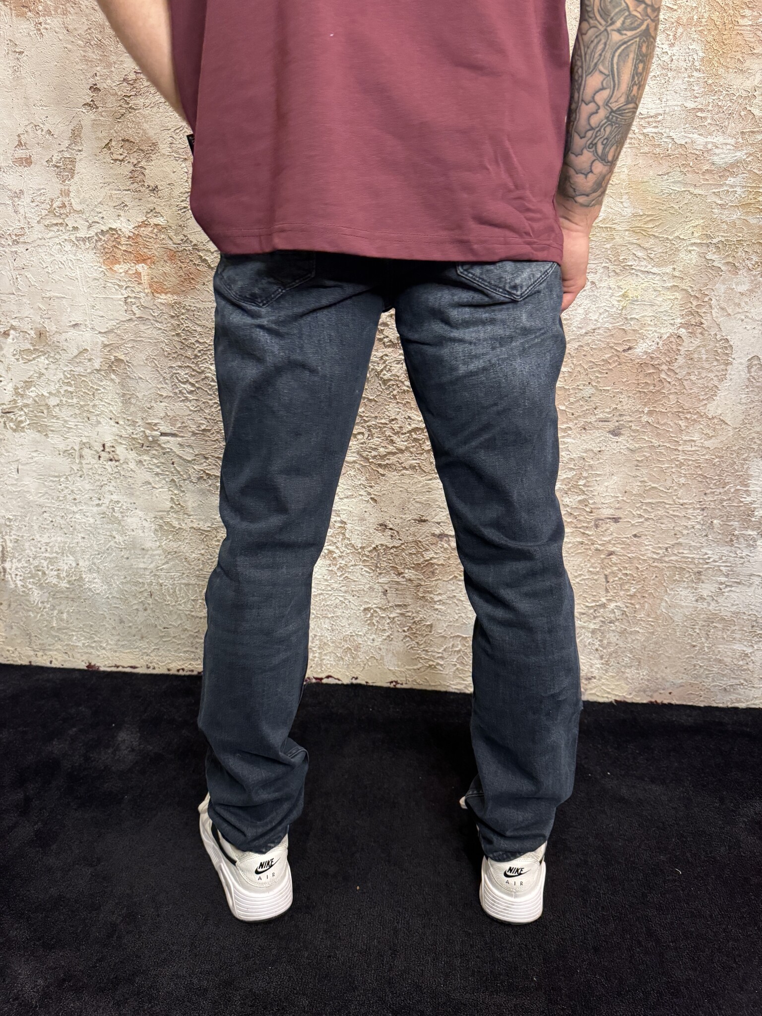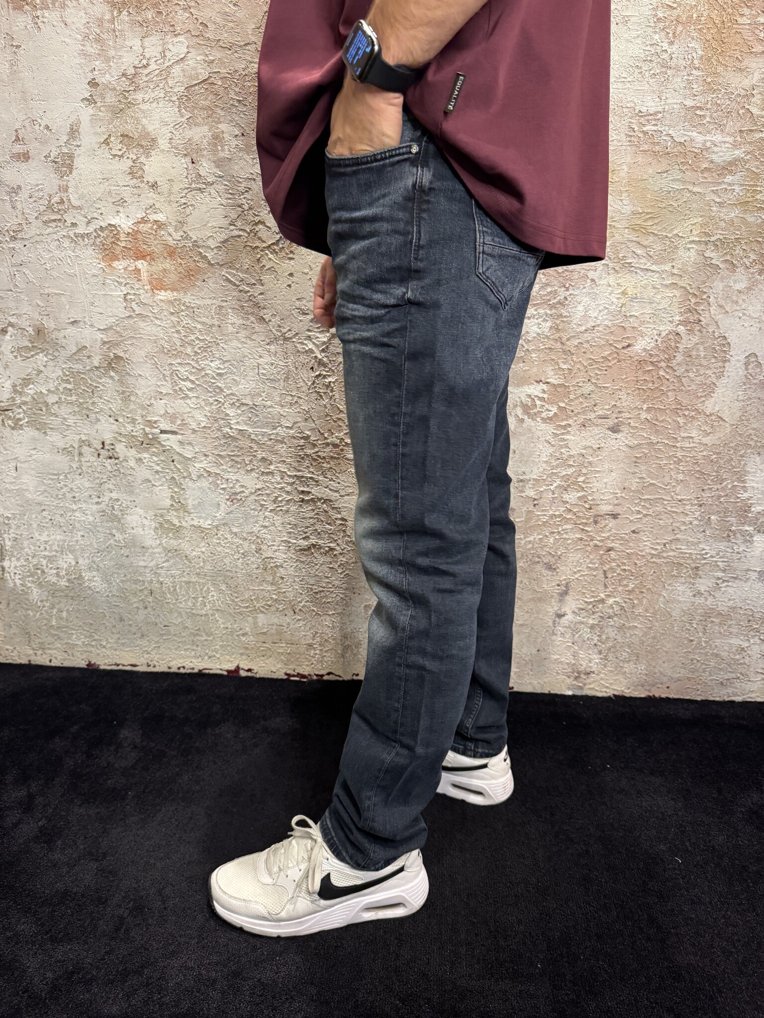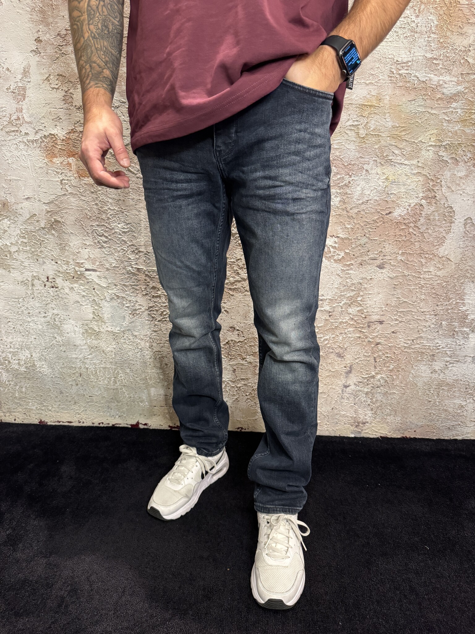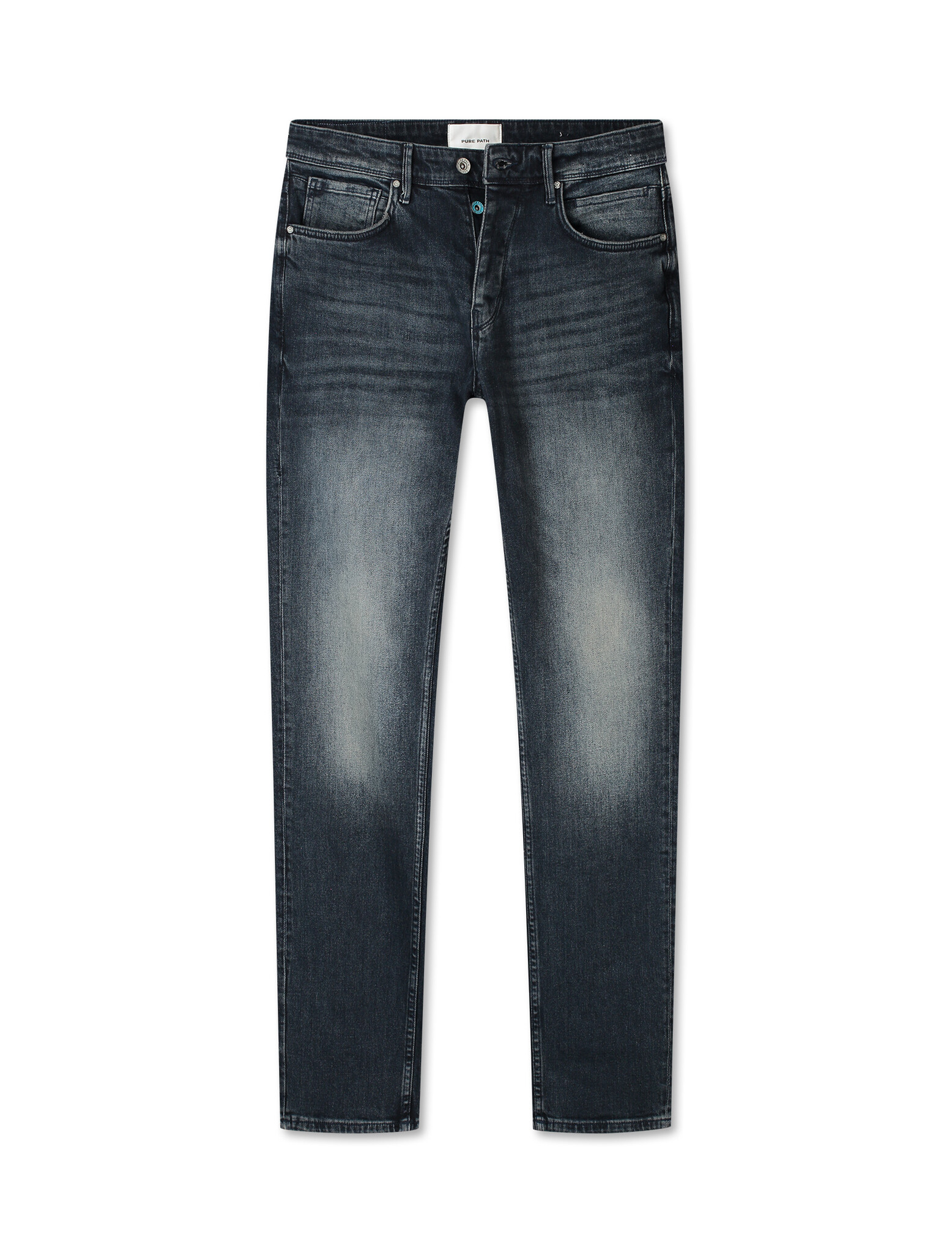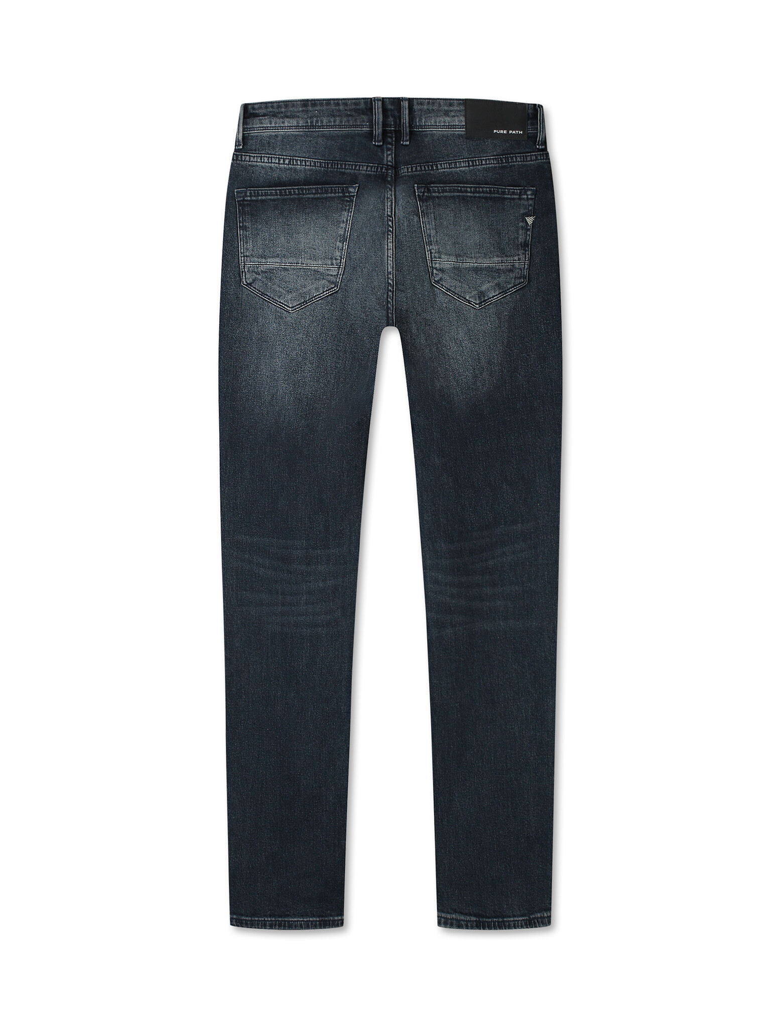 Pure Path The Ryan Dark Blue W3008: Donkerblauwe slim fit jeans met subtiele faded en whisker details voor een authentieke look. Gemaakt van stretchdenim voor comfort en bewegingsvrijheid. Tijdloze stijl, ideaal voor zowel casual als nette outfits.
