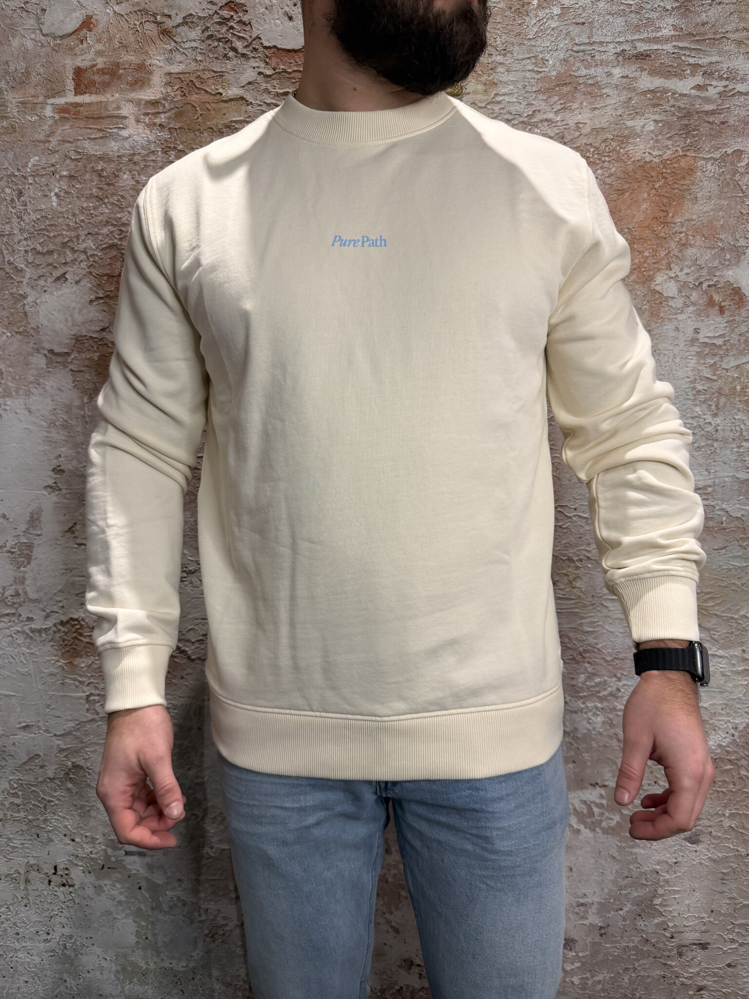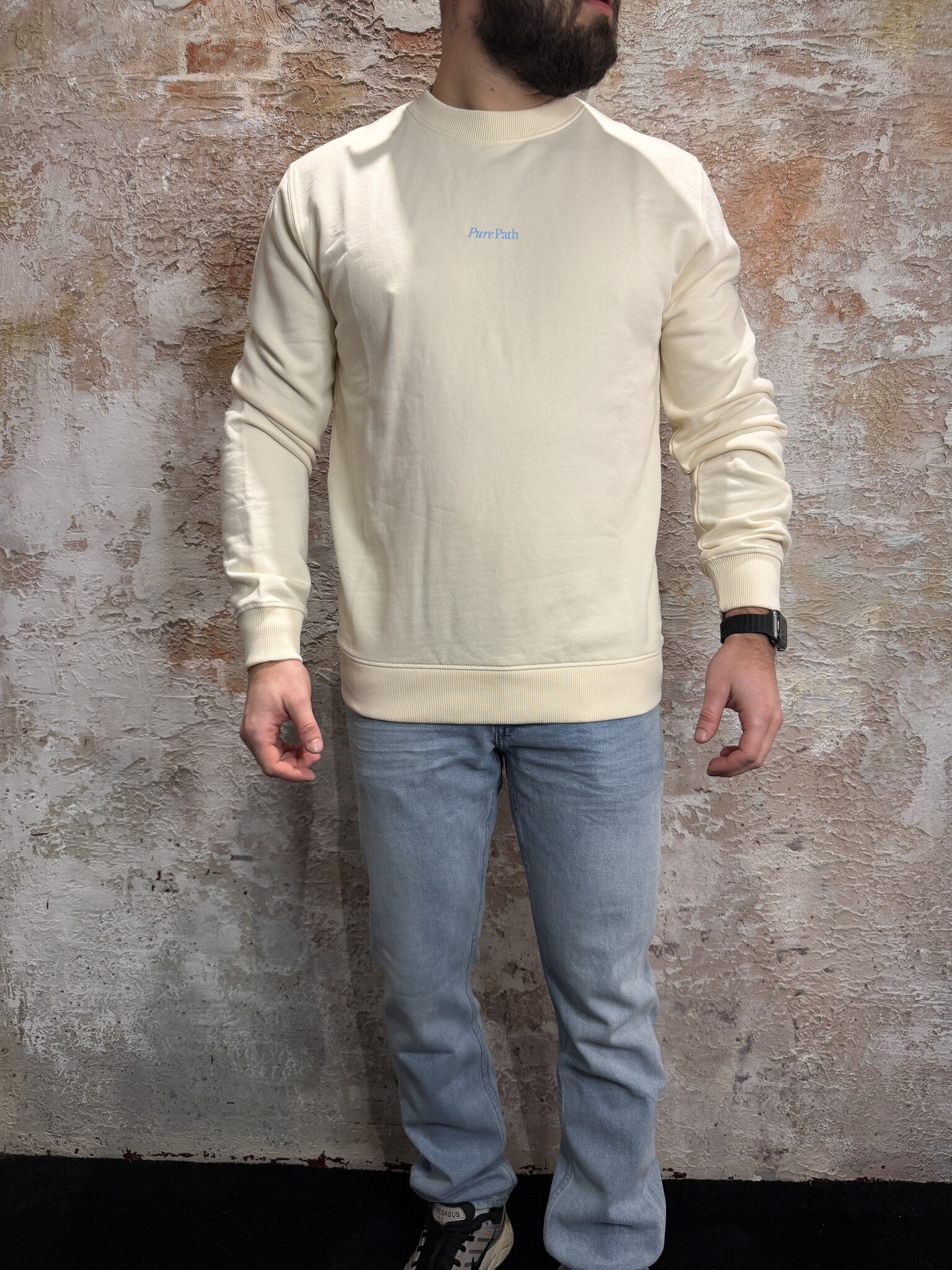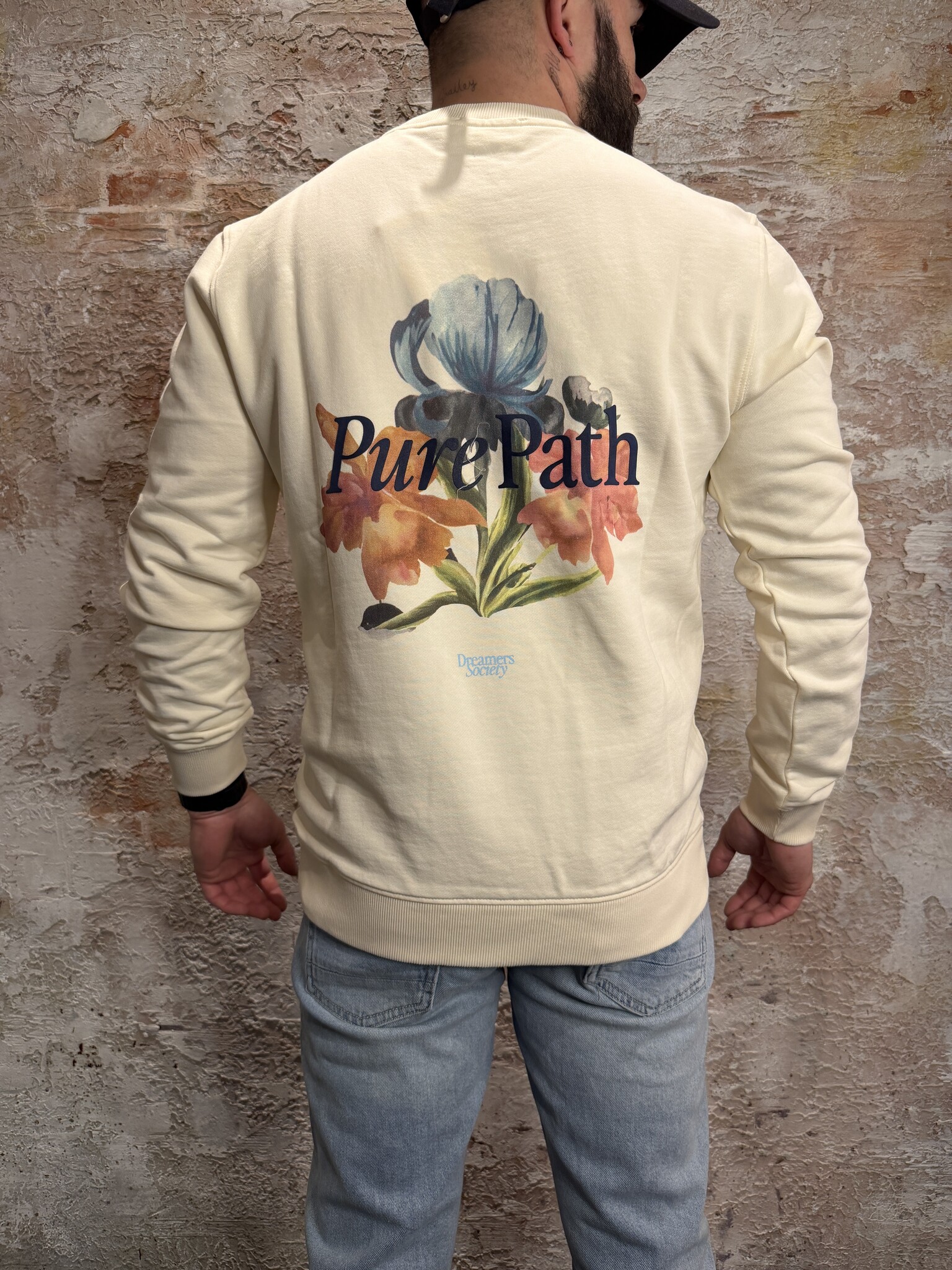Stijlvolle Pure Path heren sweater in ecru met opvallende bloemen backprint en subtiel logo op de borst. Deze comfortabele crewneck sweater voor heren heeft een moderne fit en zachte kwaliteit. Perfect voor een casual streetwear look.