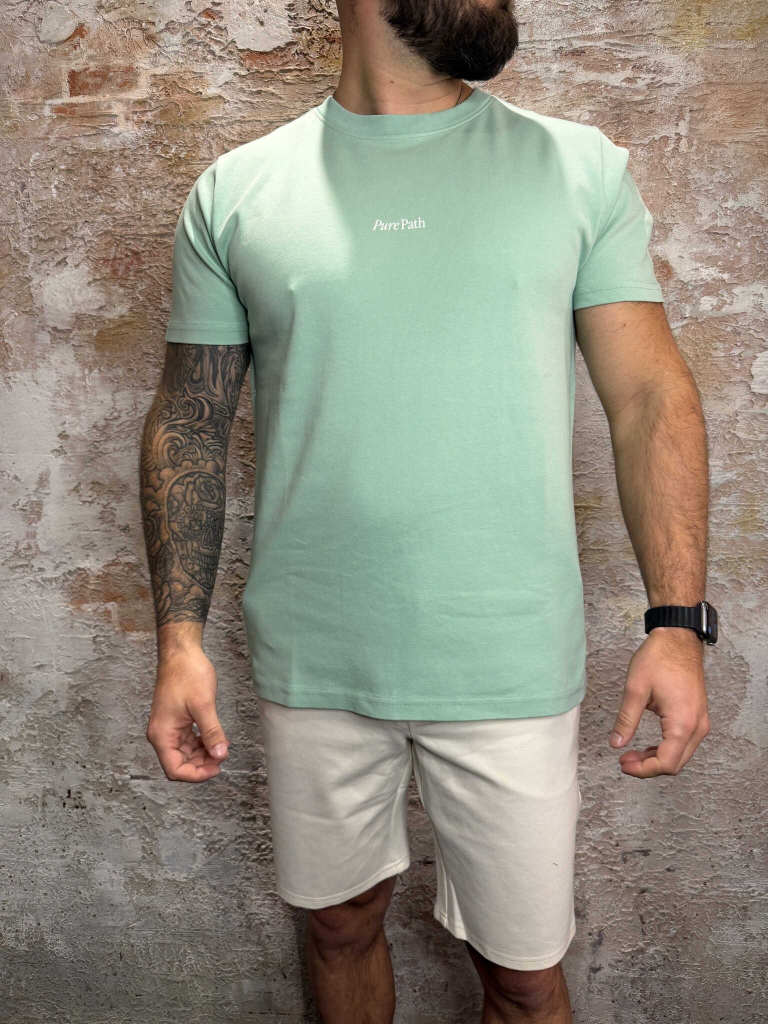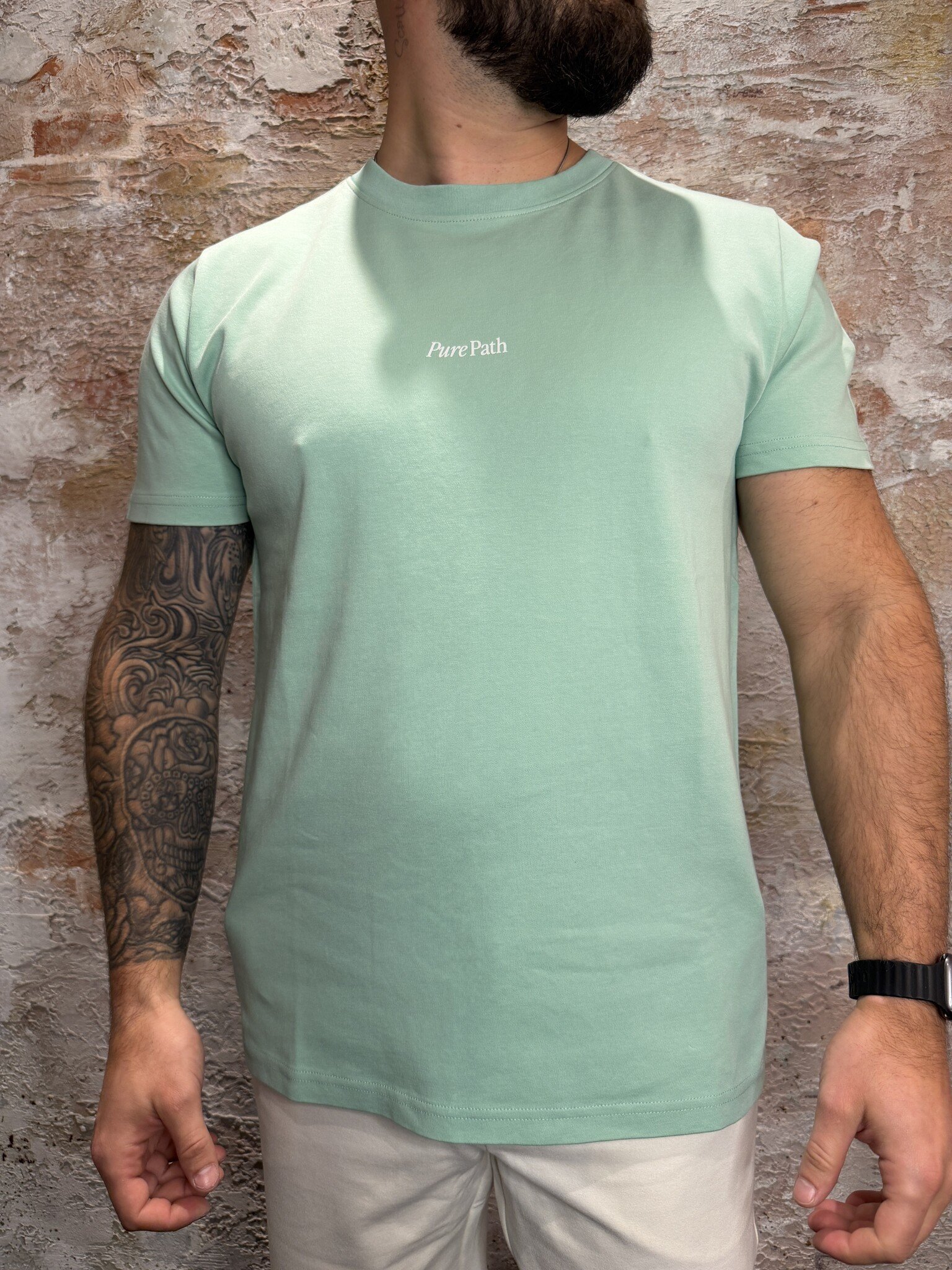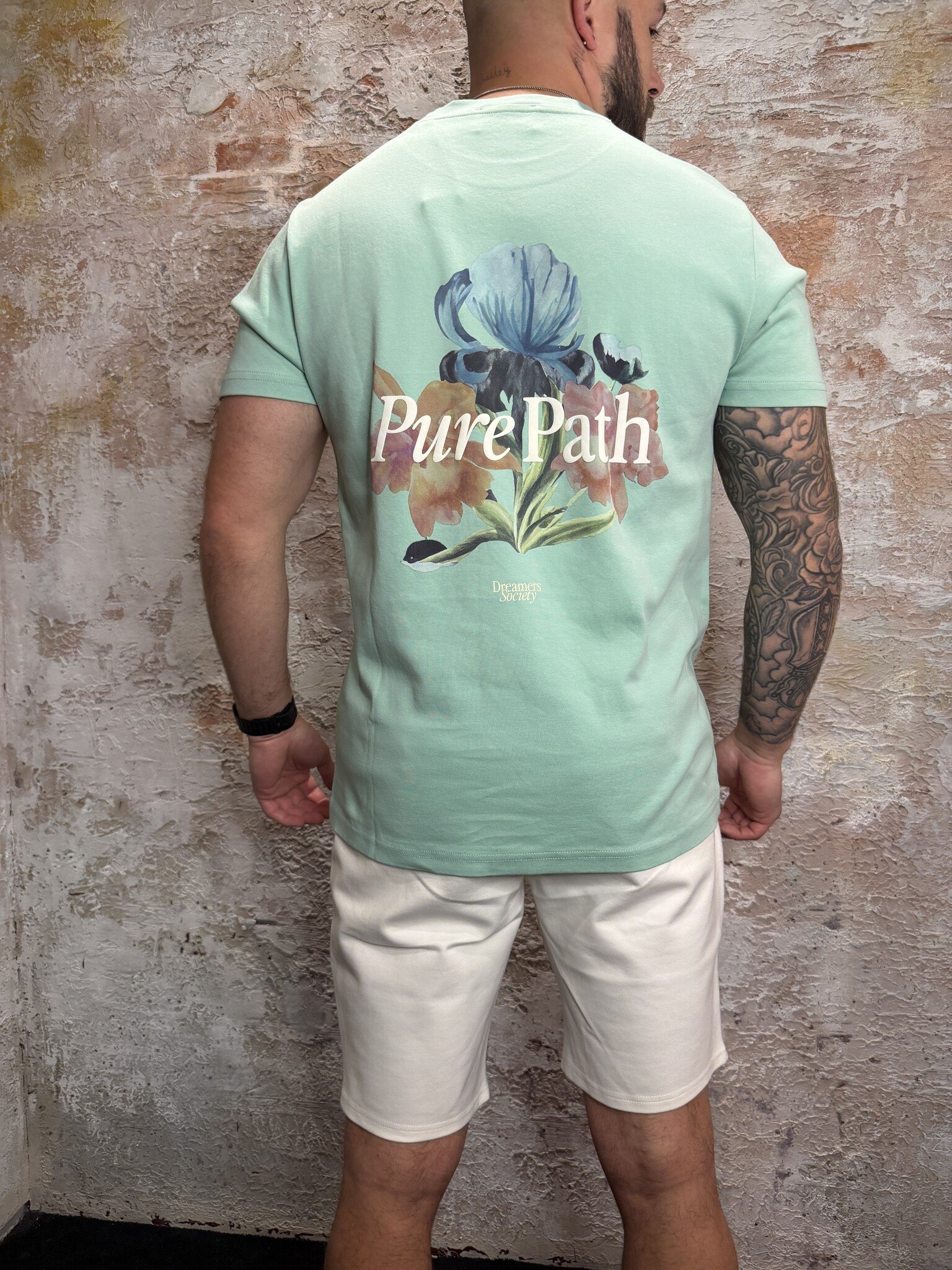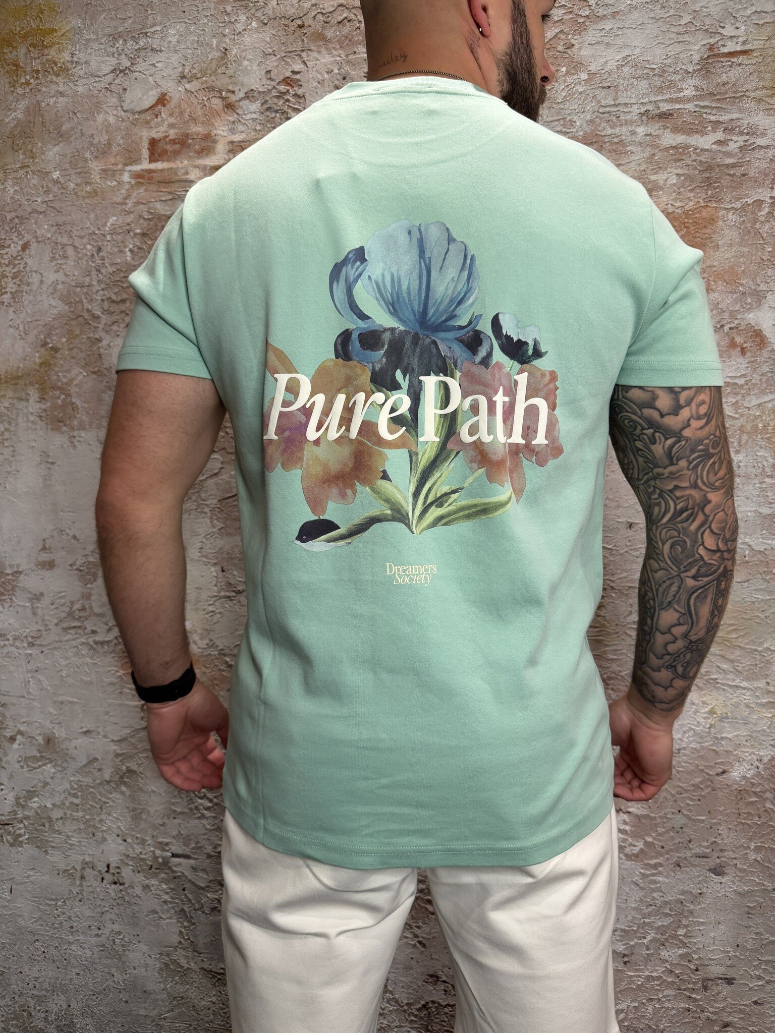 Pure Path Trio of Flowers T-shirt Mint met subtiel logo op de borst en grote bloemenprint op de rug. Comfortabele pasvorm en zachte katoenkwaliteit. Tijdloze groene kleur, perfect te combineren met shorts of jeans. Stijlvol en casual voor zomerse outfits.