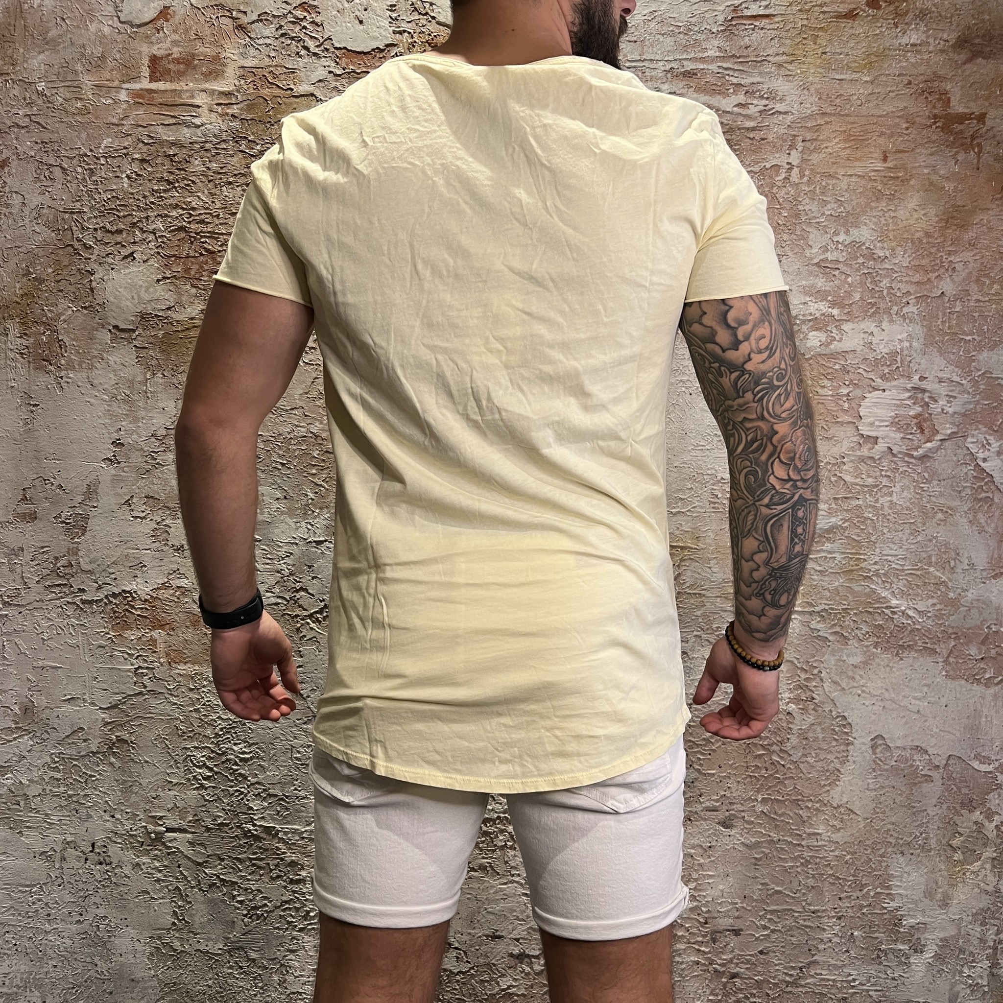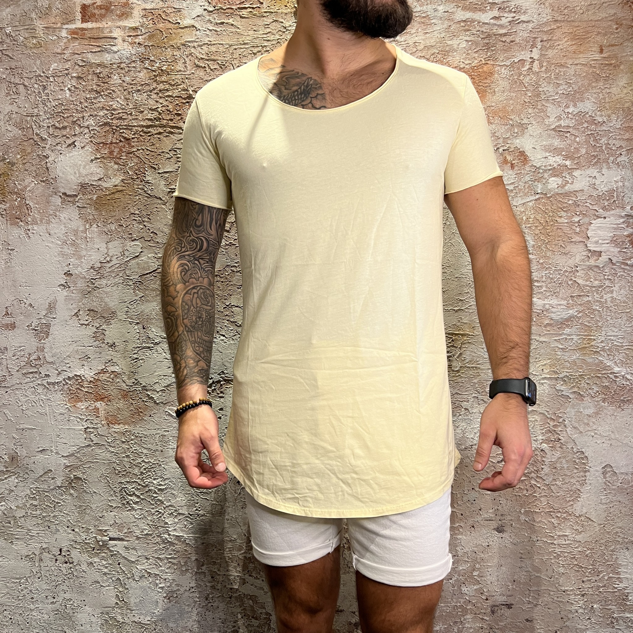 Diepe ronde hals t-shirt van Purewhite in geel, ons model draagt een S.