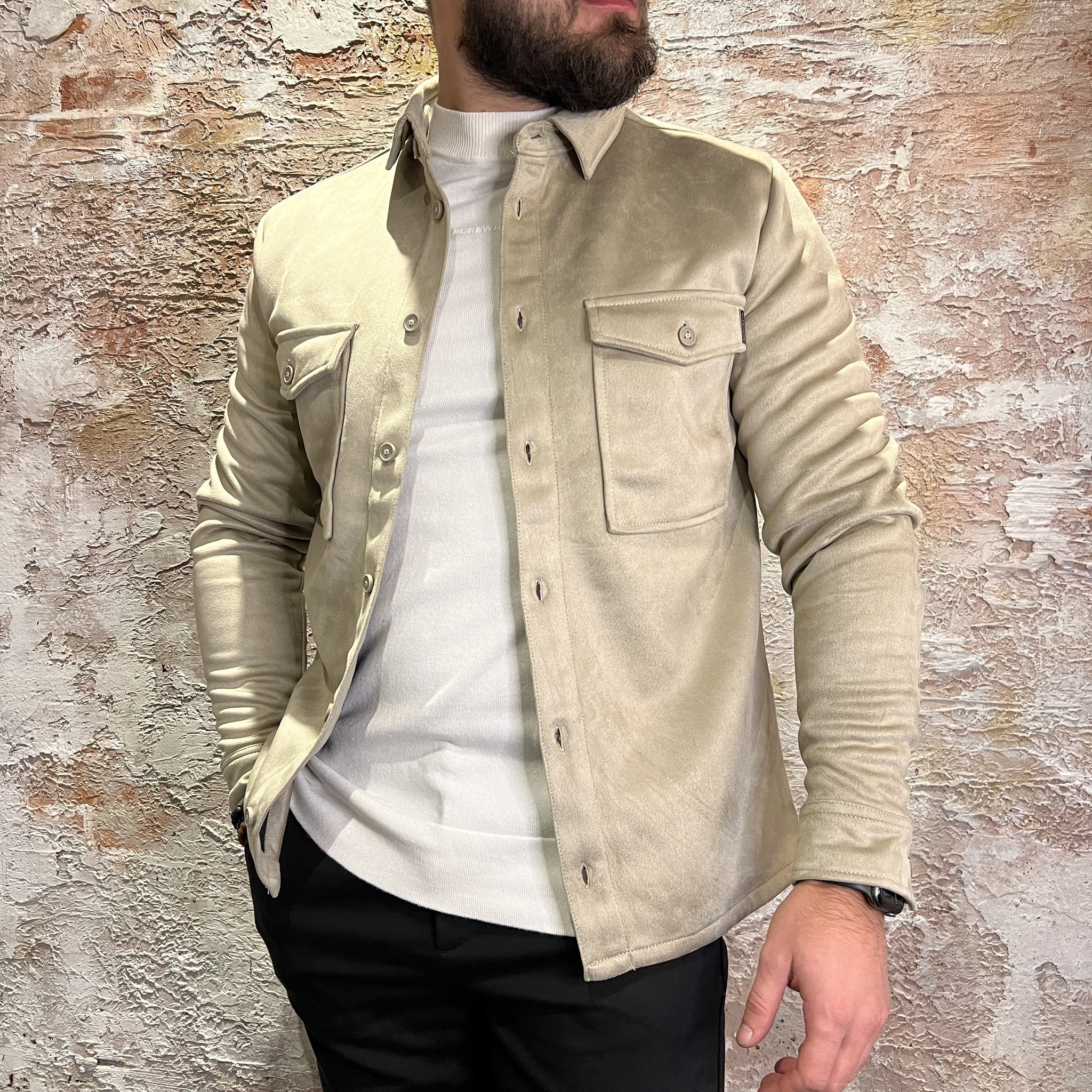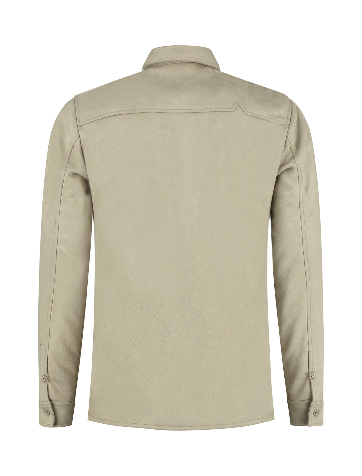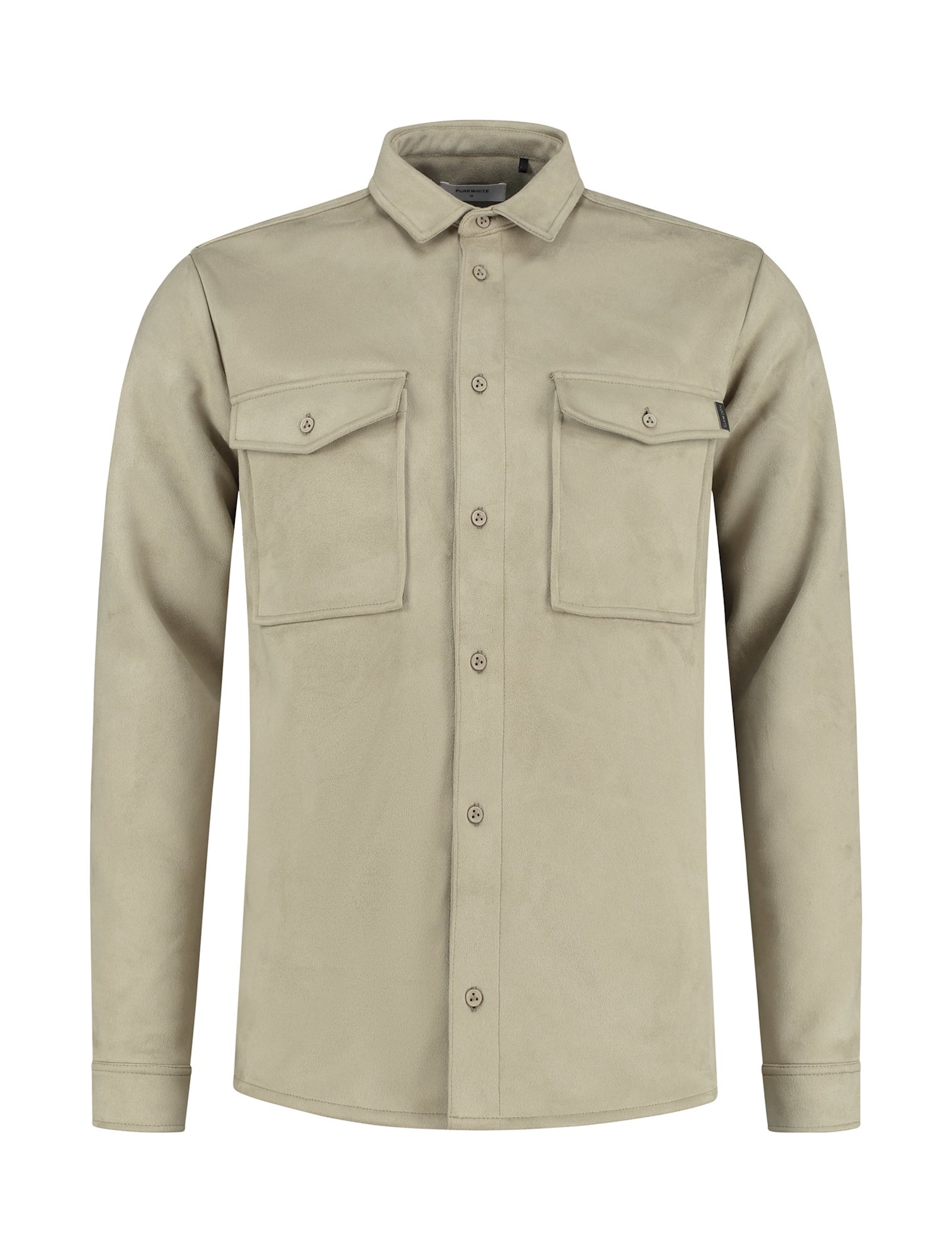 Suede look overshirt van Purewhite in taupe, de sluiting is dmv knoopjes, ons model draagt een maat small, het shirt is niet oversized!