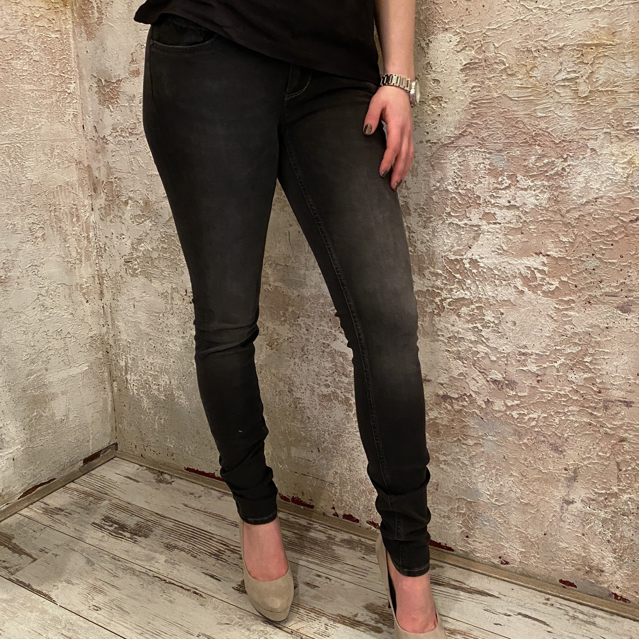 Dames skinny fit jeans, medium high, van Purewhite, uitgevoerd in een zwarte denim kwaliteit met stretch. Het 5-pocket model is voorzien van riemlussen en een rits- met knoopsluiting. De jeans heeft een wassing.