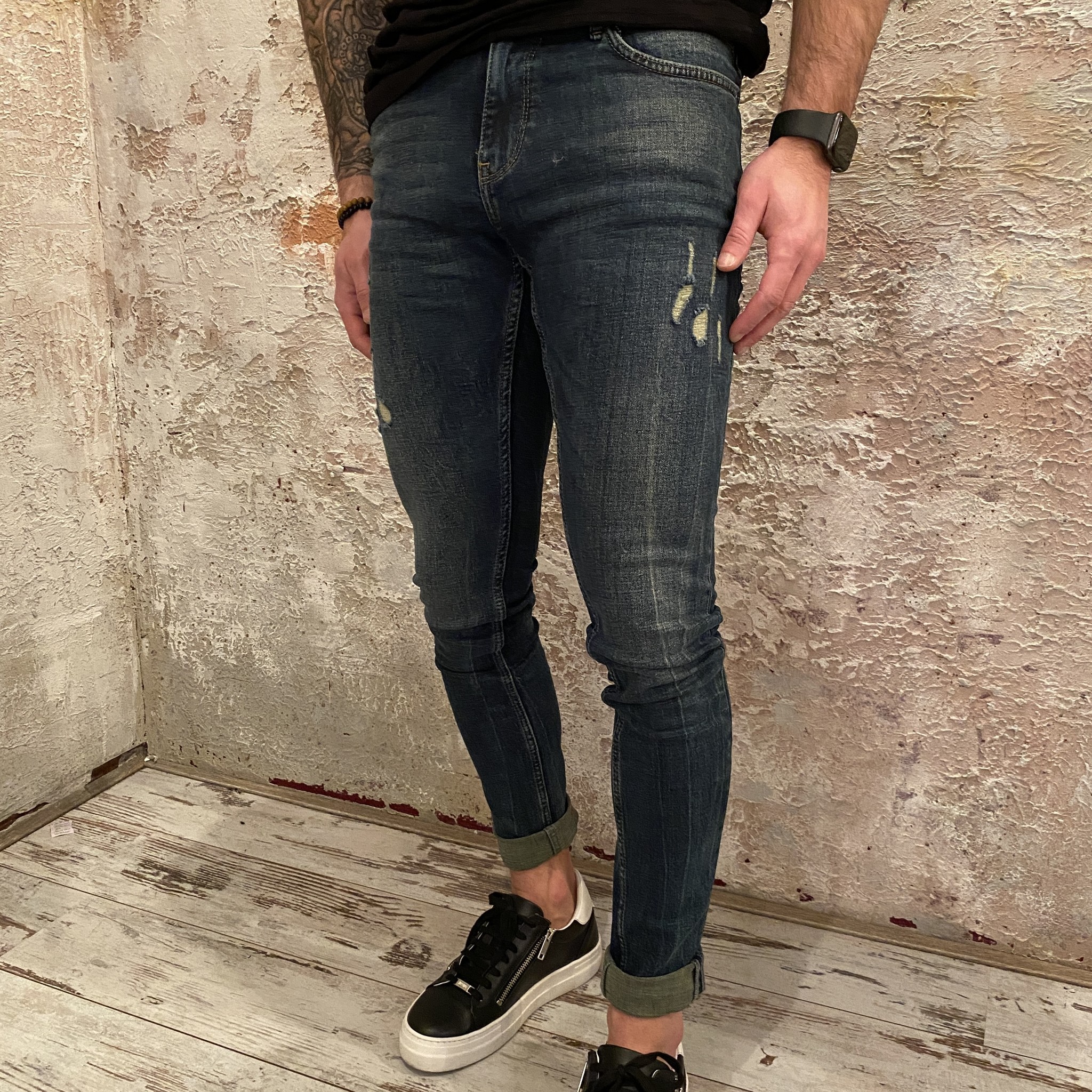 Herenjeans van Purewhite. Een 5-pocketmodel met een skinny fit en veel stretch. De jeans heeft verwassingen en aangebrachte beschadigingen op de broekspijpen en sluit met een rits.