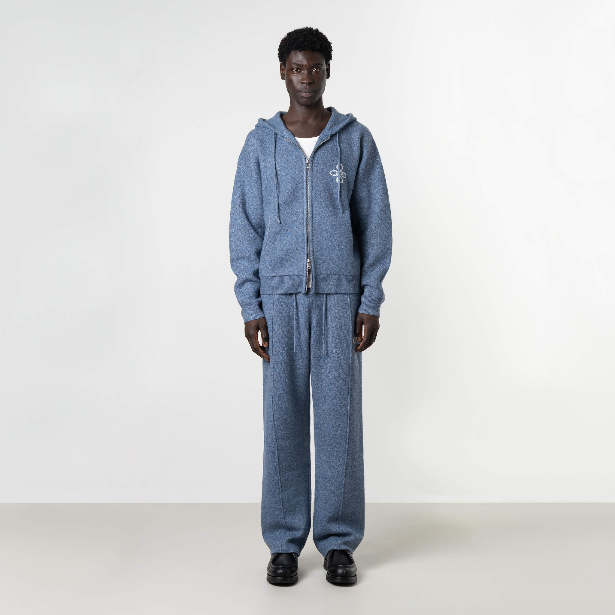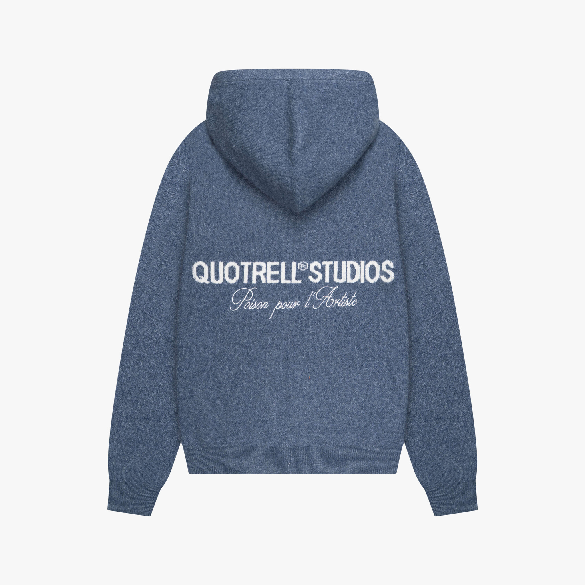 Quotrell Calvin Knitted Zip Hoodie Blue is een luxe gebreide hoodie met rits, zachte wolmix en subtiel logo op de borst. Achterzijde met “Quotrell Studios” borduursel. Combineer met de Calvin Knitted Pants voor een complete look.