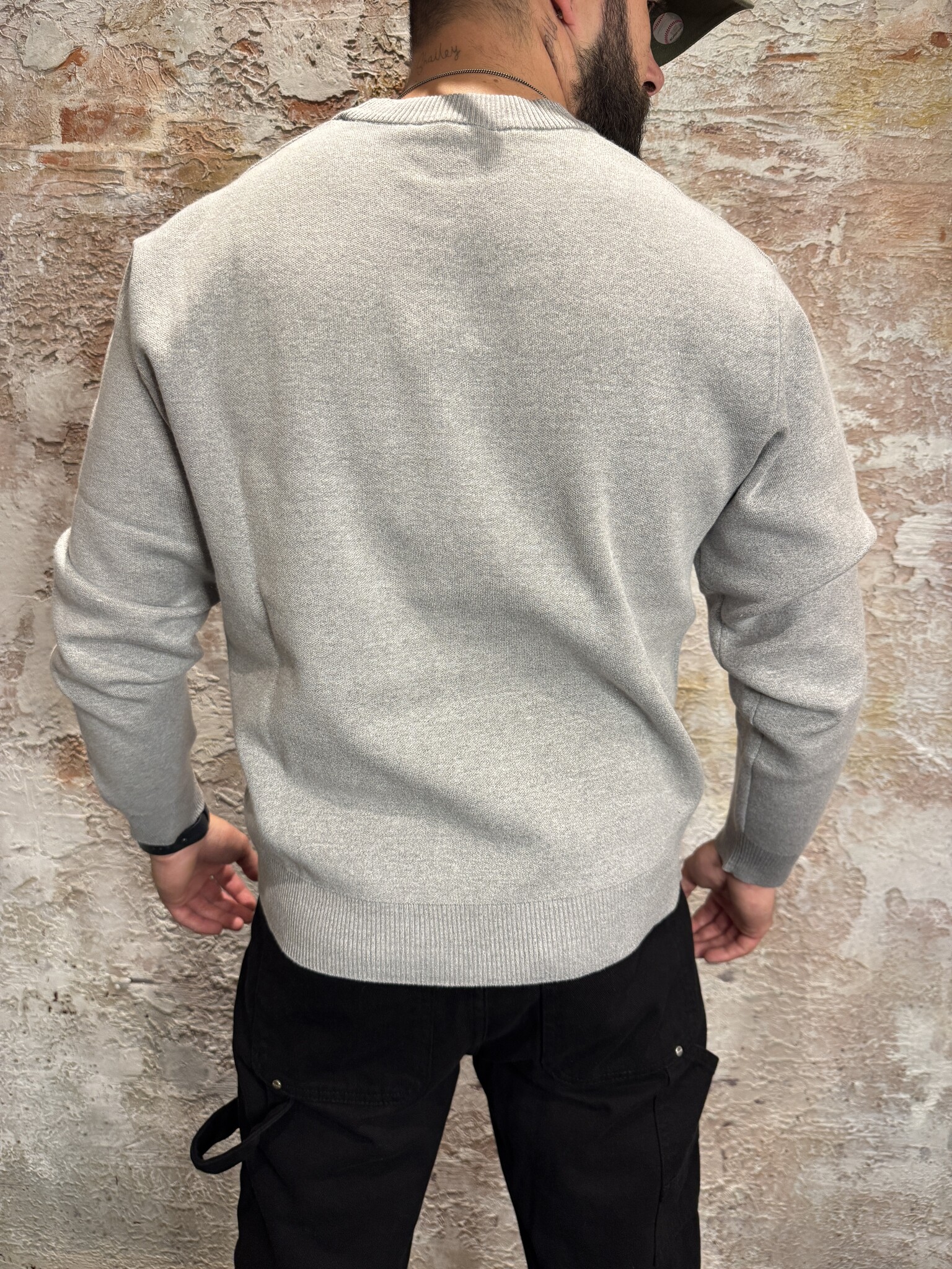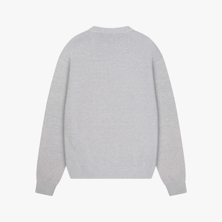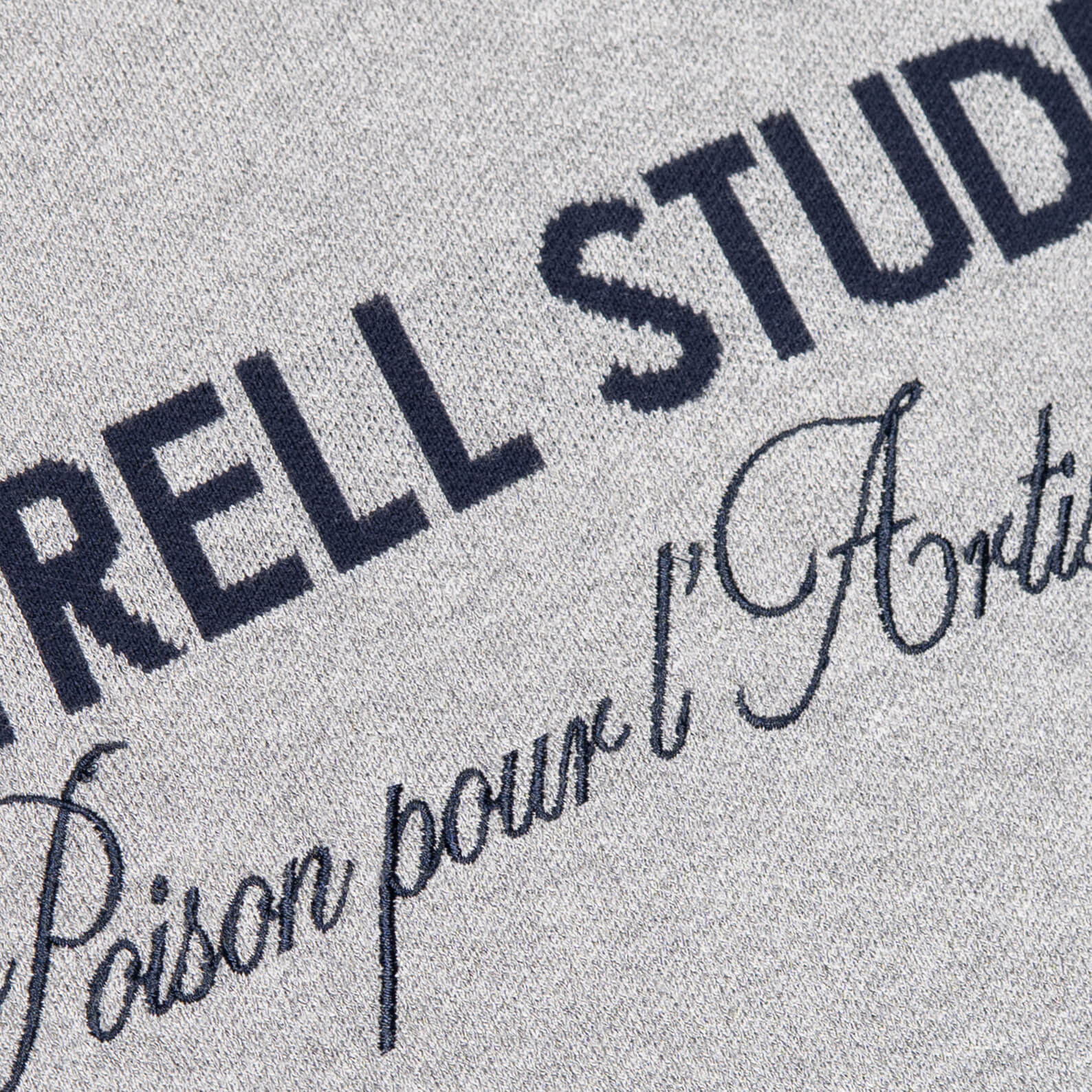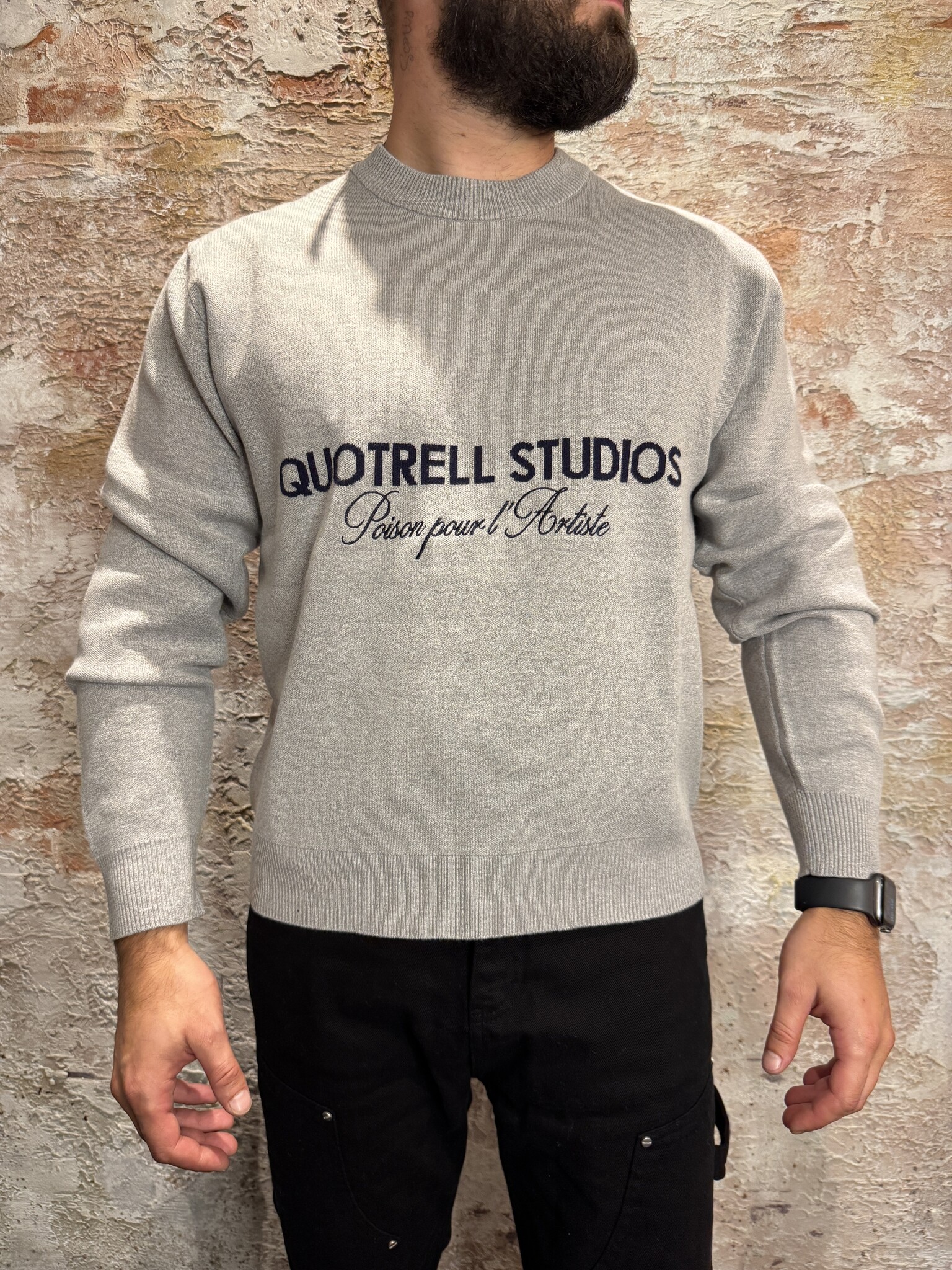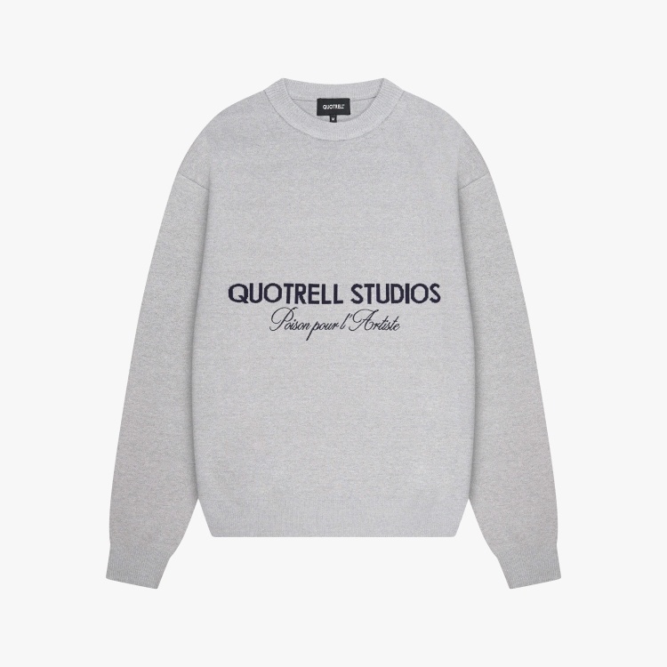 De Quotrell Mondrian Knitted Sweater Grey is een stijlvolle gebreide trui in lichtgrijs met navy borduursel op de borst: *Quotrell Studios – Poison pour l’Artiste*. Gemaakt van hoogwaardige knitwear, regular fit en ideaal voor een moderne streetwear look.