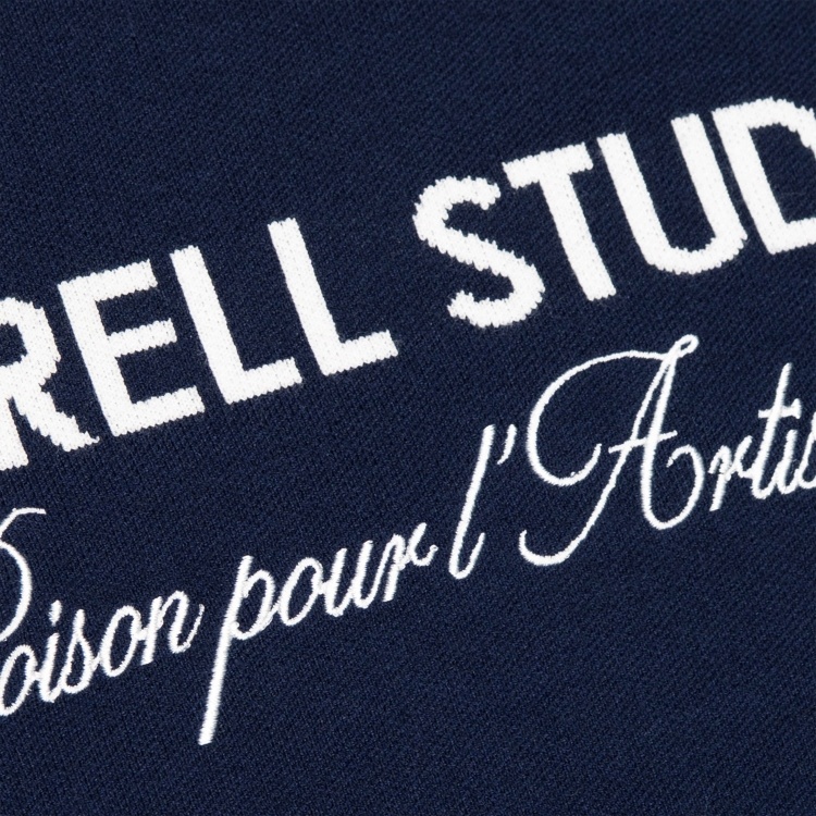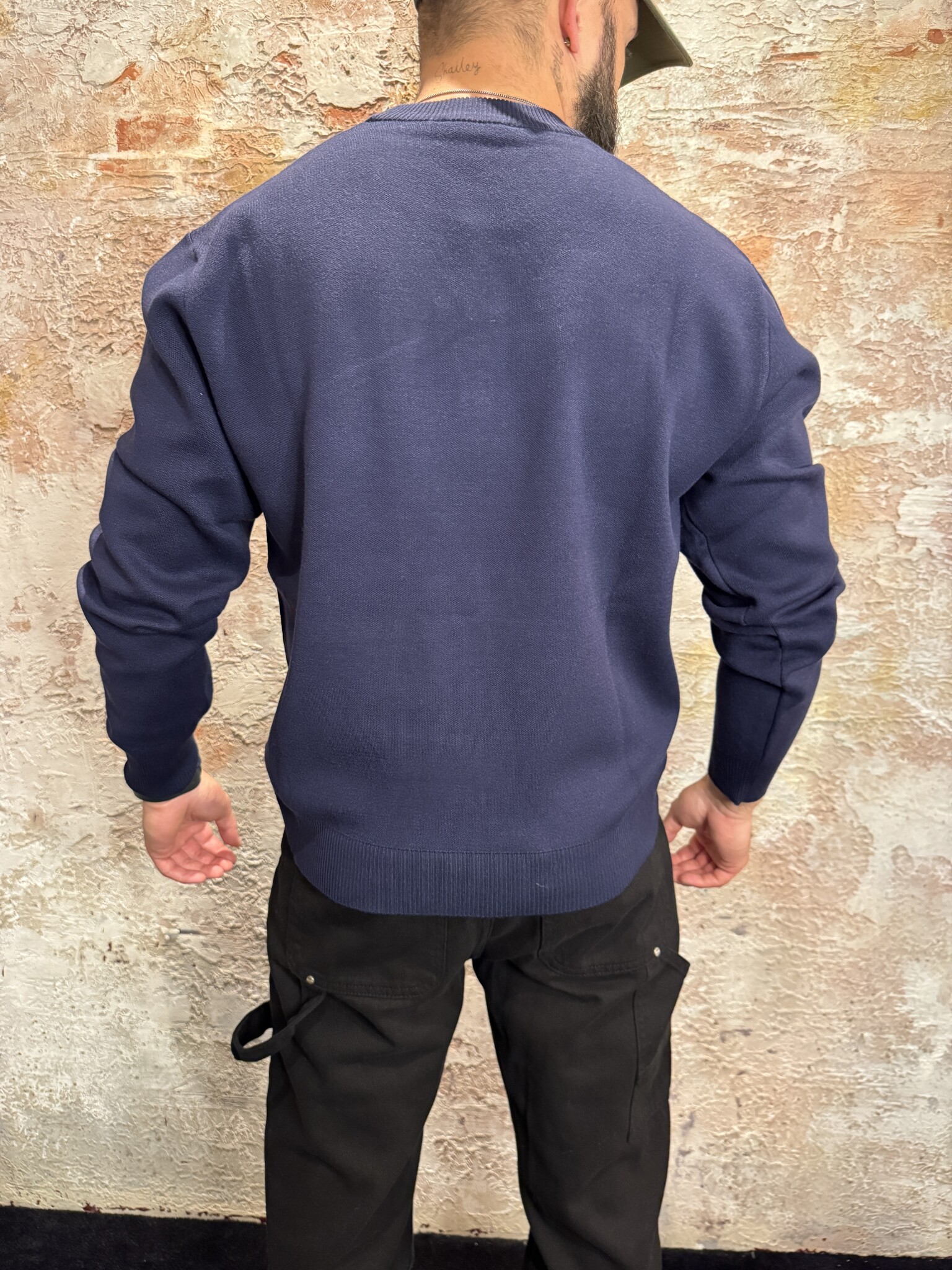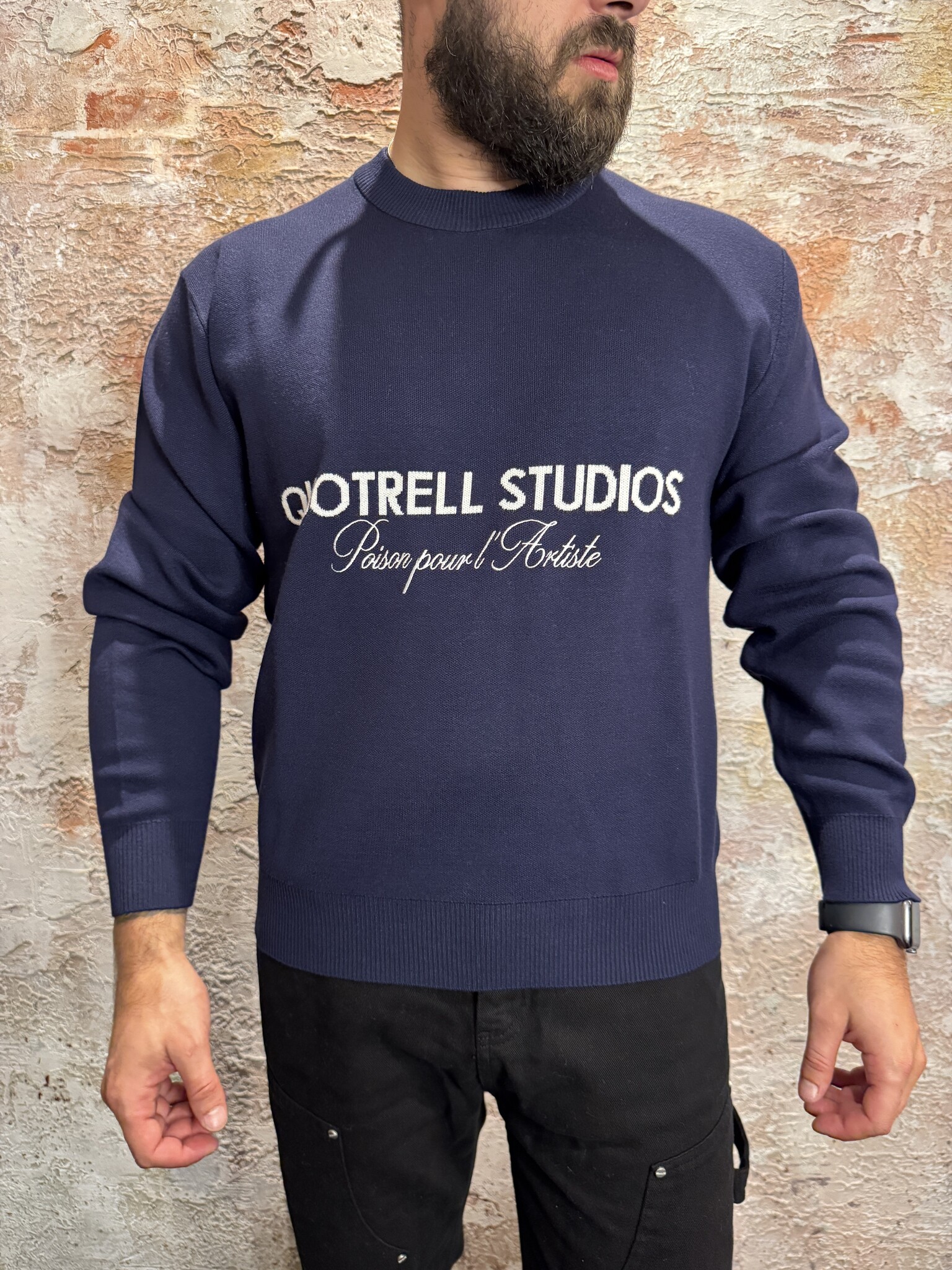 De Quotrell Mondrian Knitted Sweater Navy is een stijlvolle gebreide trui in blauw met witte borduursel op de borst: *Quotrell Studios – Poison pour l’Artiste*. Gemaakt van hoogwaardige knitwear, regular fit en ideaal voor een moderne streetwear look.