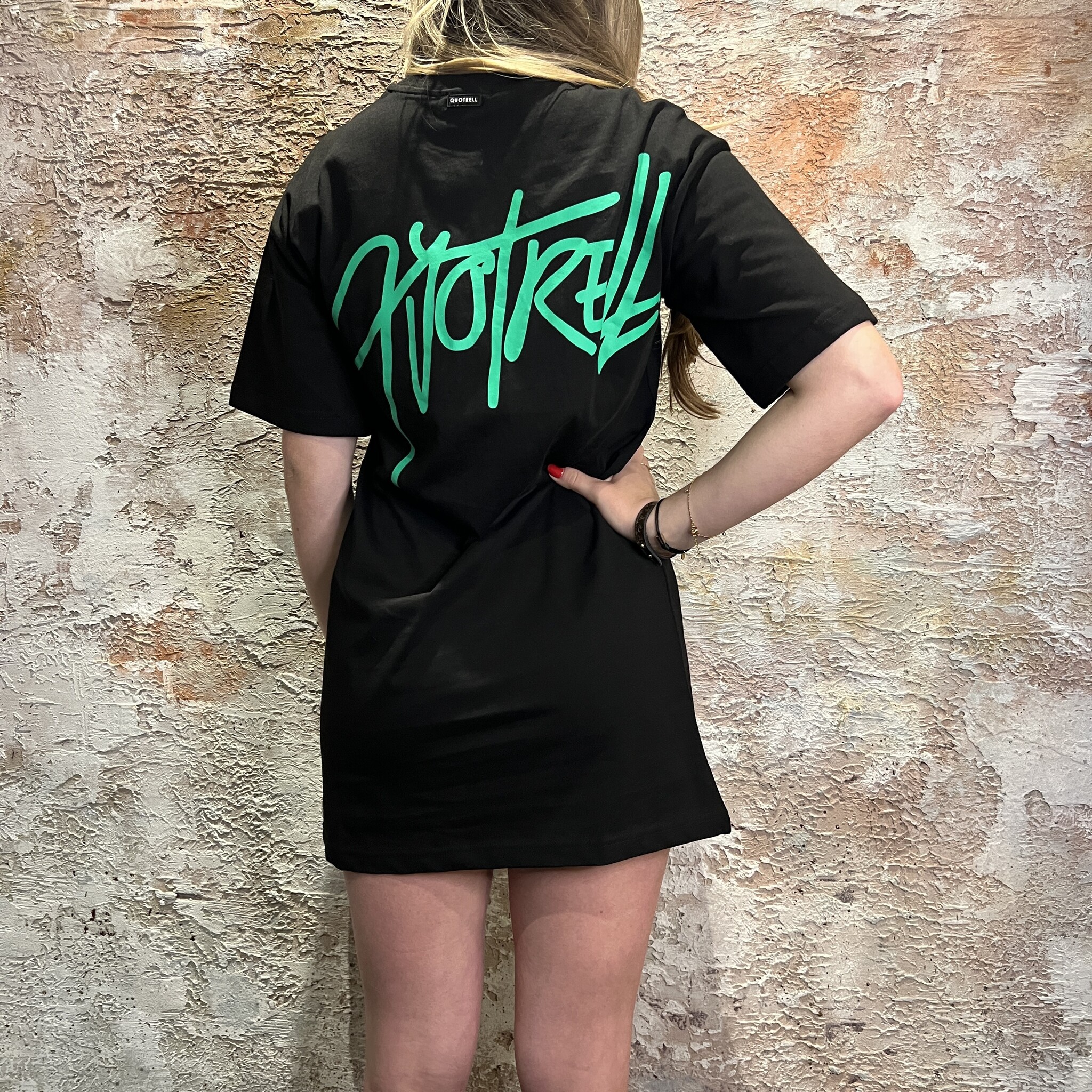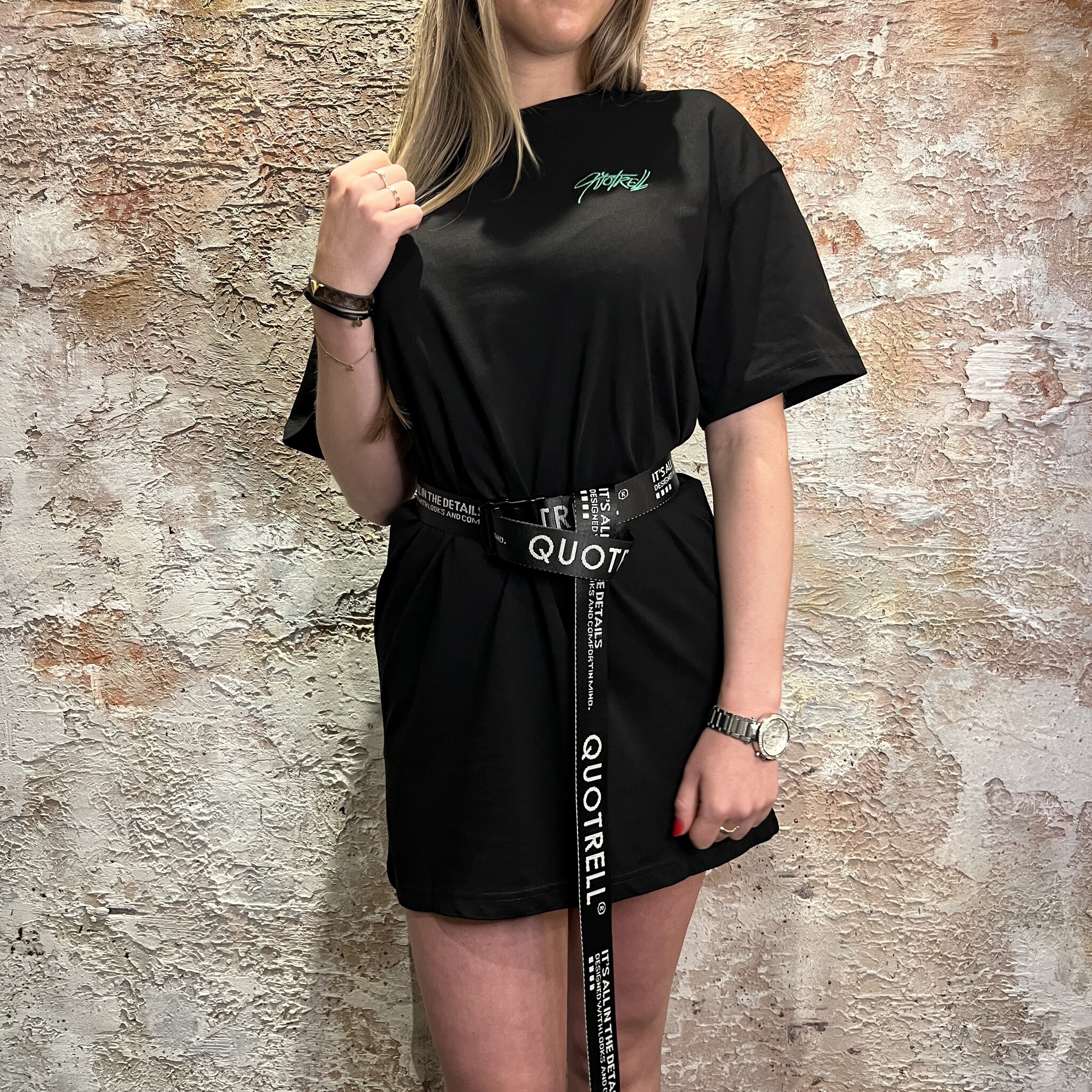 T-shirt dress Quotrell, losse fit, ons model draagt een XS en is 1.67 lang, riem is los verkrijgbaar.