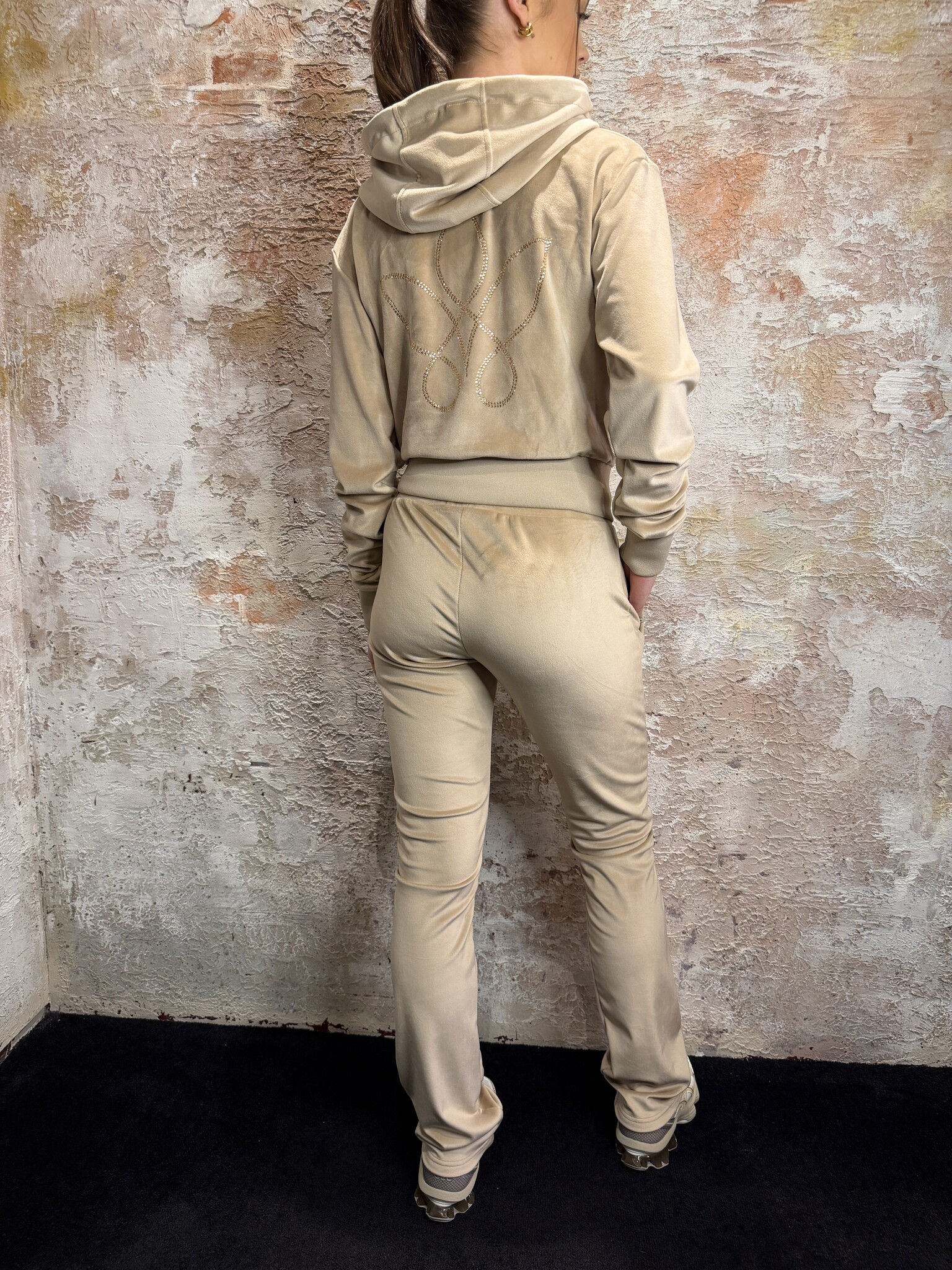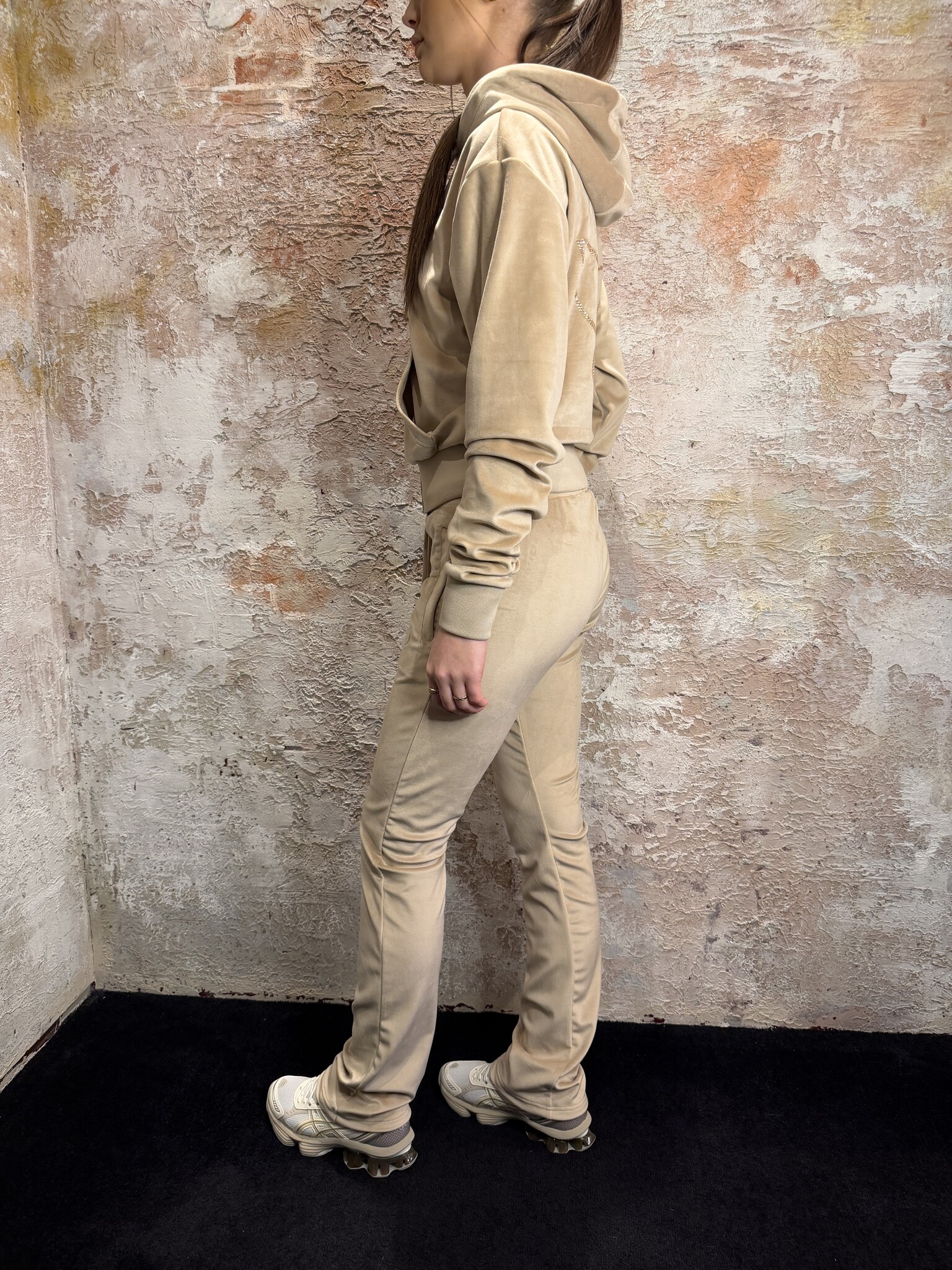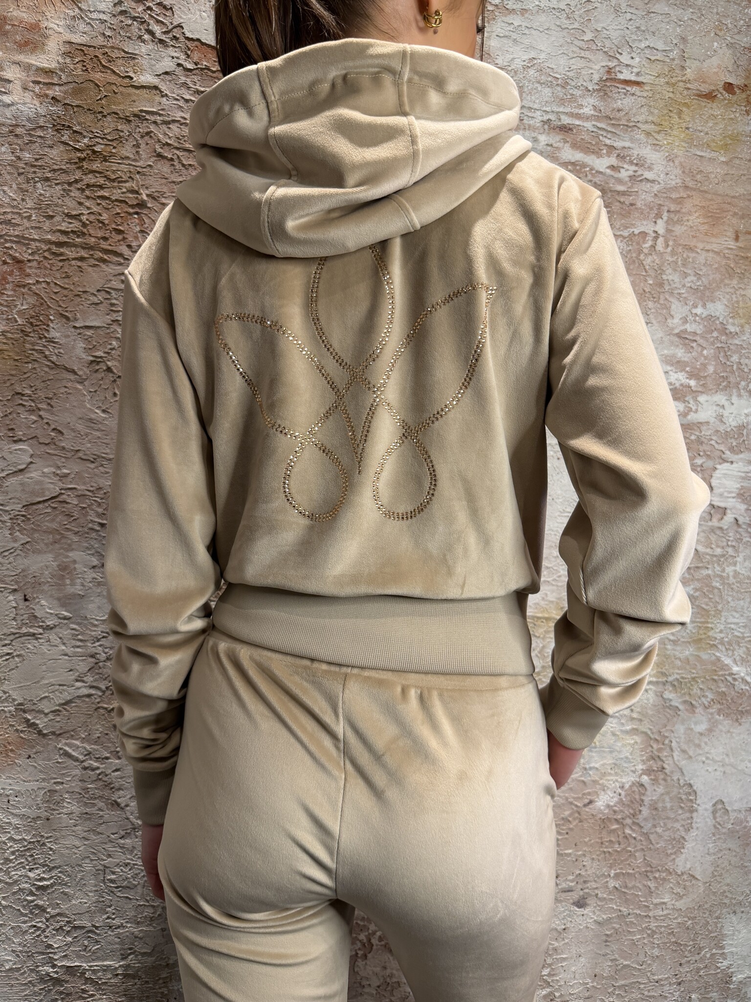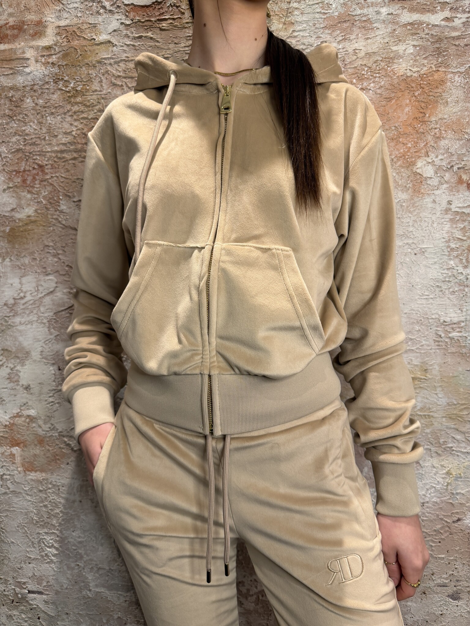 RD Signature Romi Jacket Velvet Beige. Luxe velvet hoodie met zachte feel en perfecte pasvorm. Voorzien van rits, capuchon en subtiele details. Ideaal als comfy maar stijlvolle set. Combineer met de bijpassende broek voor een complete look.
