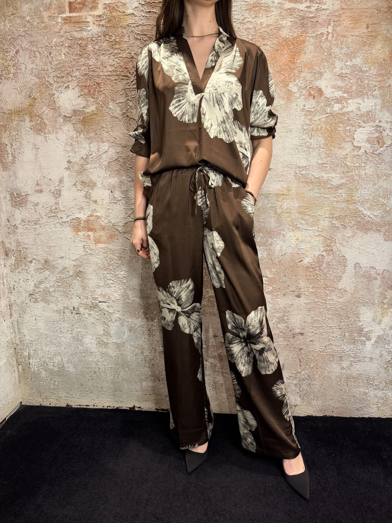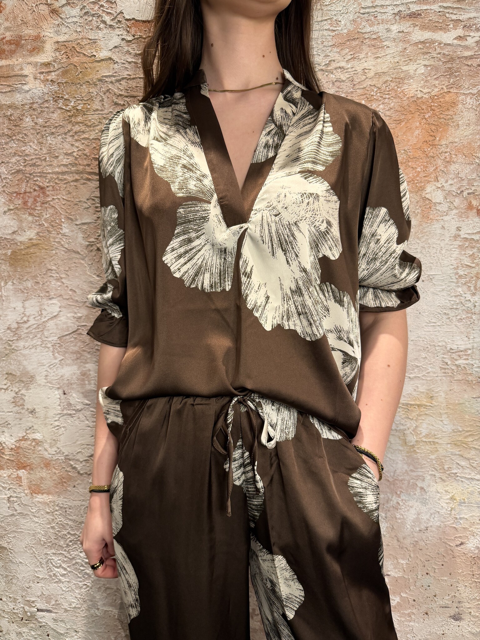 Elegante Sisters Point dames top in chocolate brown met opvallende cream bloemenprint. De blouse heeft een V-hals, losse pasvorm en driekwart mouwen met elastische manchetten. Perfect voor een stijlvolle en vrouwelijke outfit, de bijpassend broek is los.
