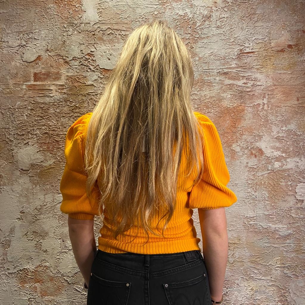 Oranje top met pof mouwtjes en een aansluitende fit, leuke top voor koningsdag!