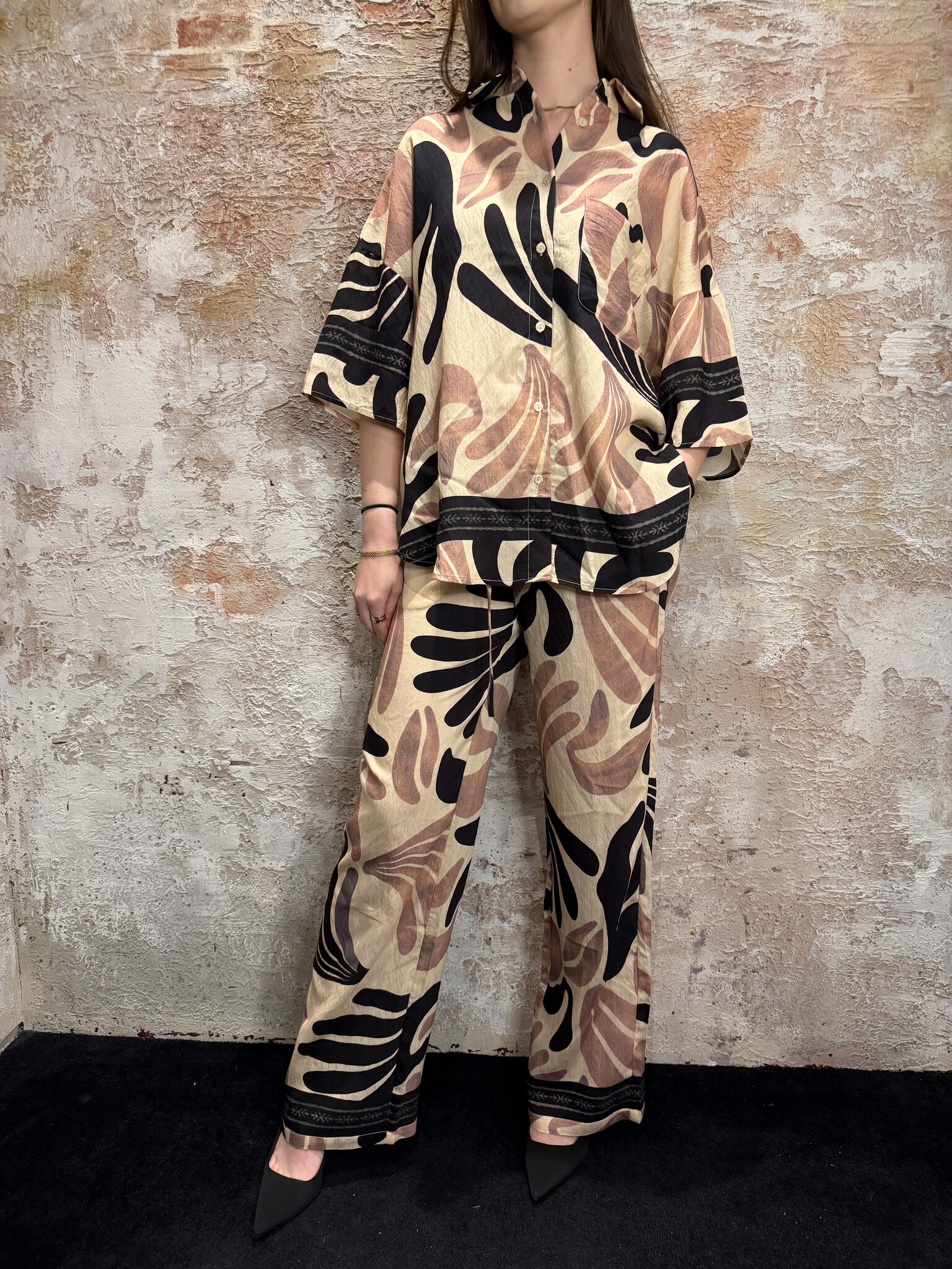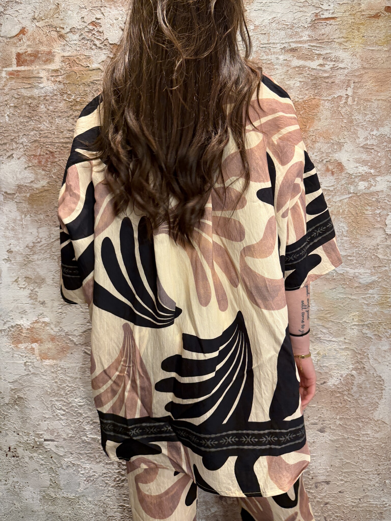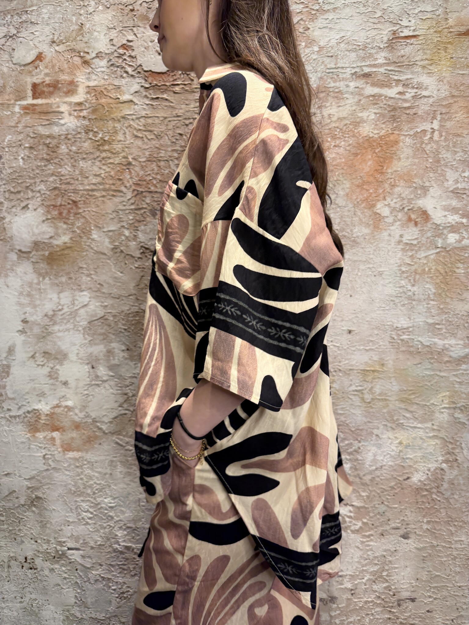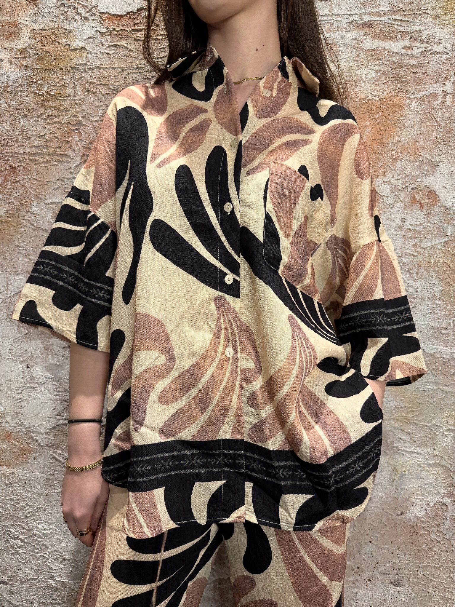 Trendy Sisters Point dames blouse met opvallende print en oversized pasvorm. Deze luchtige blouse met korte mouwen en knoopsluiting heeft een moderne look. Perfect te combineren met de bijpassende broek of een jeans voor een stijlvolle outfit.