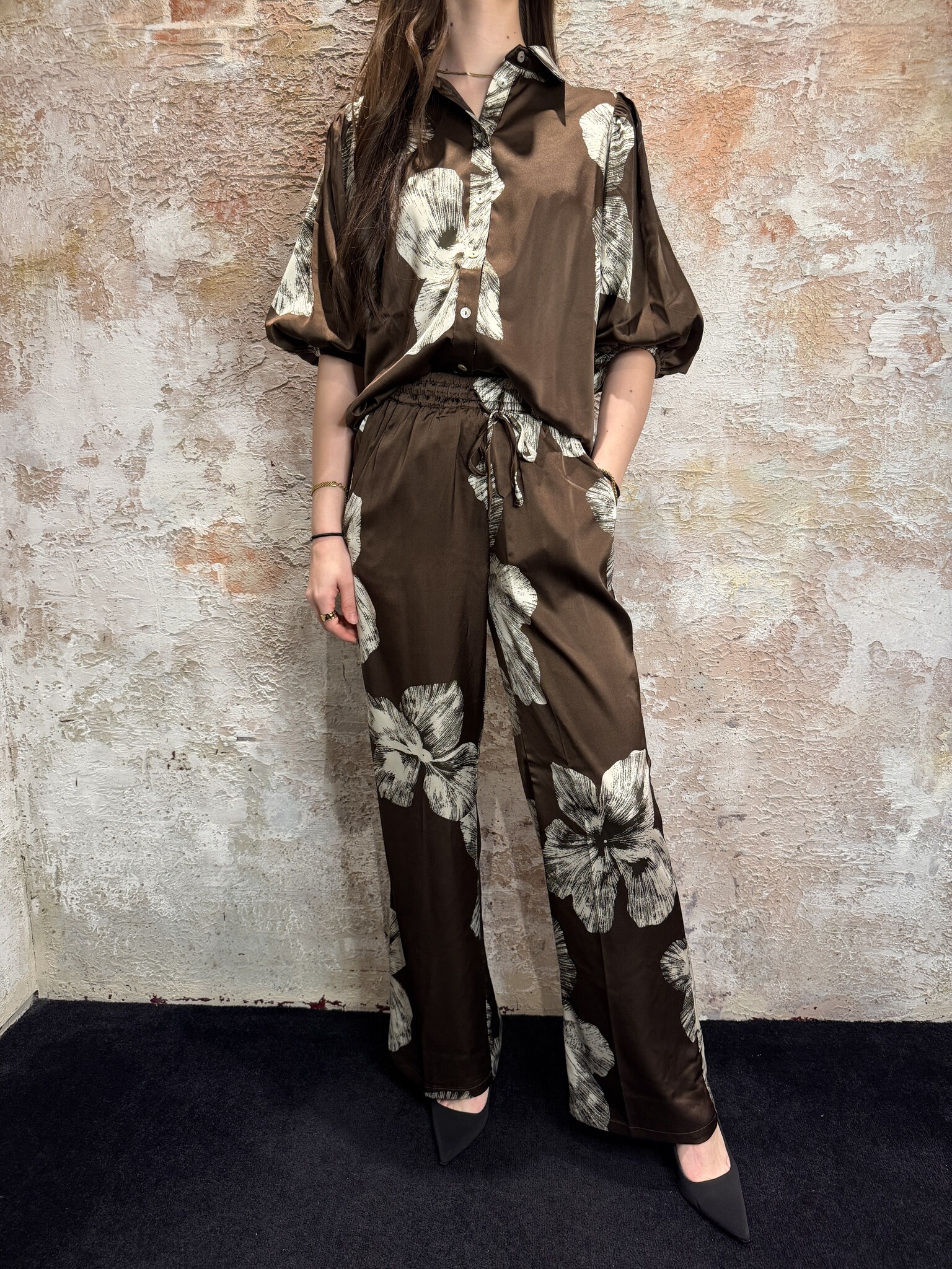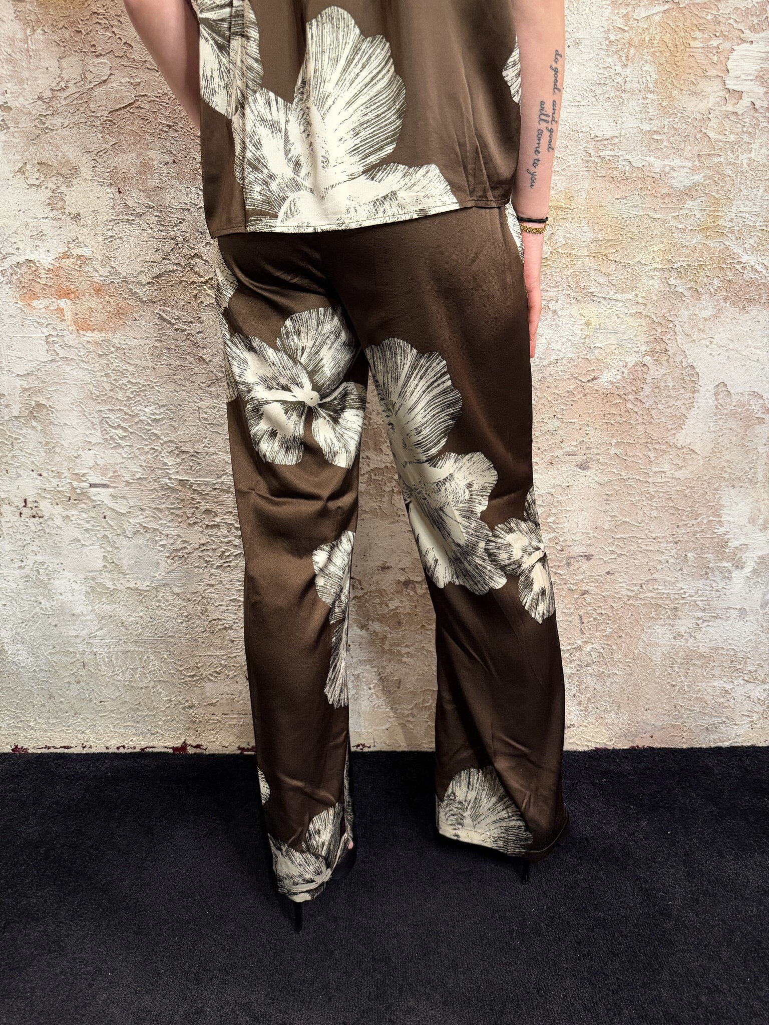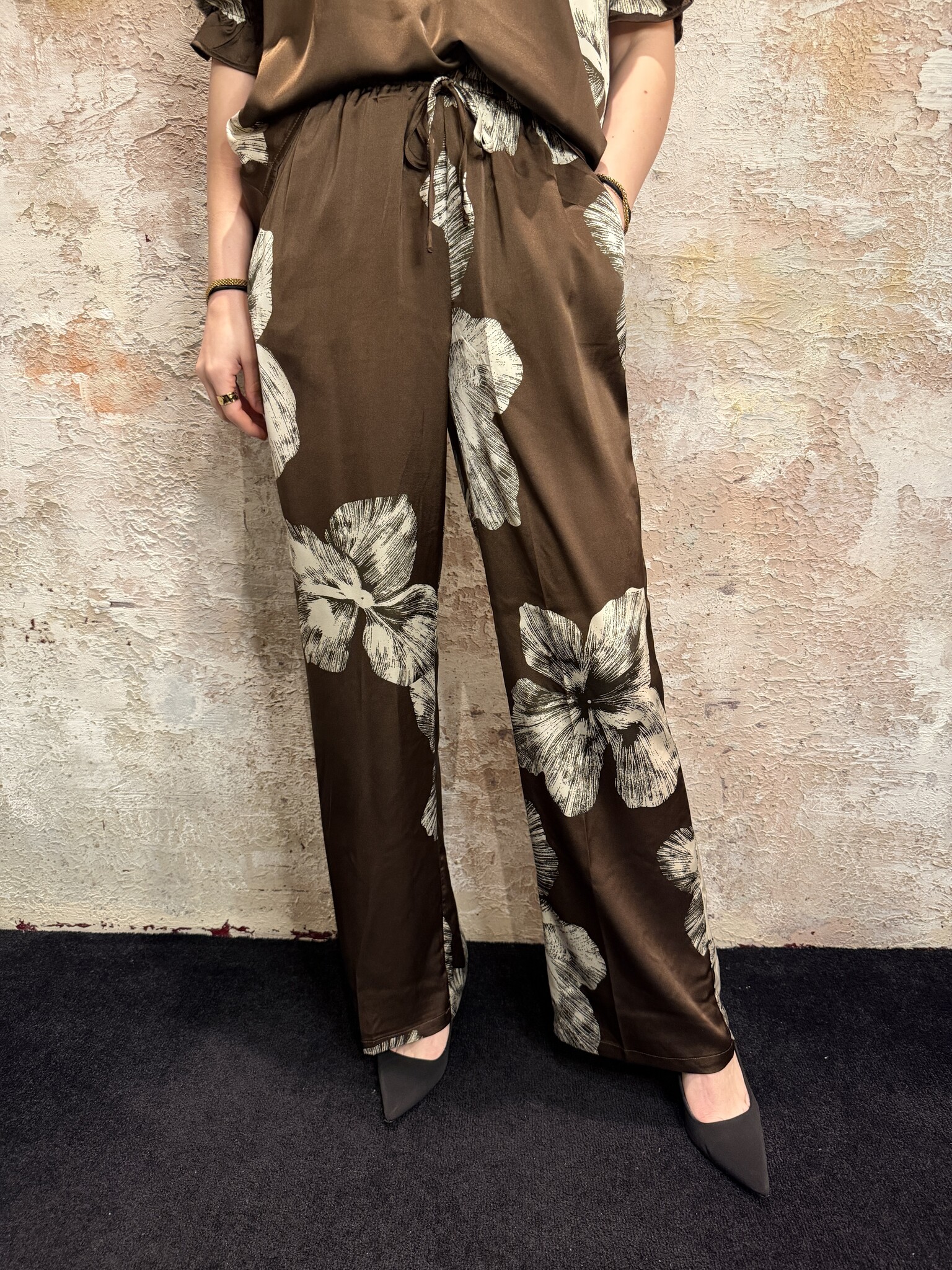 Elegante dames pantalon in brown met grote cream bloemenprint. Deze stijlvolle broek heeft een comfortabele elastische taille met striksluiting, rechte wijde pijpen en een luxe soepele stof. Perfect te combineren met de bijpassende blouse voor een set