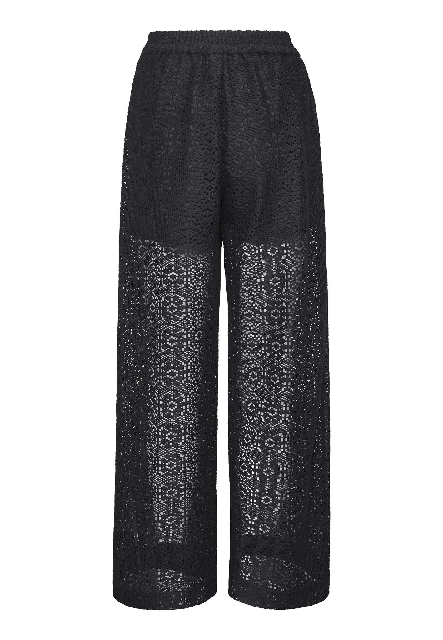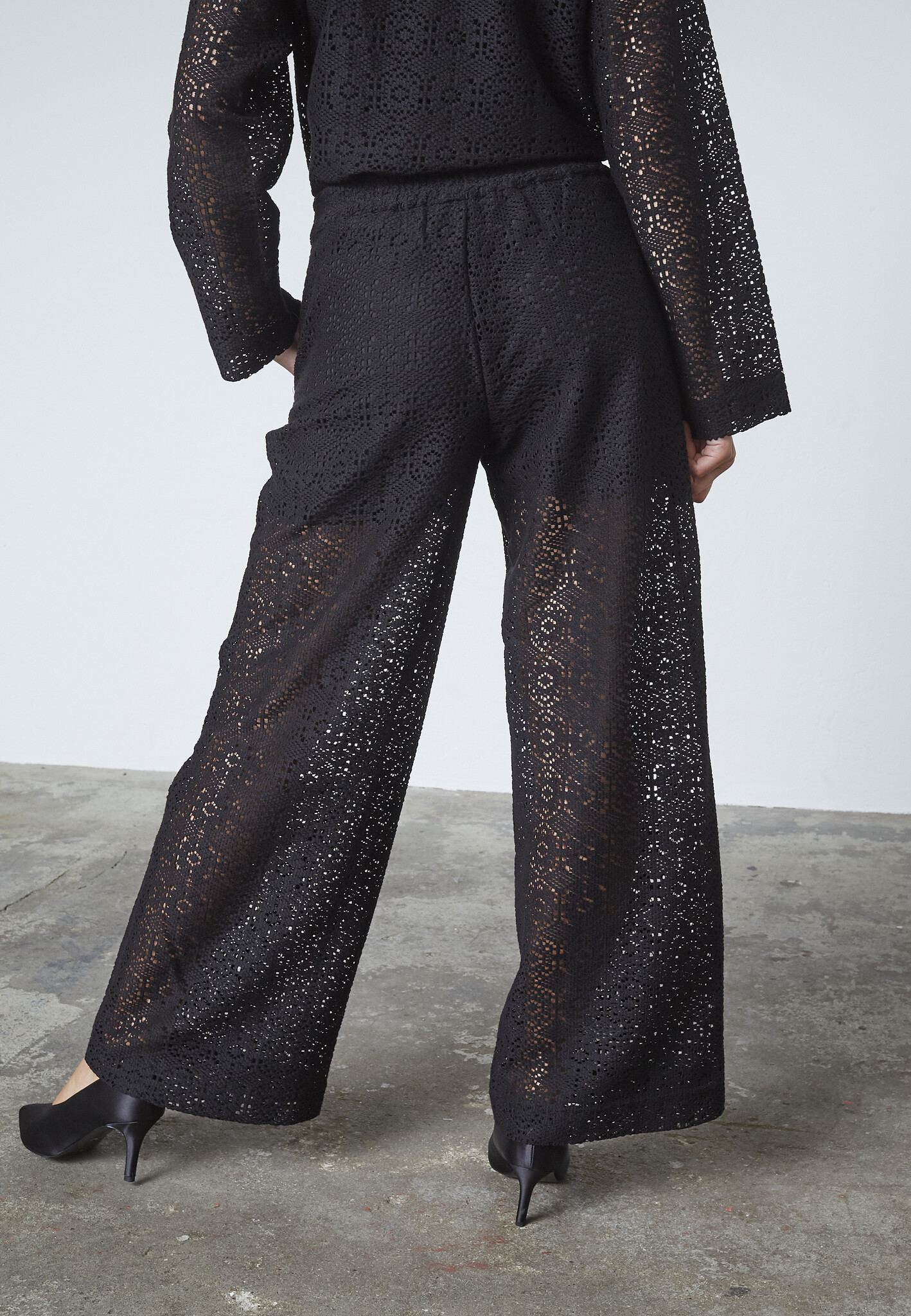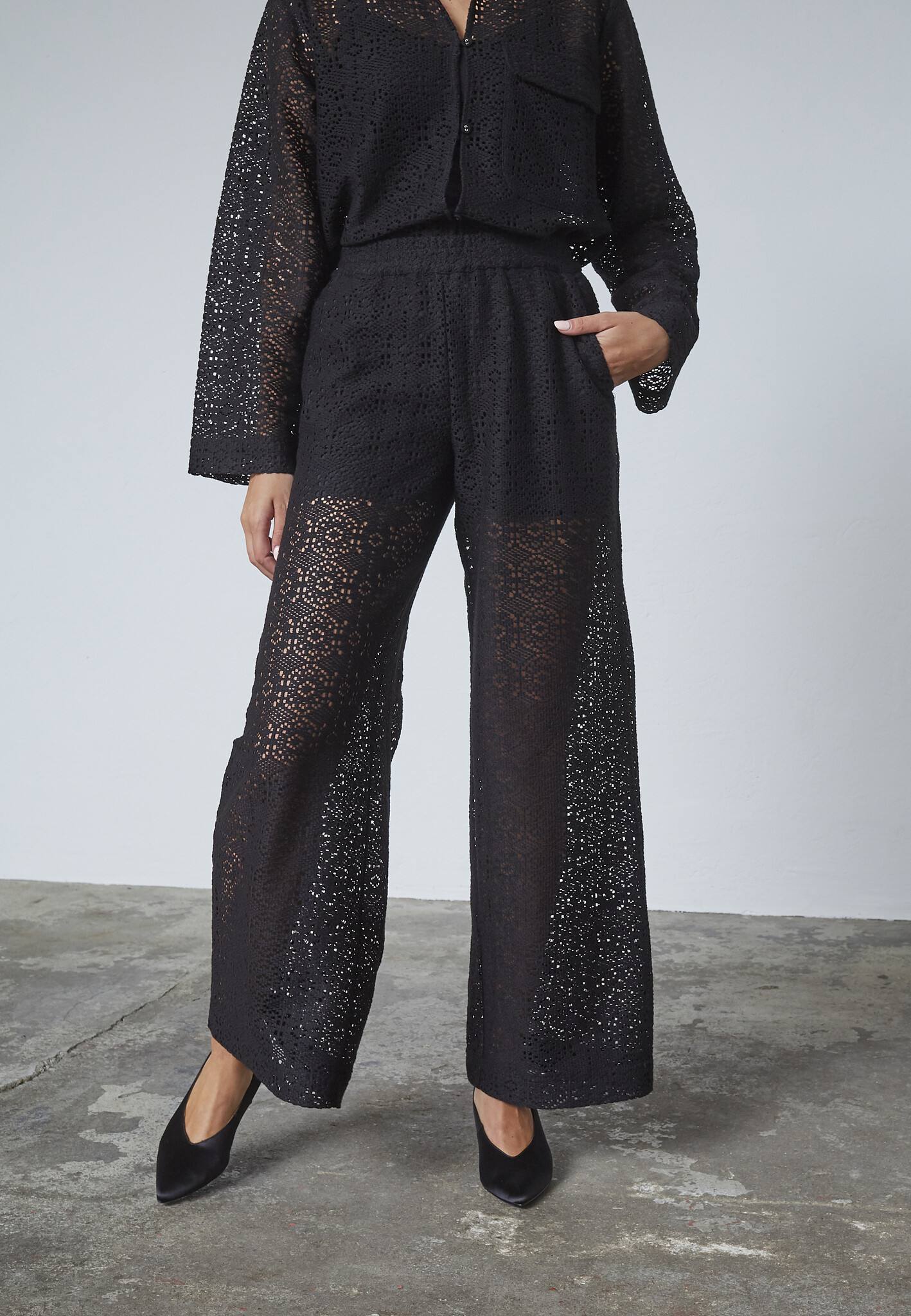 De Sisters Point Elsia Pant in zwart is een luchtige, rechte broek van gehaakt kant met een elastische taille en steekzakken. De doorzichtige stof geeft een elegante en zomerse look, ideaal in combinatie met de bijpassende Elsia blouse.