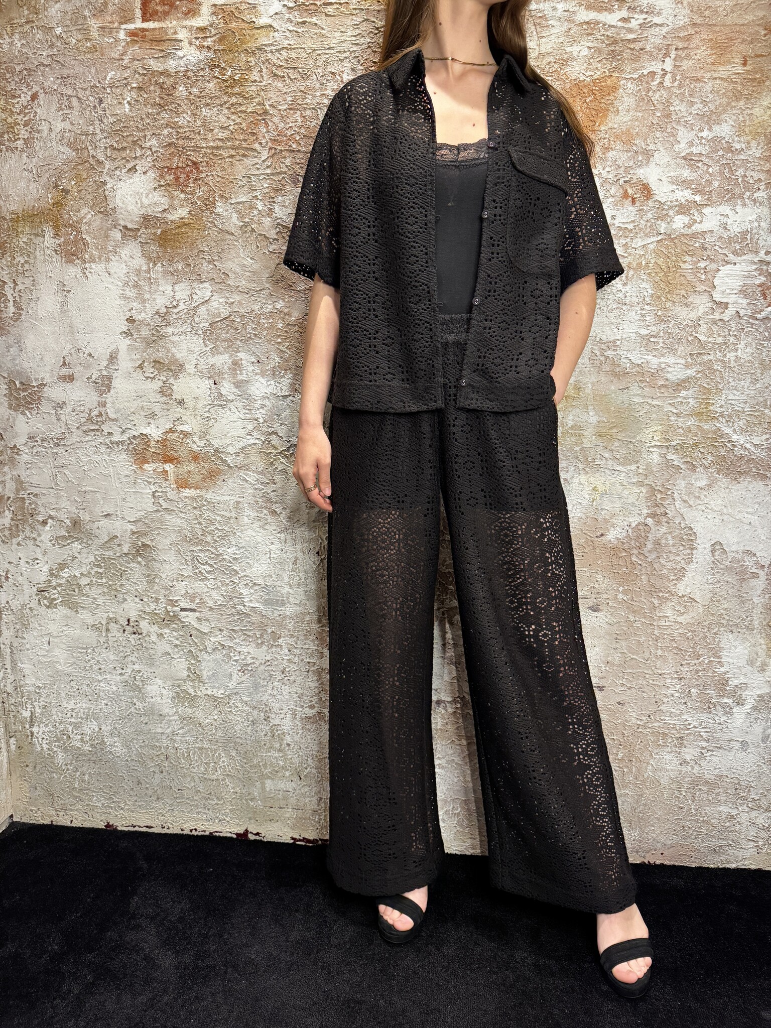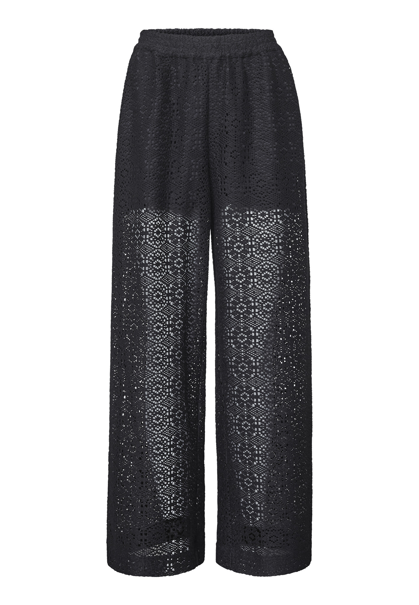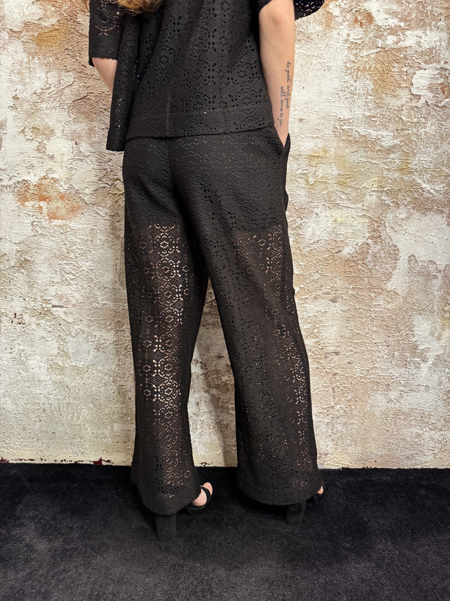 De Sisters Point Elsia Pant in zwart is een luchtige, rechte broek van gehaakt kant met een elastische taille en steekzakken. De doorzichtige stof geeft een elegante en zomerse look, ideaal in combinatie met de bijpassende Elsia blouse.