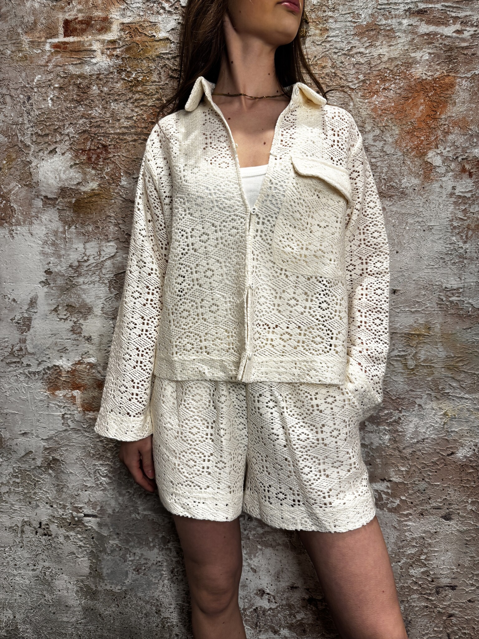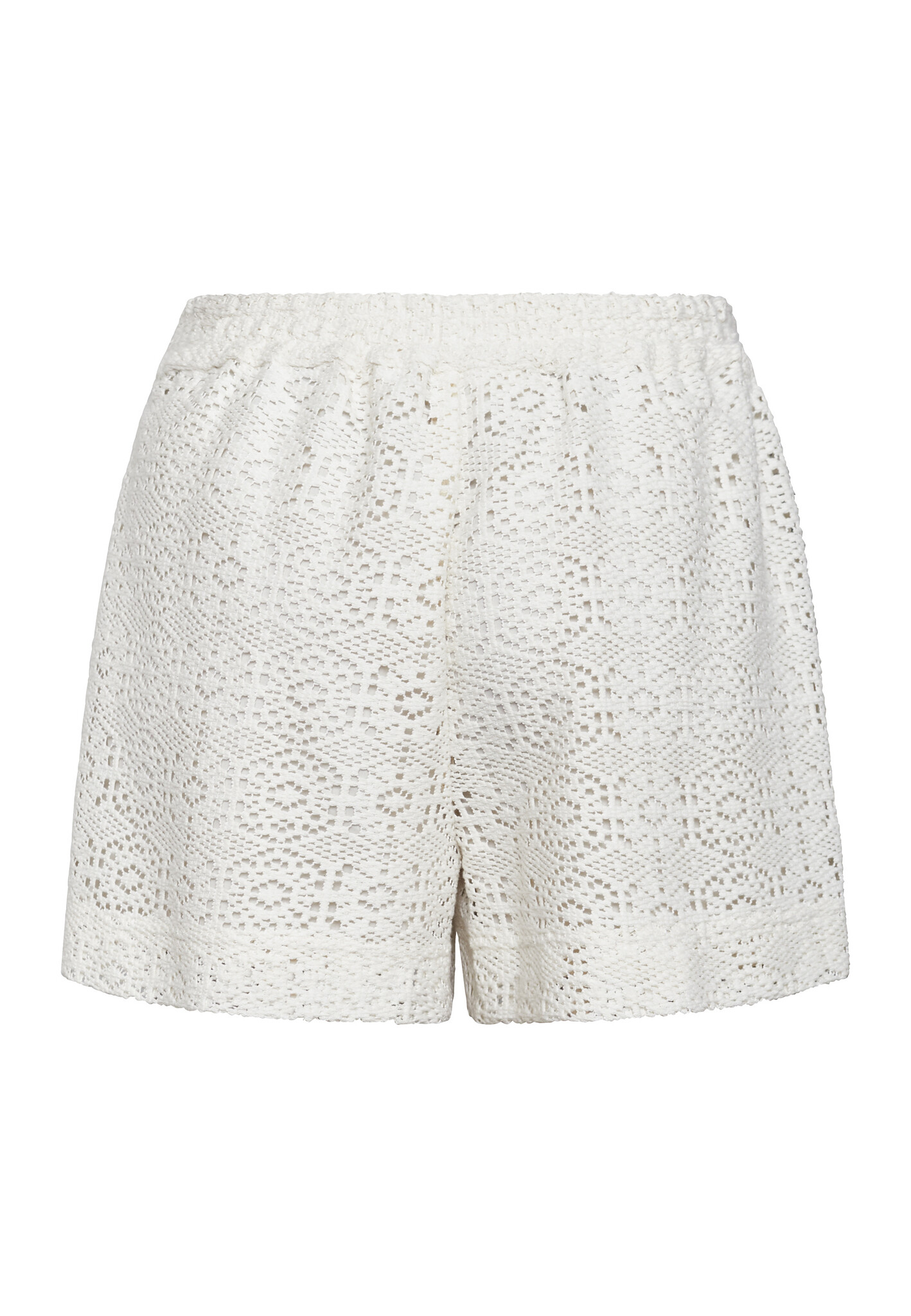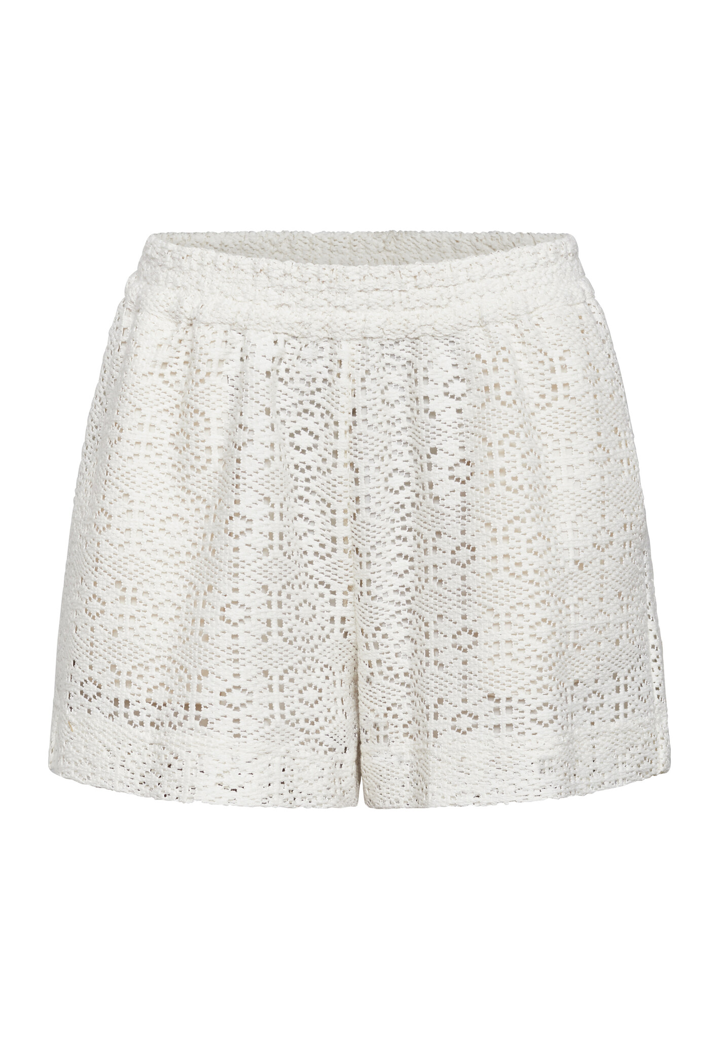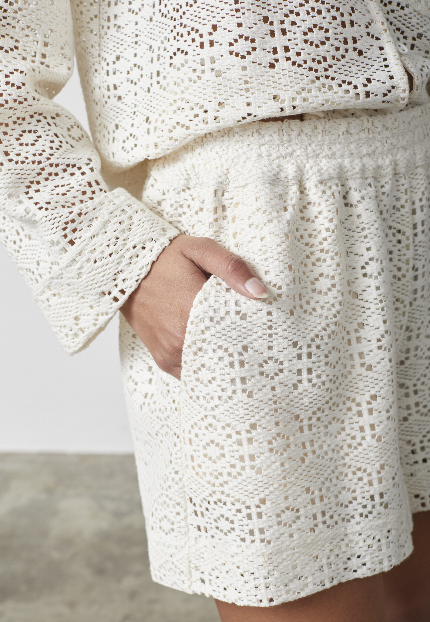 De Elsia Short Cream is een luchtige short van opengewerkt kant in een speels, geometrisch patroon. Met een comfortabele elastische taille en zijzakken is hij perfect voor zomerse dagen. Combineer moeiteloos met de Elsia Shirt voor een complete co-ord set