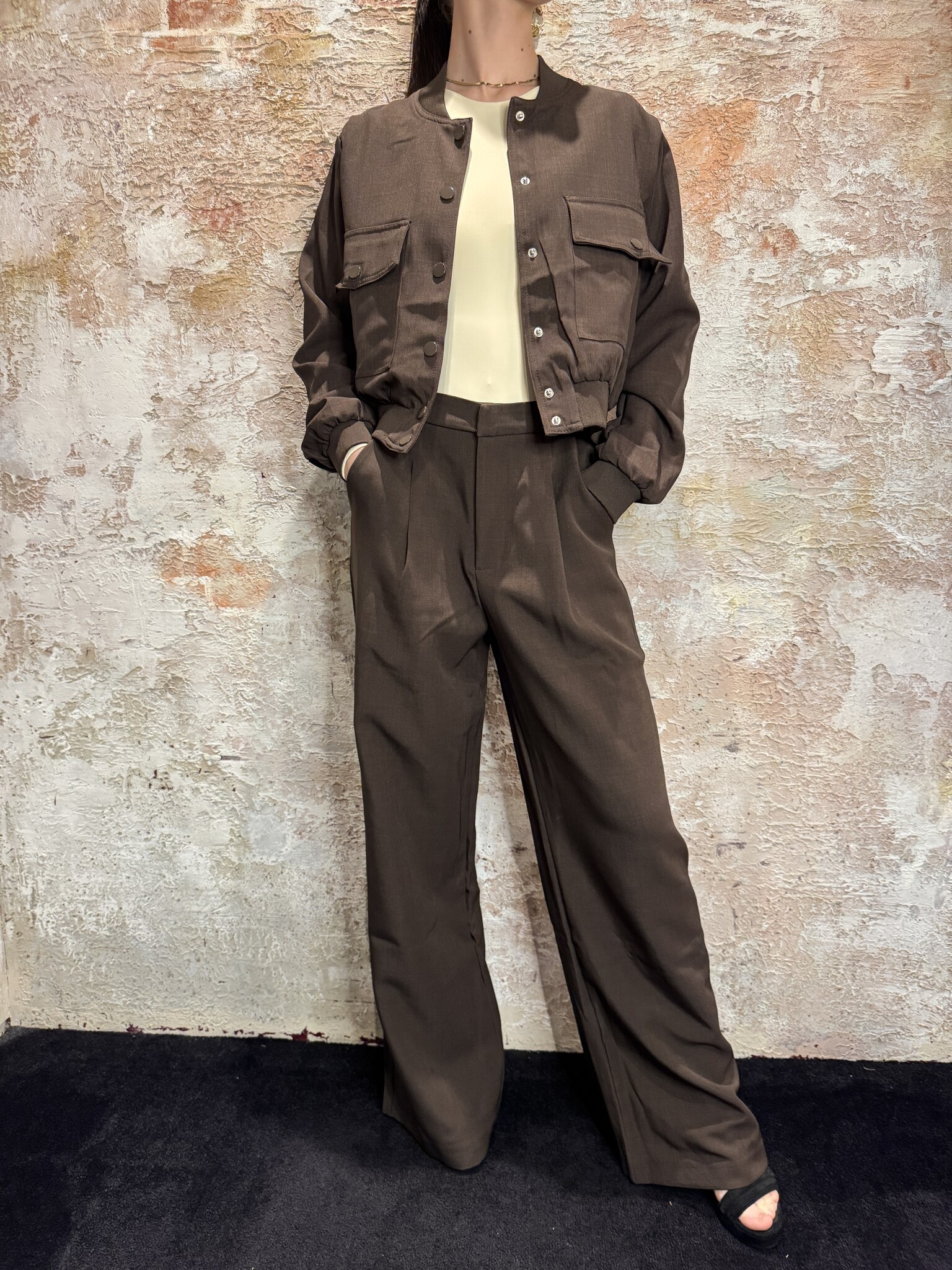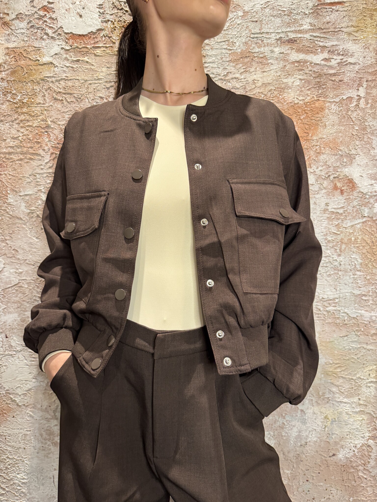 Sisters Point Garwin Bomber Dark Chocolate. Stijlvolle cropped bomberjack in diepe chocoladebruine tint met knoopsluiting en klepzakken. Gemaakt van soepel vallende stof voor een elegante, moderne look. Perfect te combineren met de Great pants.