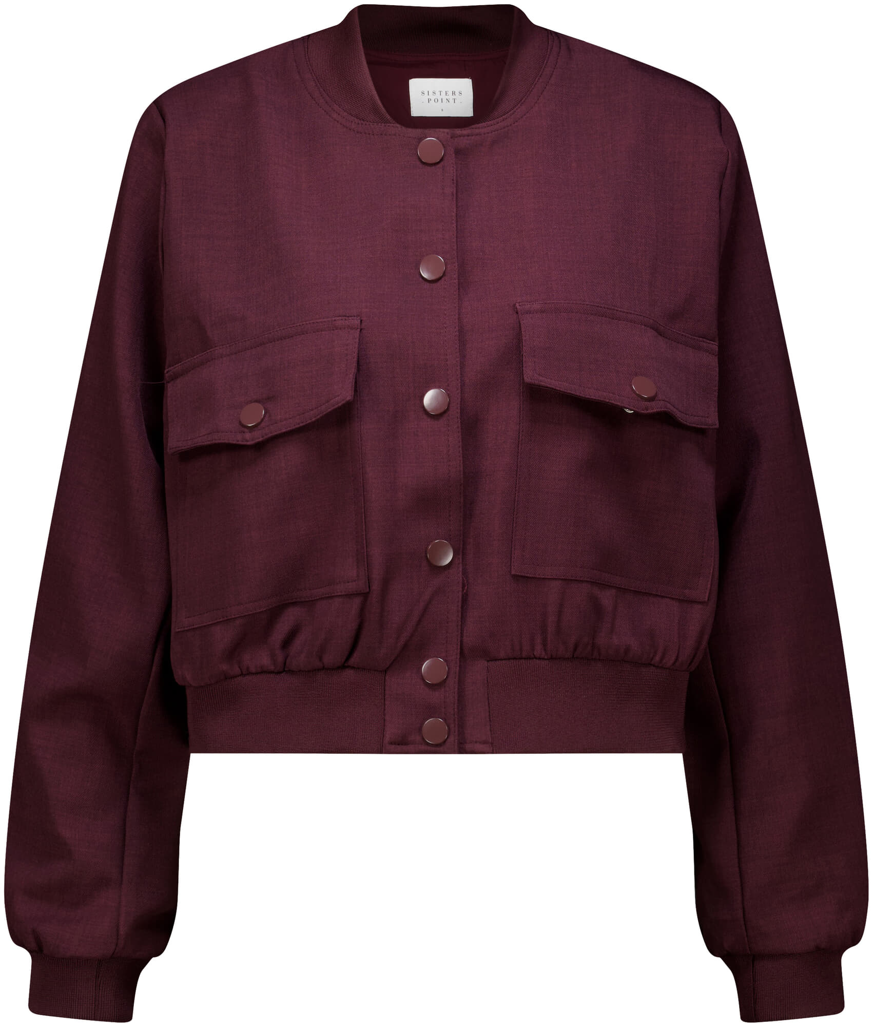 Sisters Point Garwin Bomber in deep bordeaux, cropped model met drukknopen en flapzakken. Perfect te combineren met de matching Great Pant voor een moderne co-ord look. Trendy en comfortabel voor elke dag.
