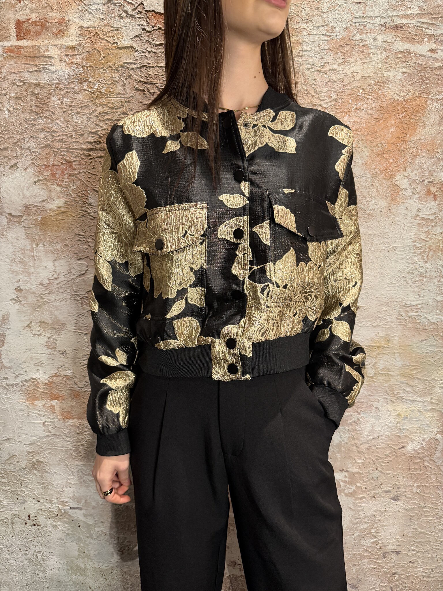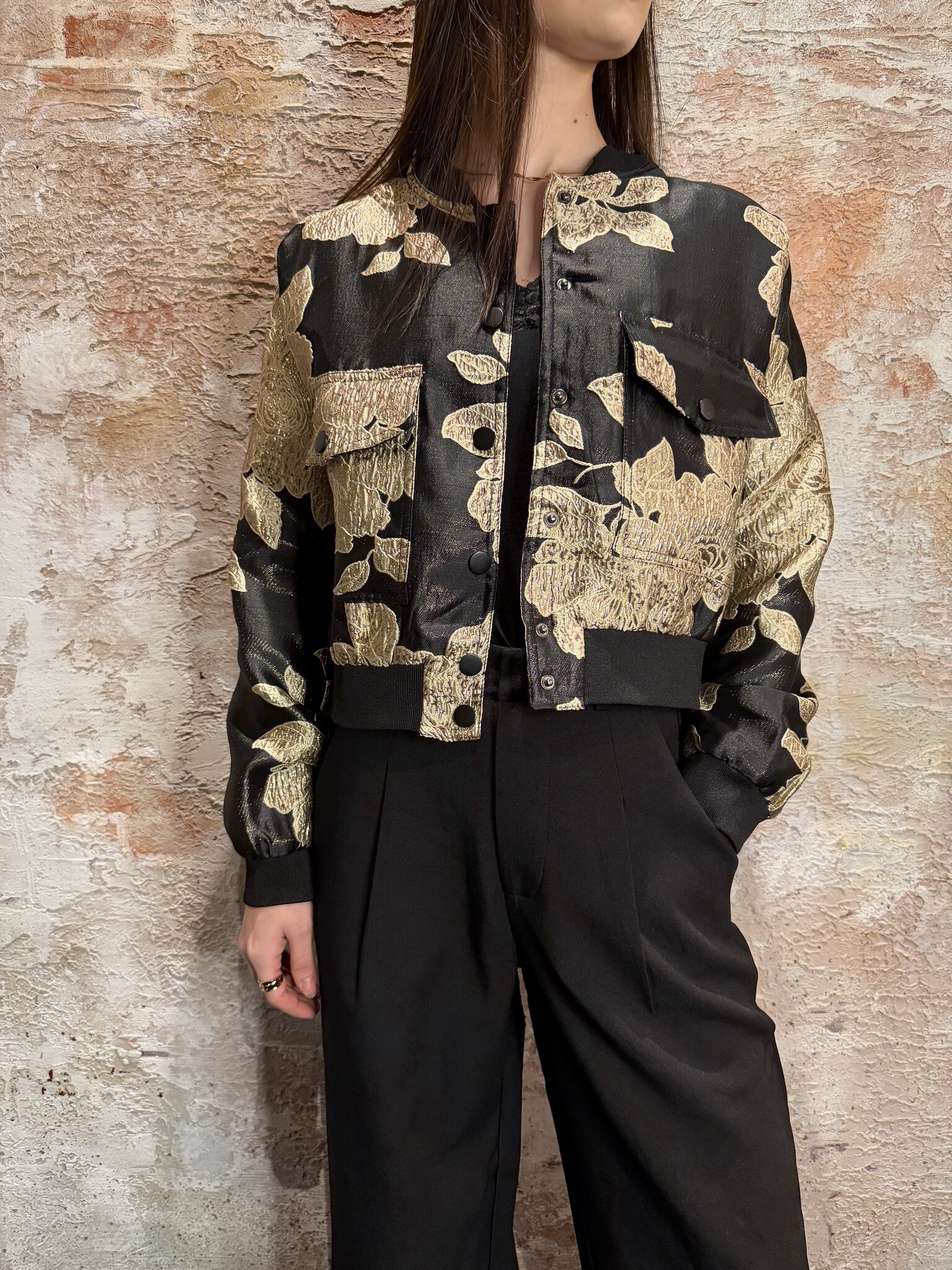 Sisters Point Garwin JA22 Black Gold: een luxe cropped jacket met goud geborduurde bloemen op een zwarte satijnlook basis. Perfect voor feestelijke looks of chique avondoutfits. Combineer met een zwarte pantalon voor een elegante styling.