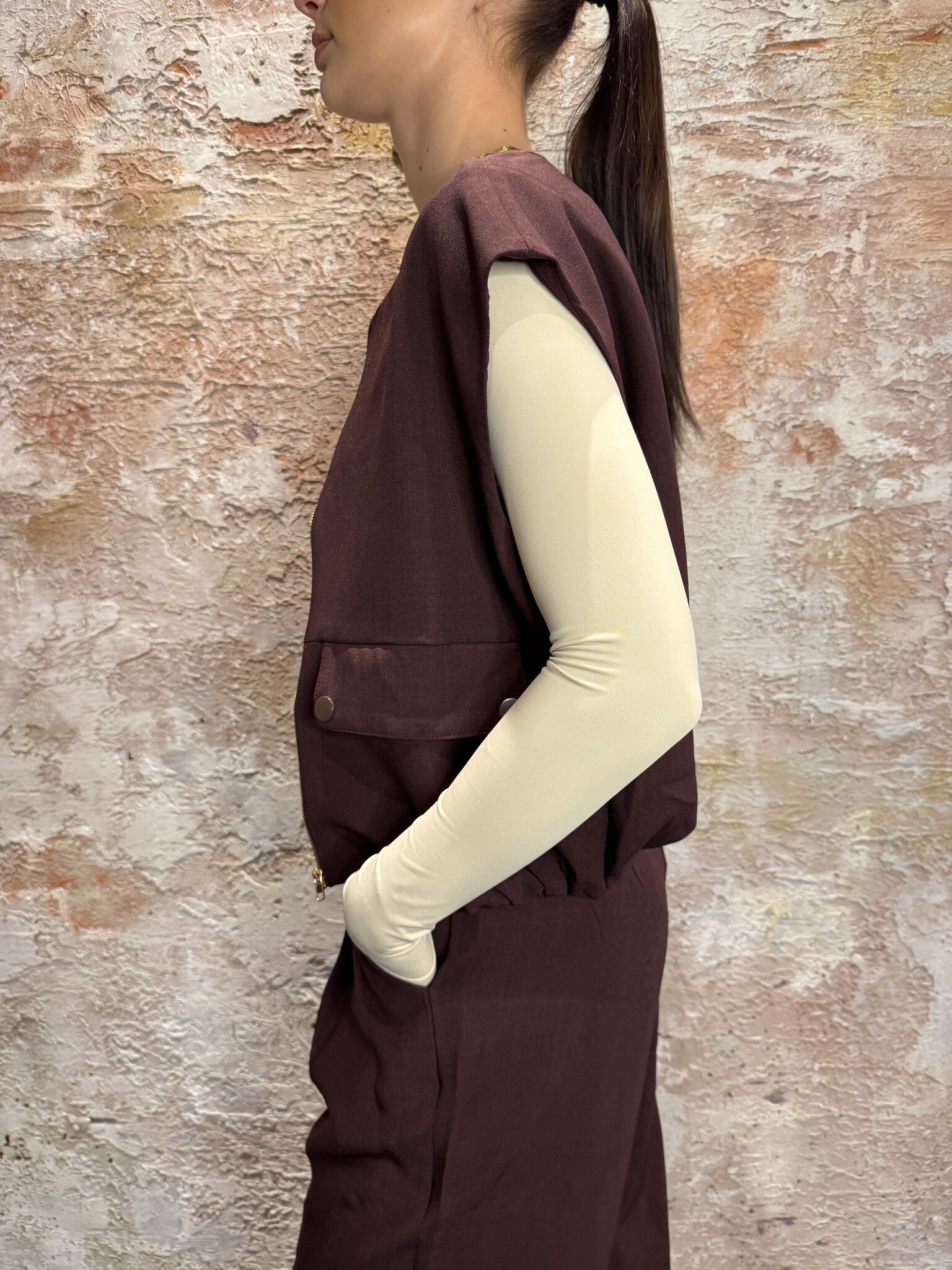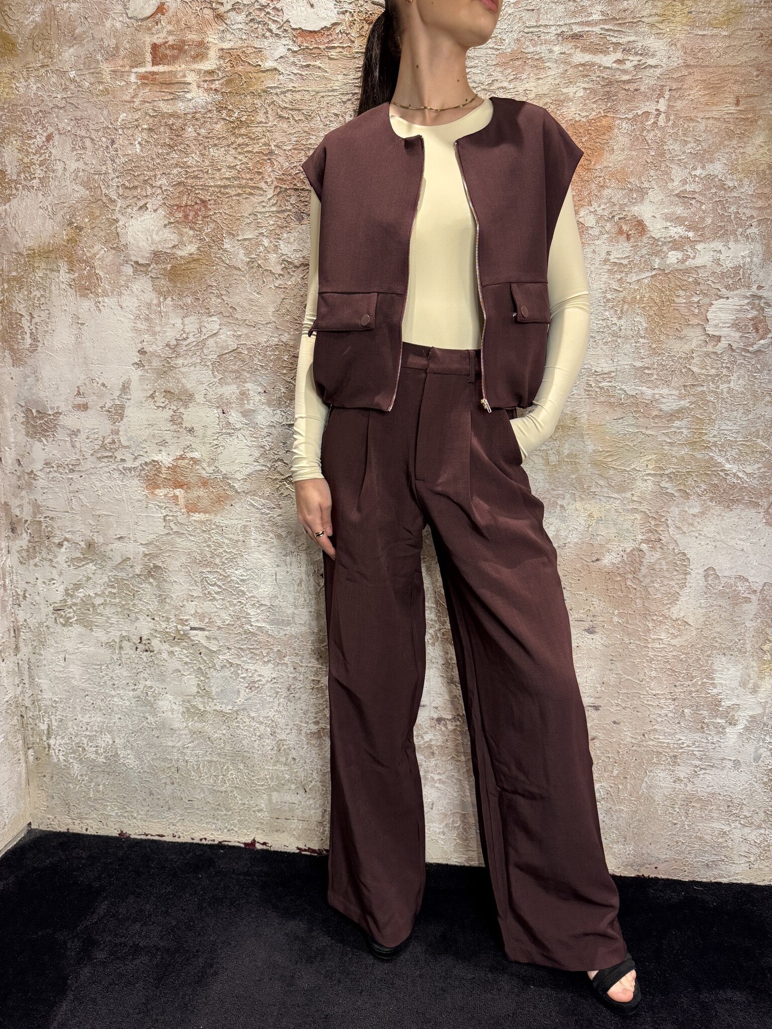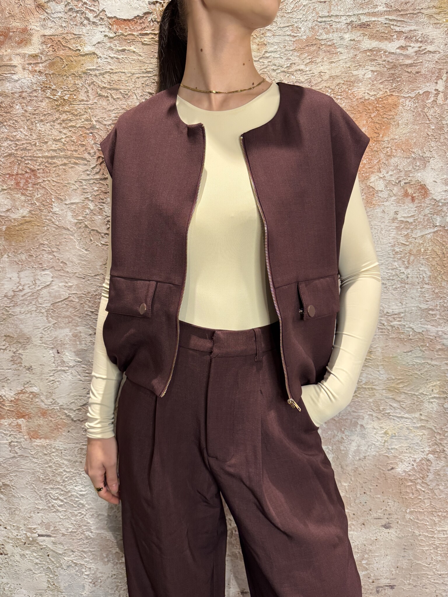 Sisters Point Garwin-VE3 Jacket Bordeaux. Trendy dames gilet in stijlvolle bordeaux kleur met zakdetails en ritssluiting. Combineer casual of chic voor een moderne look. Perfect te dragen met de bijpassende Great Bordeaux broek.