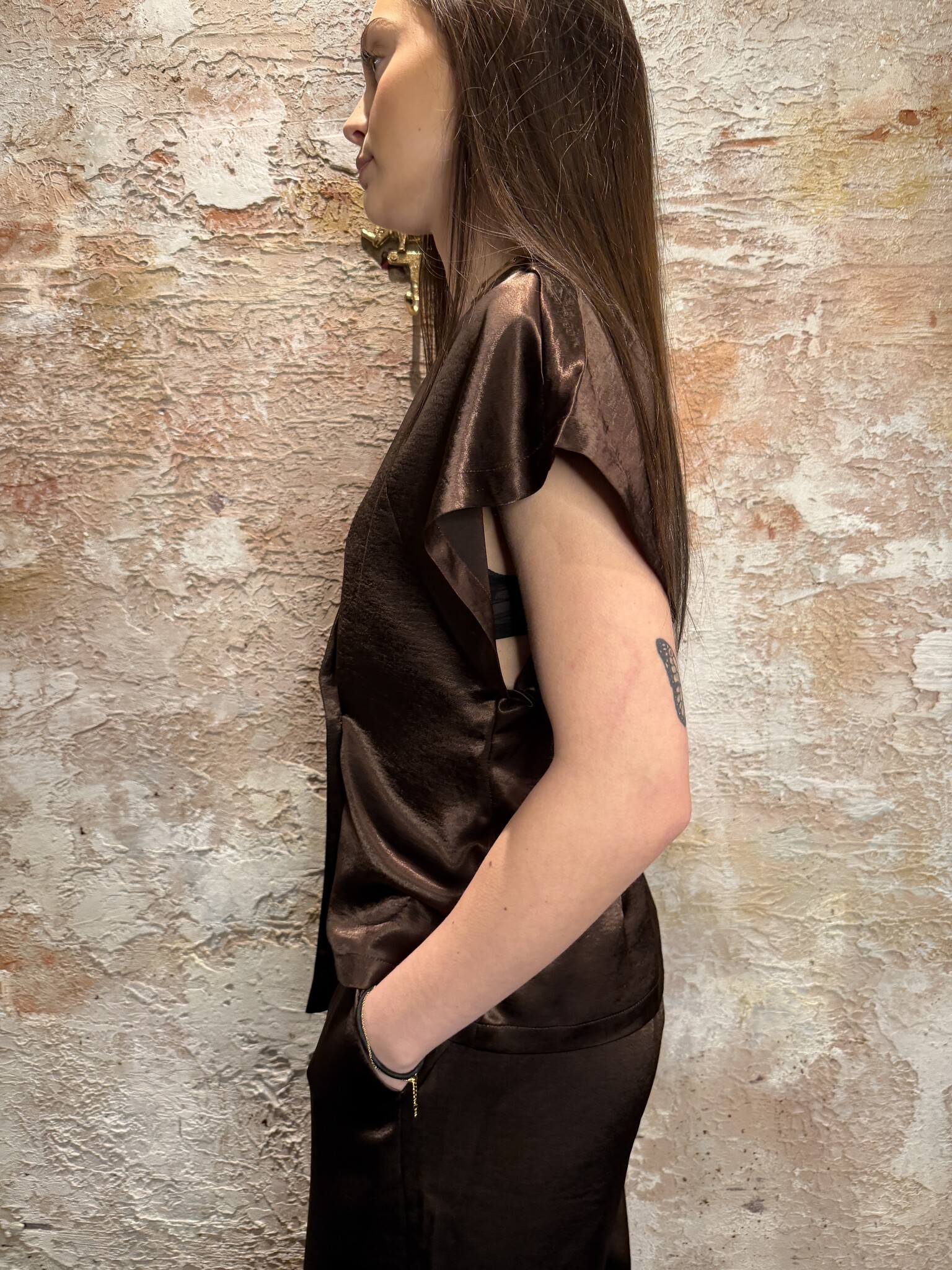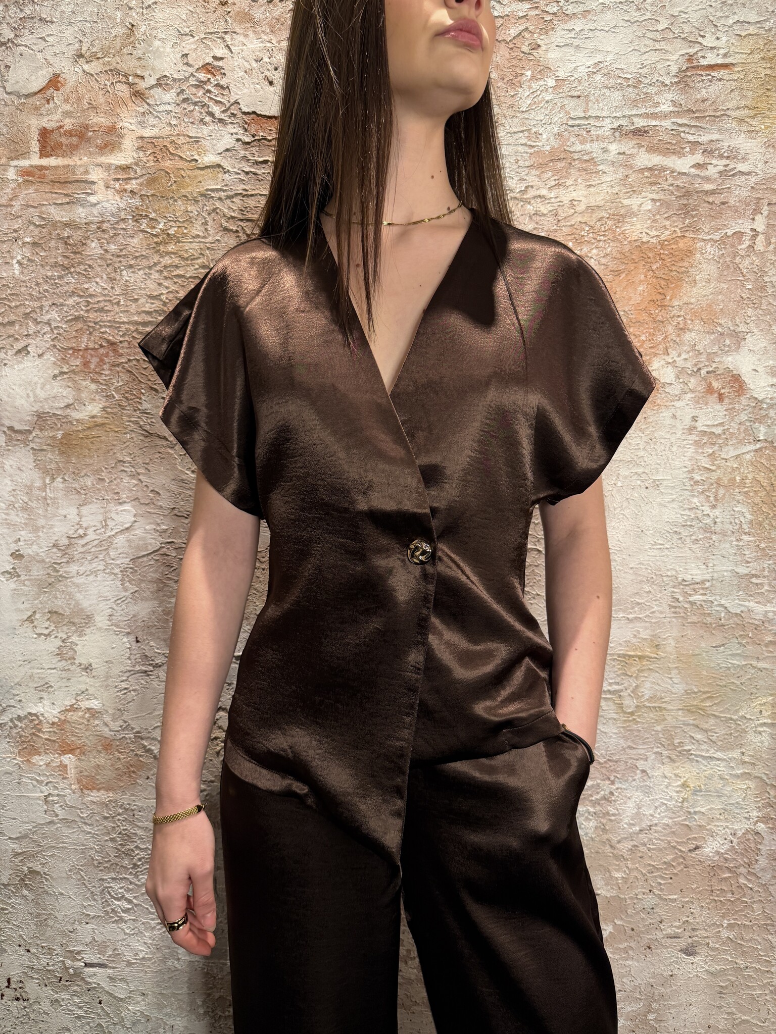 Sisters Point Gevela Brown: elegante satijnlook top met overslag, korte mouw en luxe tortoise knoopdetail. Valt mooi getailleerd en perfect te combineren met de Verina Pants voor een chique, tijdloze set.