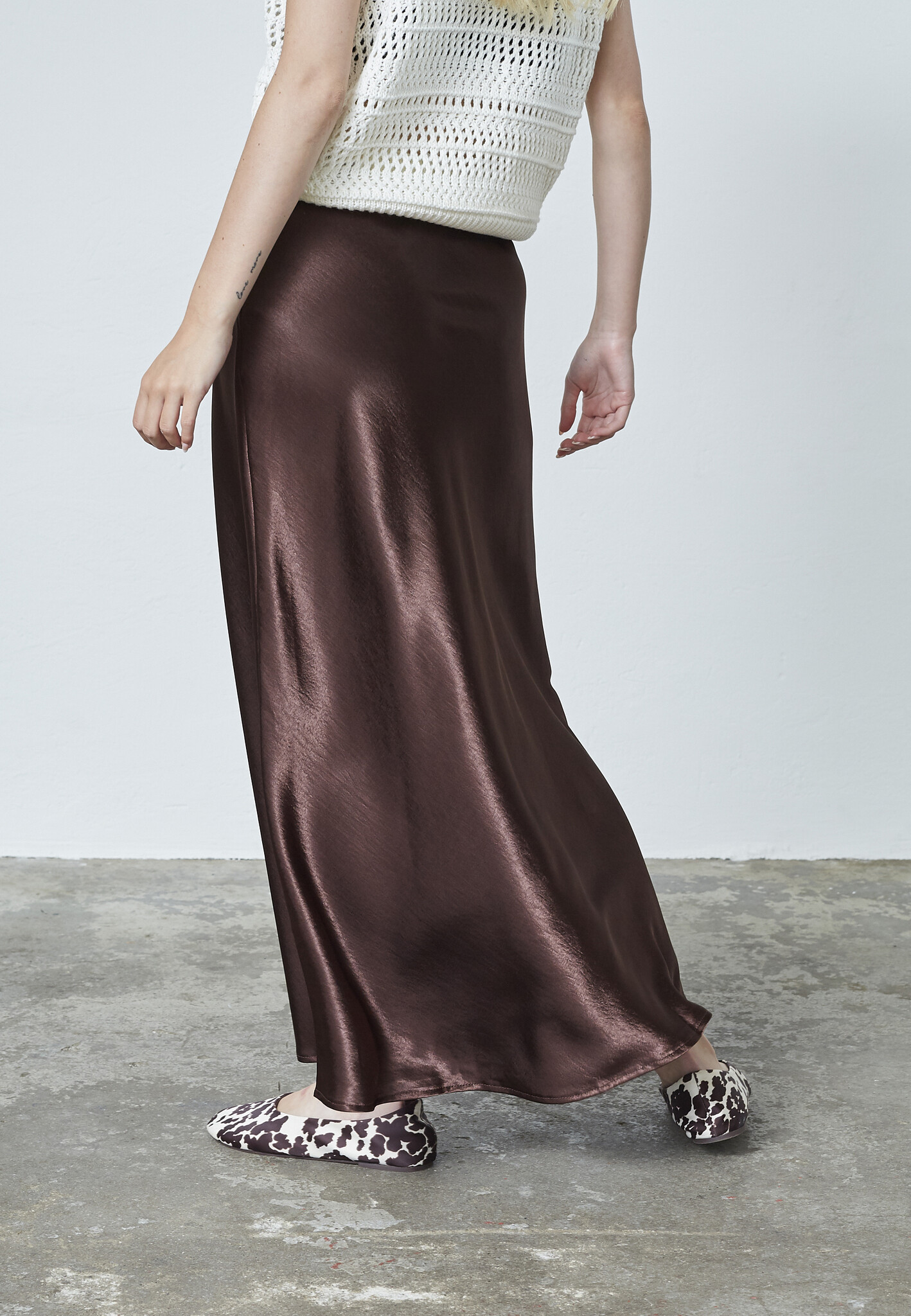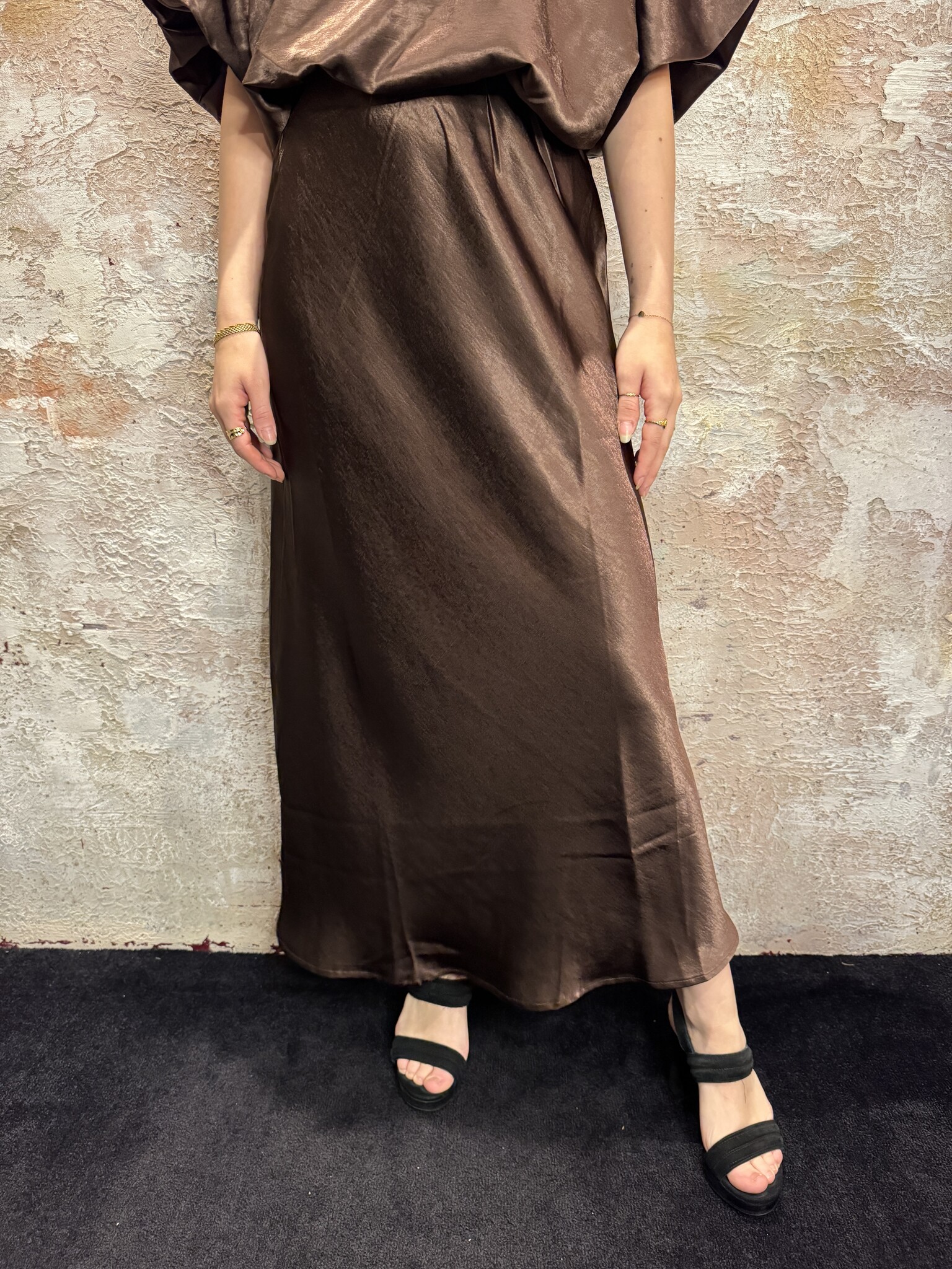 De Gewo Skirt Satin Brown is een elegante satijnen maxi rok in tijdloos zwart. Stijlvol en comfortabel, perfect te combineren met de Gufo Top voor een chique avondlook of trendy dagelijkse outfit.