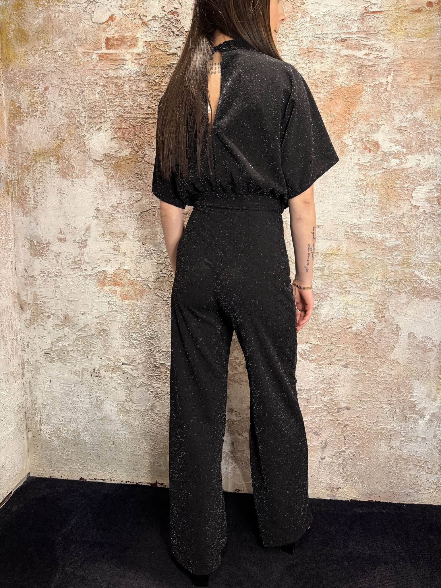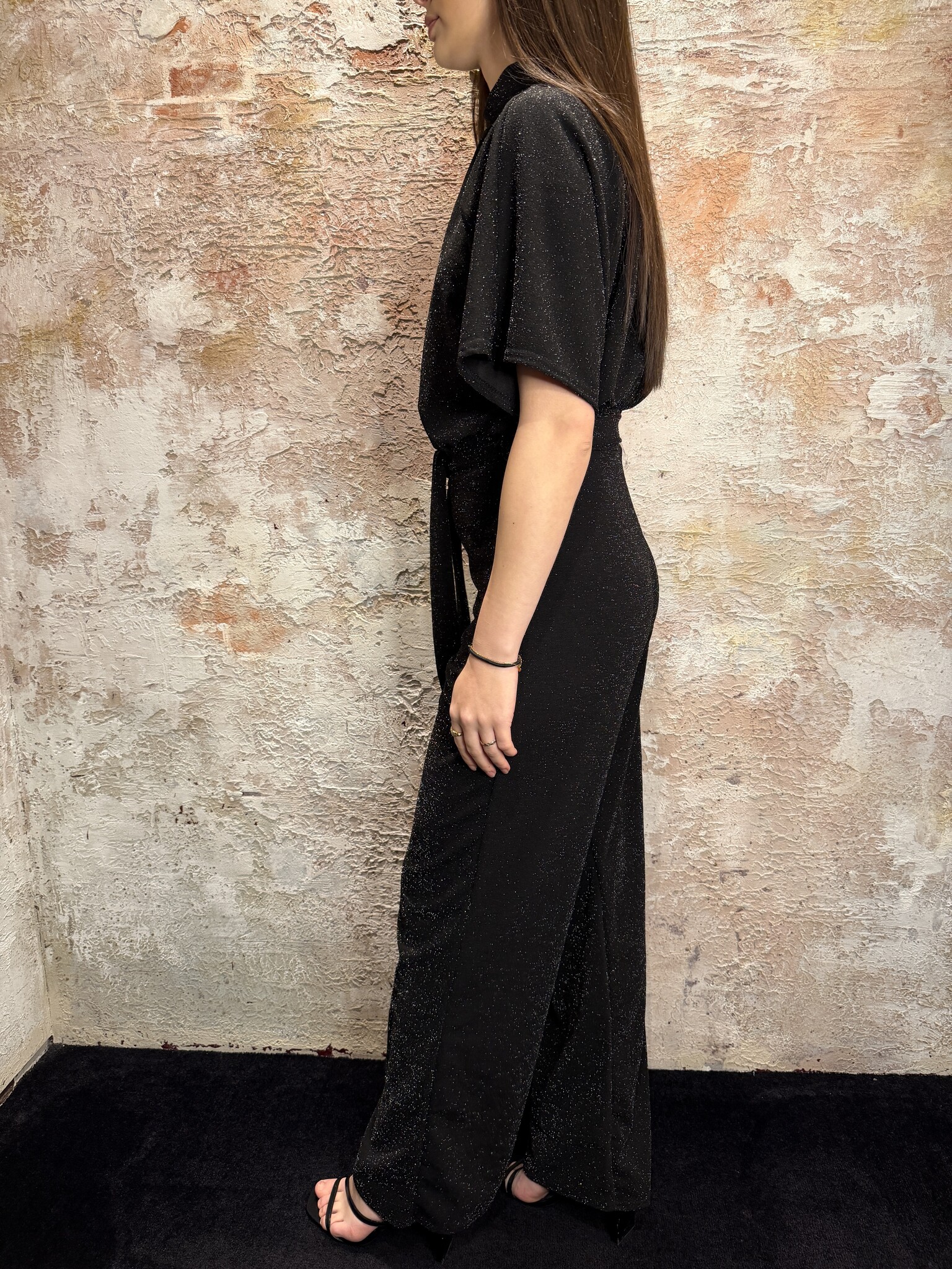 Sisters Point Girl JU4 Jumpsuit Black Silver: elegante zwarte jumpsuit met subtiele zilveren glitter, wide-leg fit en ceintuur in de taille. Met hoge hals en keyhole-back voor een chique, feestelijke look. Perfect voor diners, party nights en holidays.
