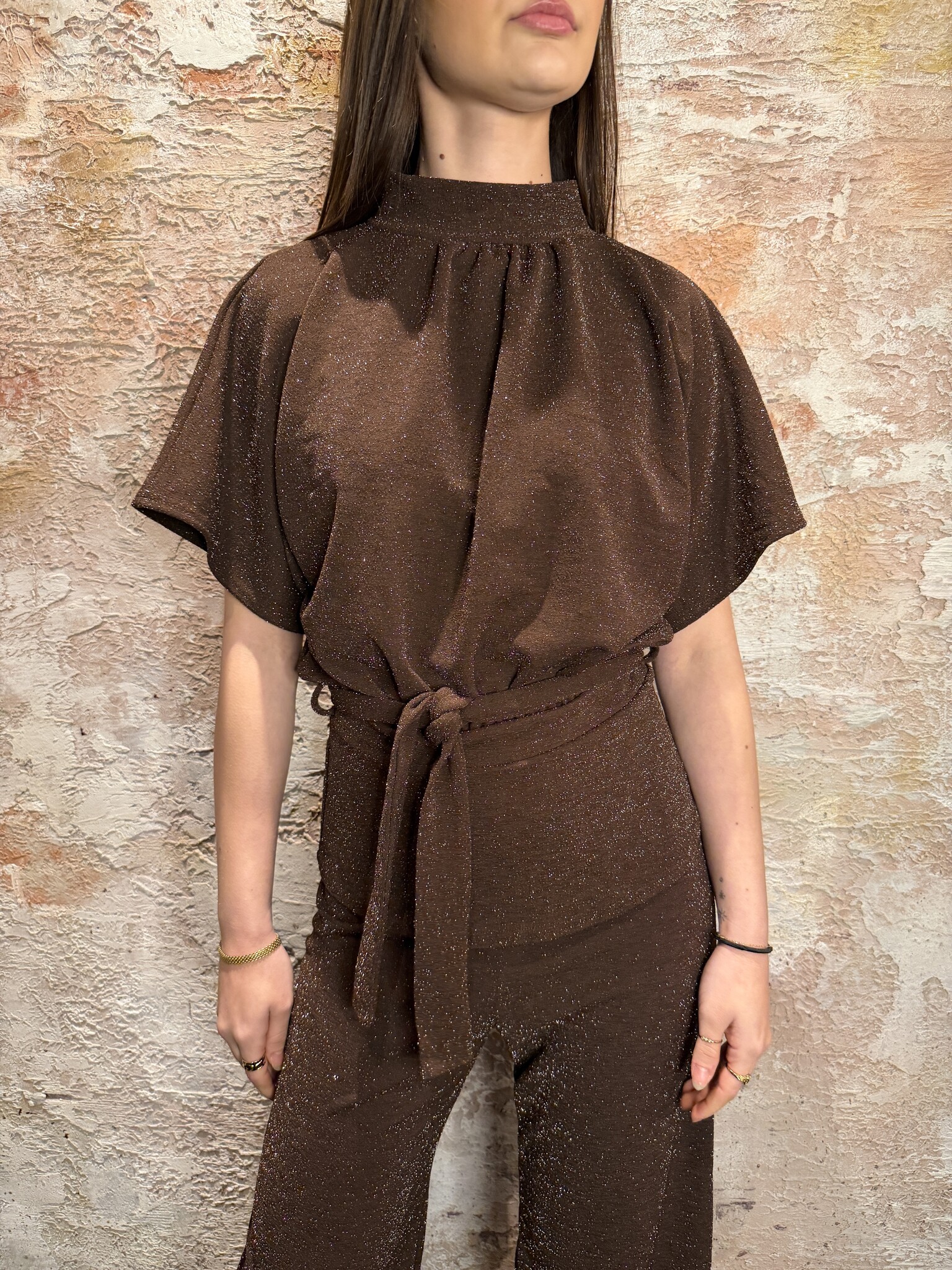 Sisters Point Girl Top Choco Silver: elegante glittertop in chocoladebruin met subtiele zilveren sparkle. Met hoge hals, flutter sleeves en ceintuur voor een getailleerd effect. Perfect te combineren met de Glut Pants voor een complete partylook.