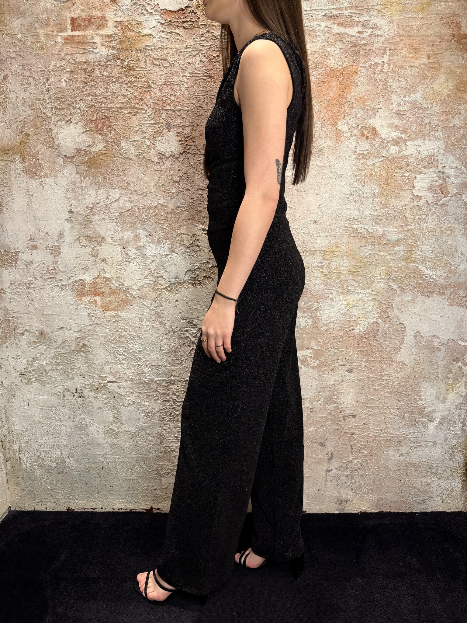 Sisters Point GT JU Jumpsuit Black Glitter: een elegante zwarte glitter jumpsuit met V-hals en wijde pijpen. Comfortabel stretchmateriaal en perfecte pasvorm voor diners, feestjes en holiday nights. Een chique, tijdloze party essential.
