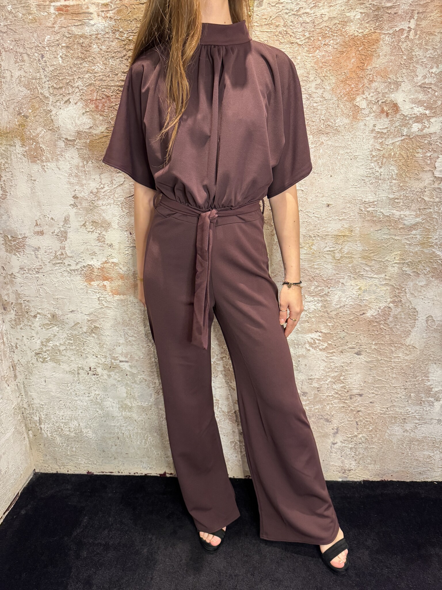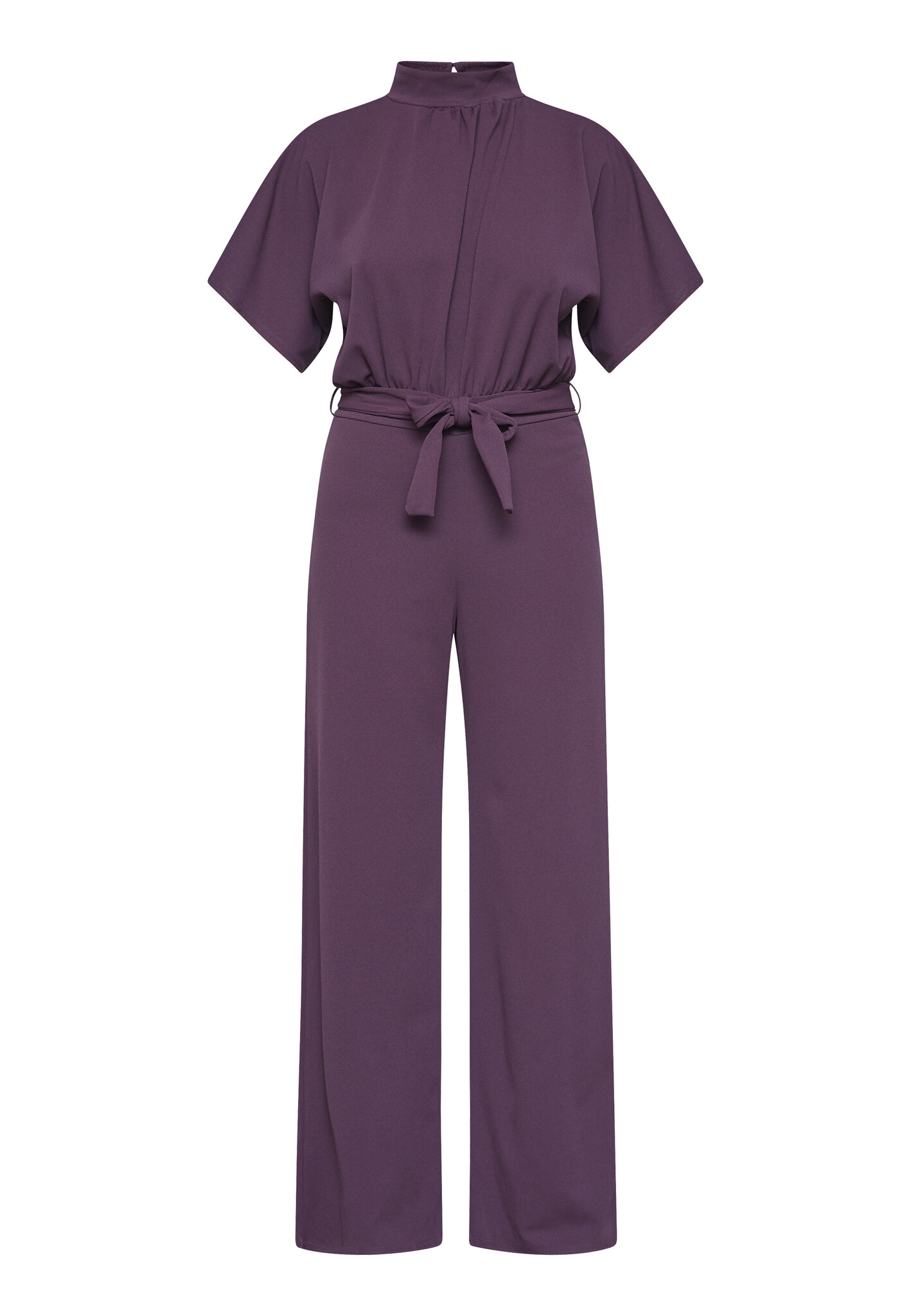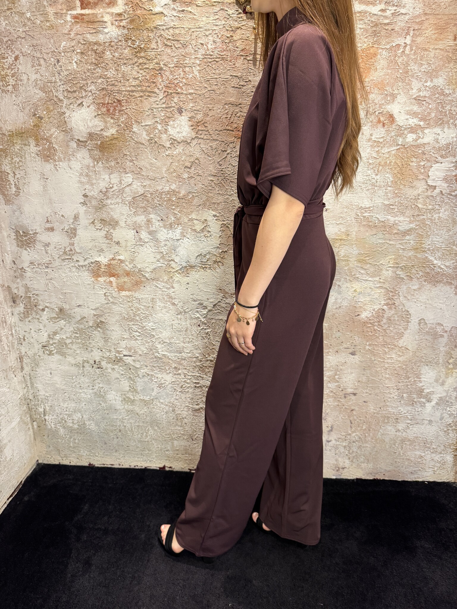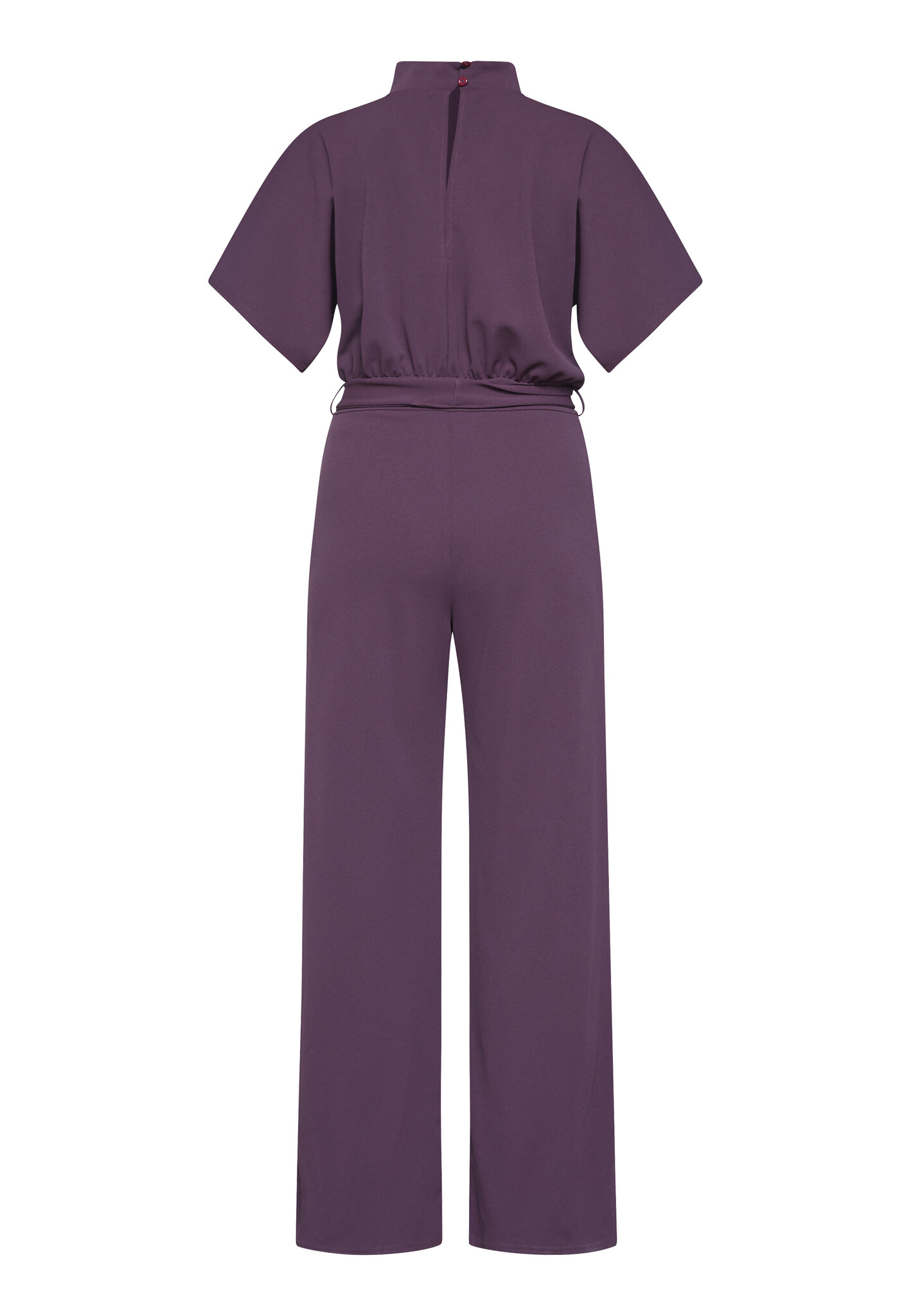Sisters Point Jumpsuit Girl-Ju Bordeaux is een elegante jumpsuit met wijde pijpen, korte kimonomouwen en hoge hals. De taille wordt geaccentueerd met een strikceintuur en de rug heeft een subtiele V-uitsnede. Perfect voor een chique avondlook.