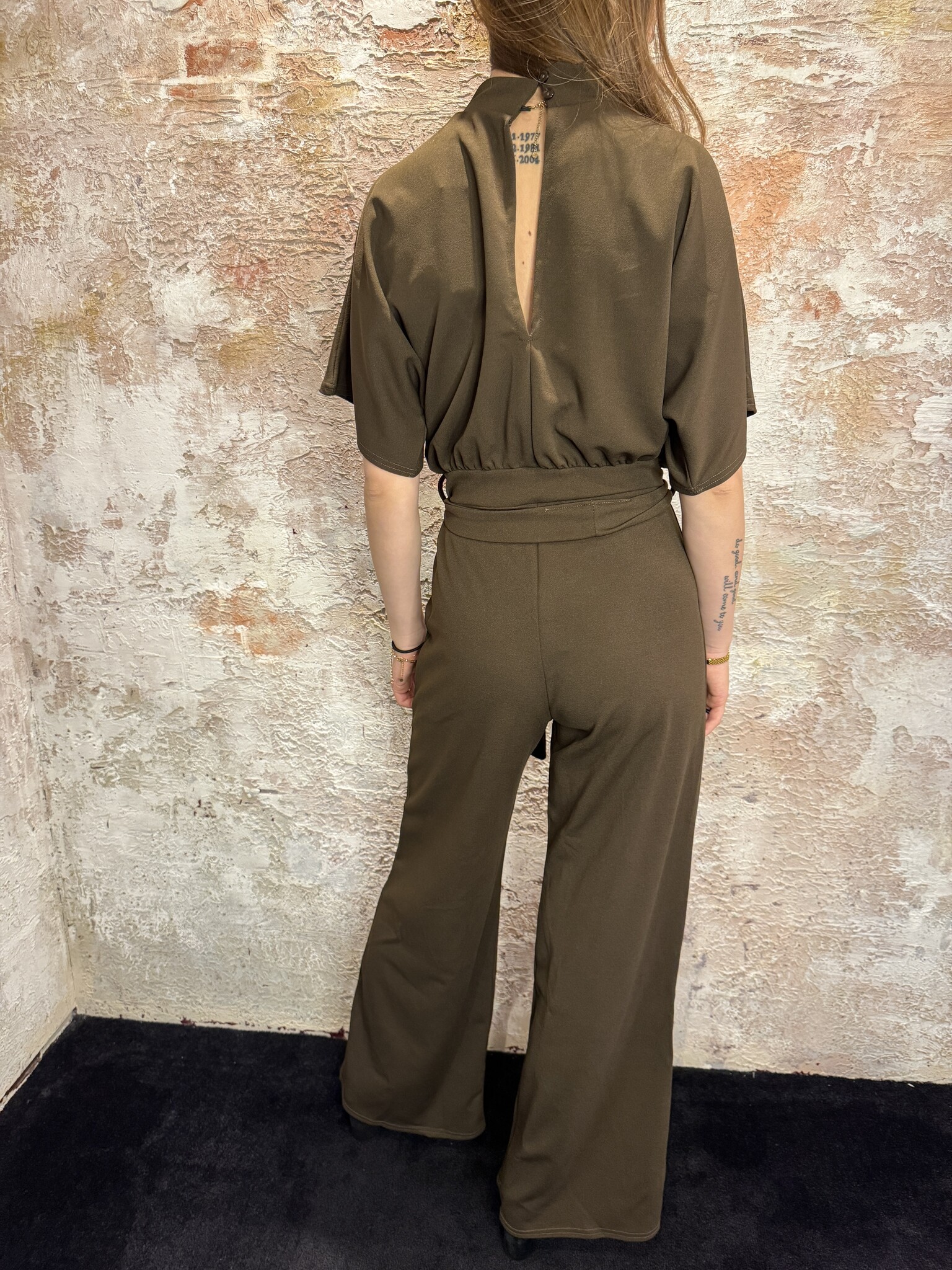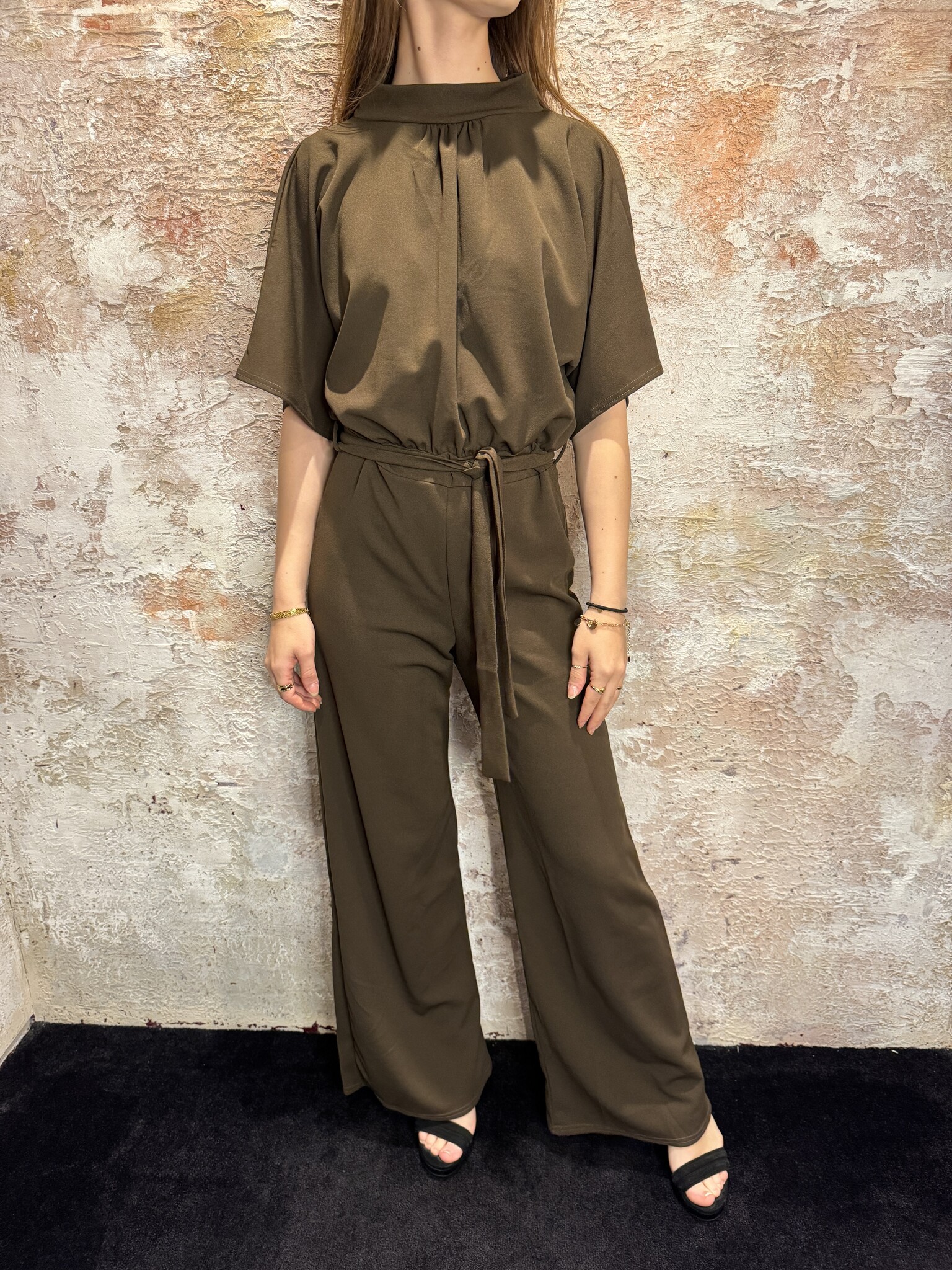 De Sisters Point Aangesloten Girl-Ju Jumpsuit Chocolate met hoge hals, korte mouwen en strikceintuur in de taille. Wide leg pijpen voor een moderne, elegante look. Perfect voor zowel casual als chique gelegenheden.