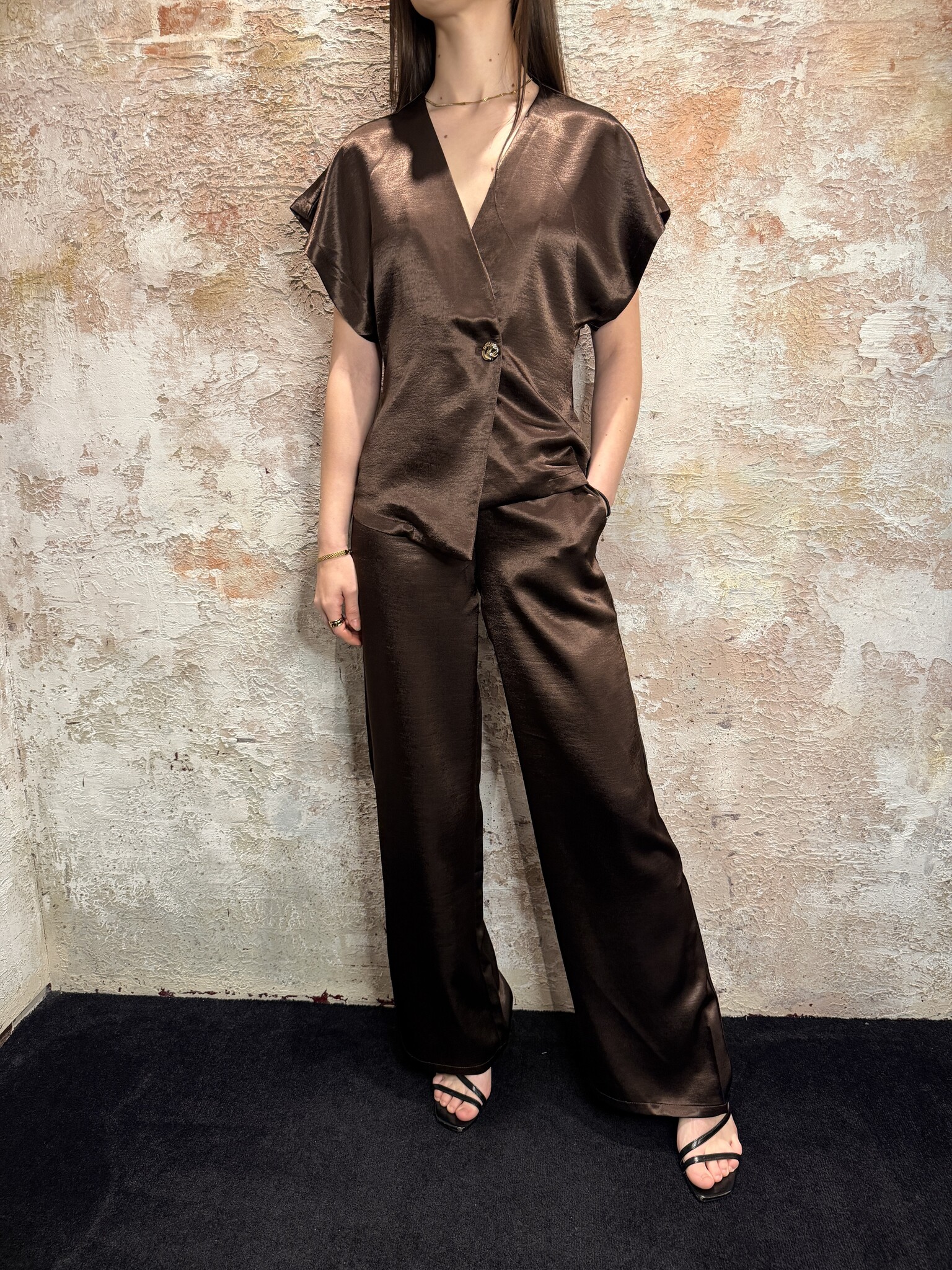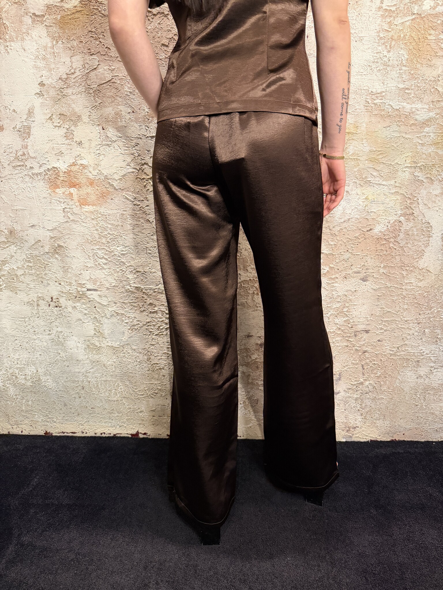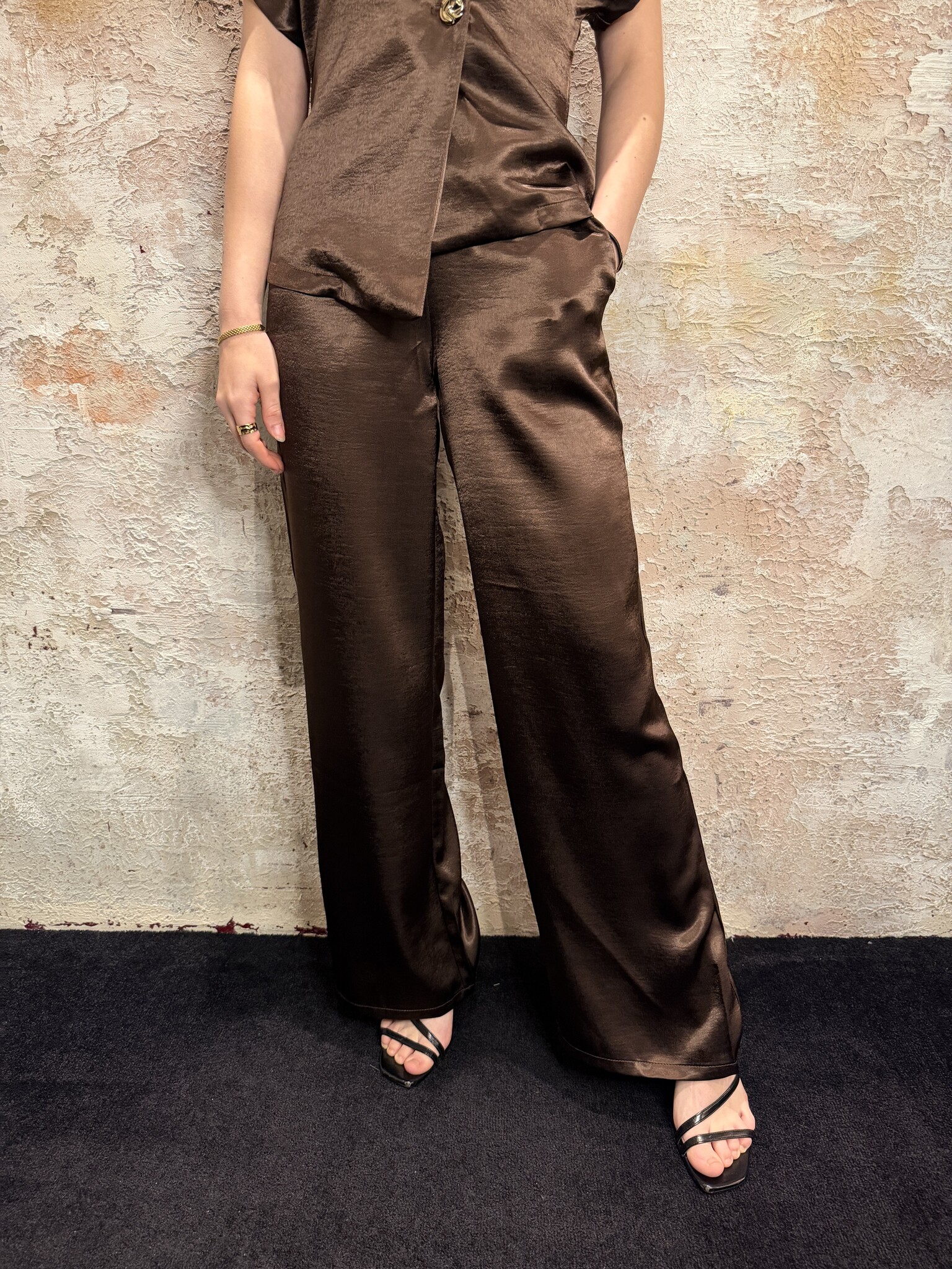 Sisters Point Verina Pant Brown: stijlvolle satijnlook broek in warme chocoladetint. Met vloeiende, rechte pijp en comfortabele high-waist fit. Perfect te combineren met de Verina top voor een moderne, chique co-ord set.