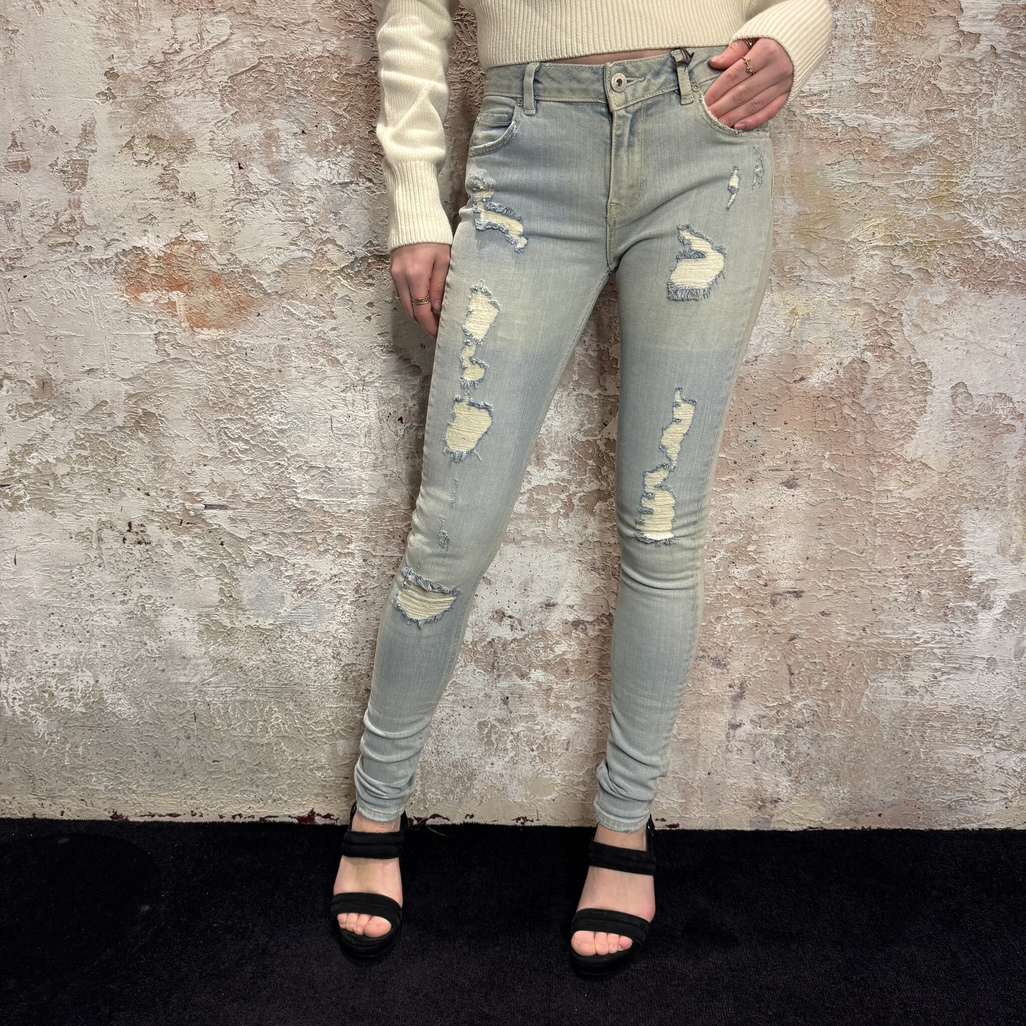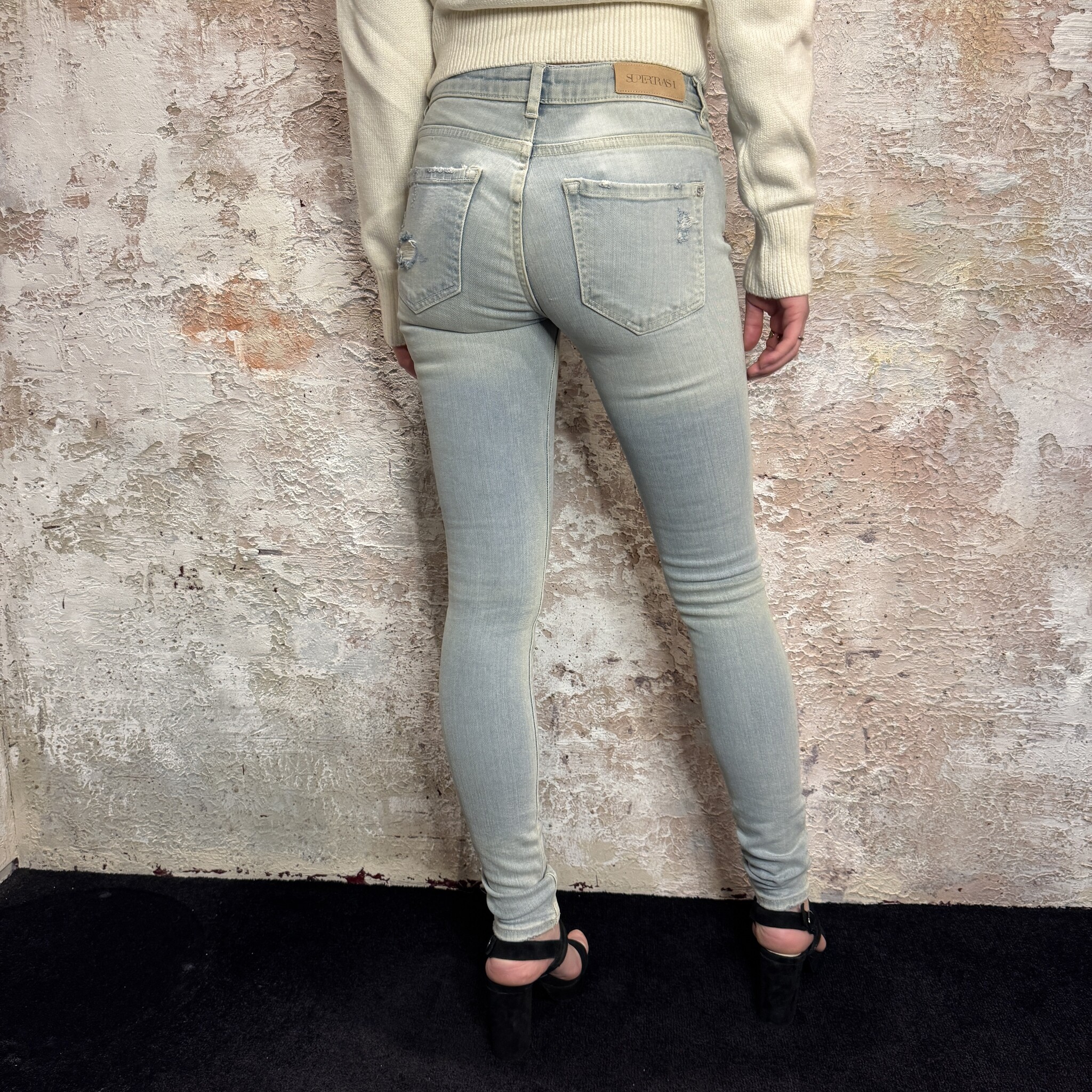 Supertrash Skinny Mid Waist Destroyed is een trendy skinny jeans met een middelhoge taille. De lichte wassing en de opvallende destroyed details geven de broek een stoere, casual uitstraling. Gemaakt van stretchdenim voor comfort en een perfecte pasvorm.
