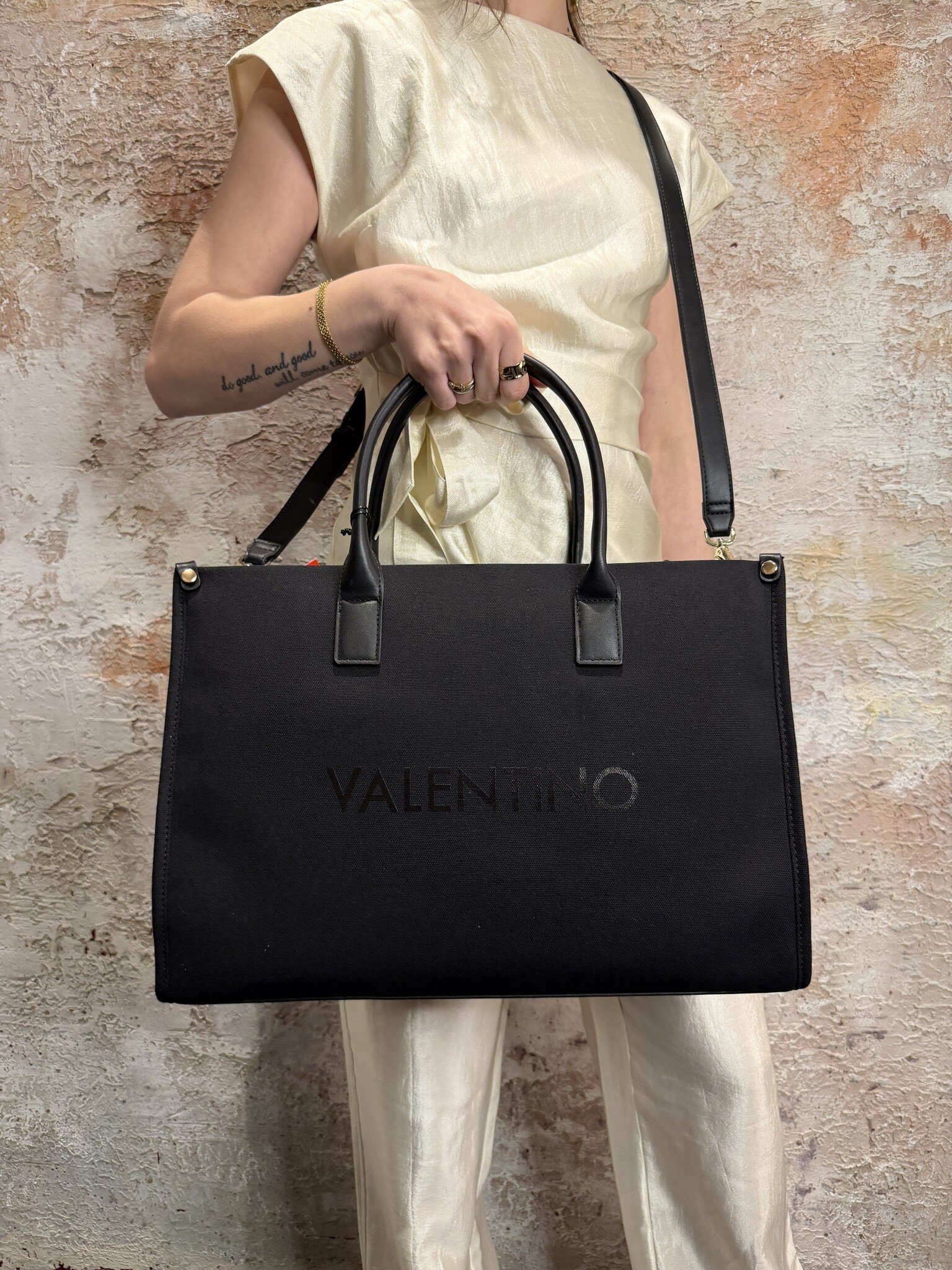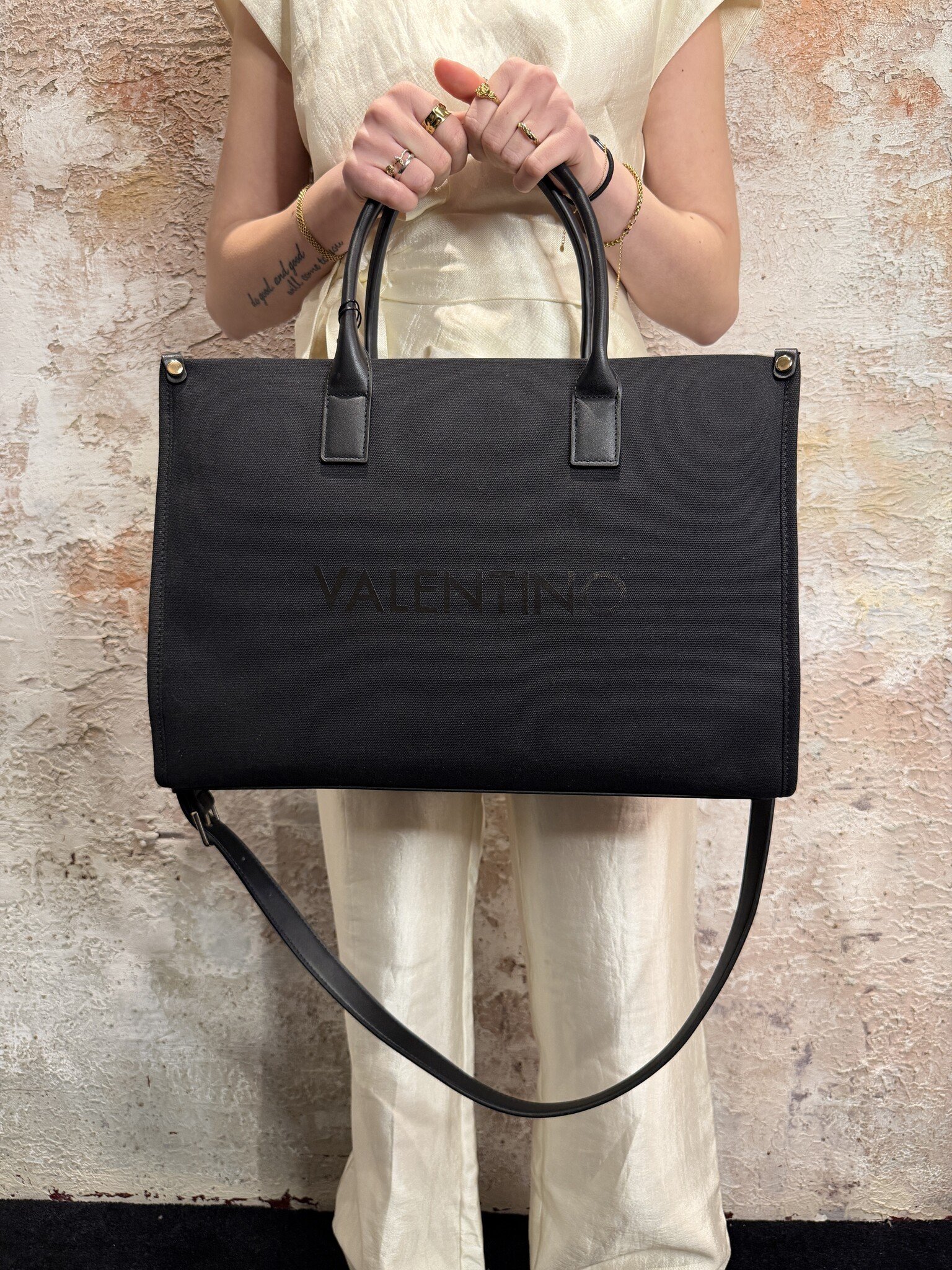 Valentino Acantha Shopping Bag in zwart met opvallend logo op de voorzijde. Voorzien van stevige handvatten en afneembare schouderband. Ruim en praktisch, perfect voor dagelijks gebruik met een trendy en krachtige uitstraling.