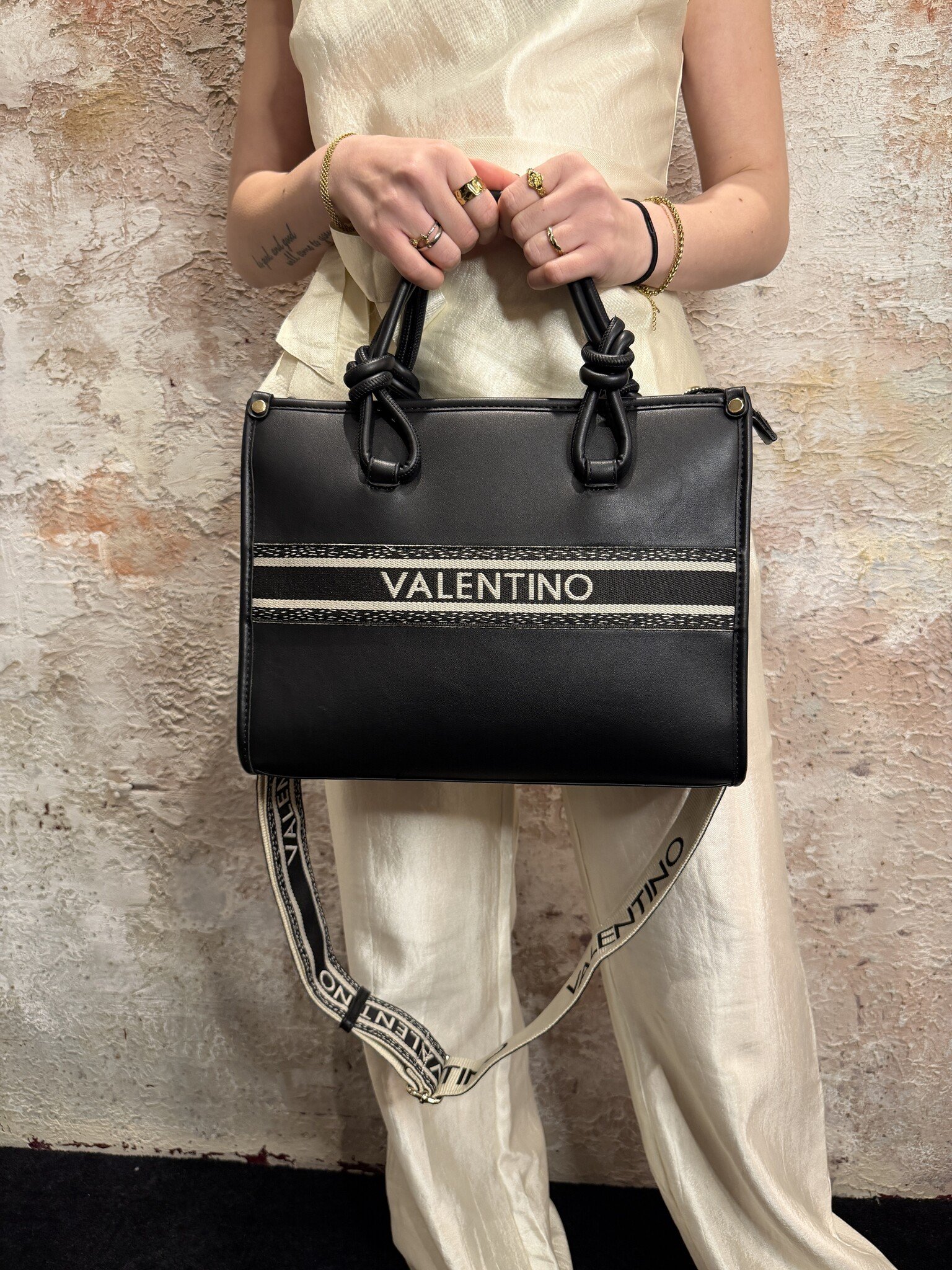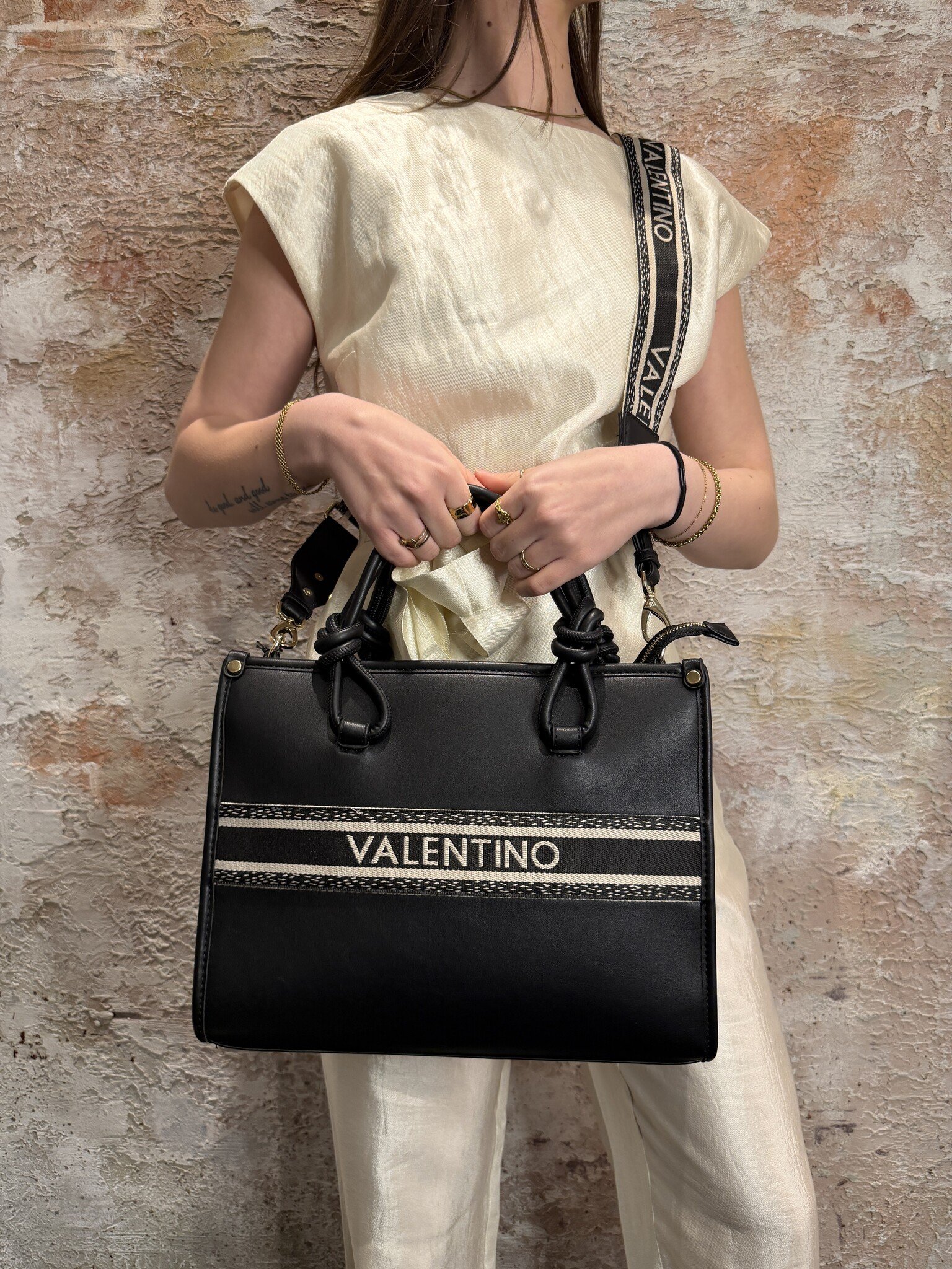 Valentino Aella Shopping Bag in Nero met stijlvol logo detail in contrastkleur. Voorzien van stevige handvatten en afneembare schouderband voor extra draagcomfort. Ruim en praktisch, perfect voor dagelijks gebruik met een luxe uitstraling.