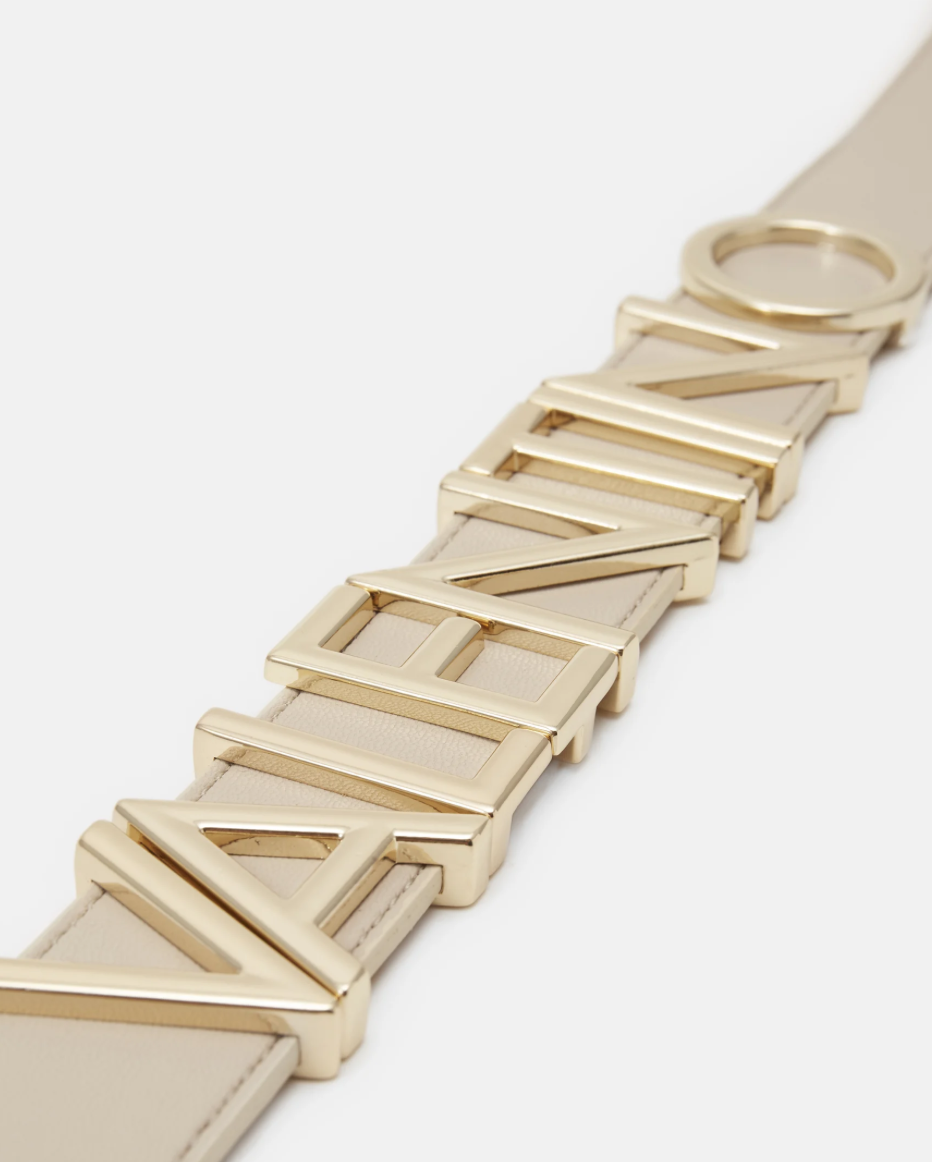 Dunne smalle dames riem met losse goudkleurige letters in ecru.