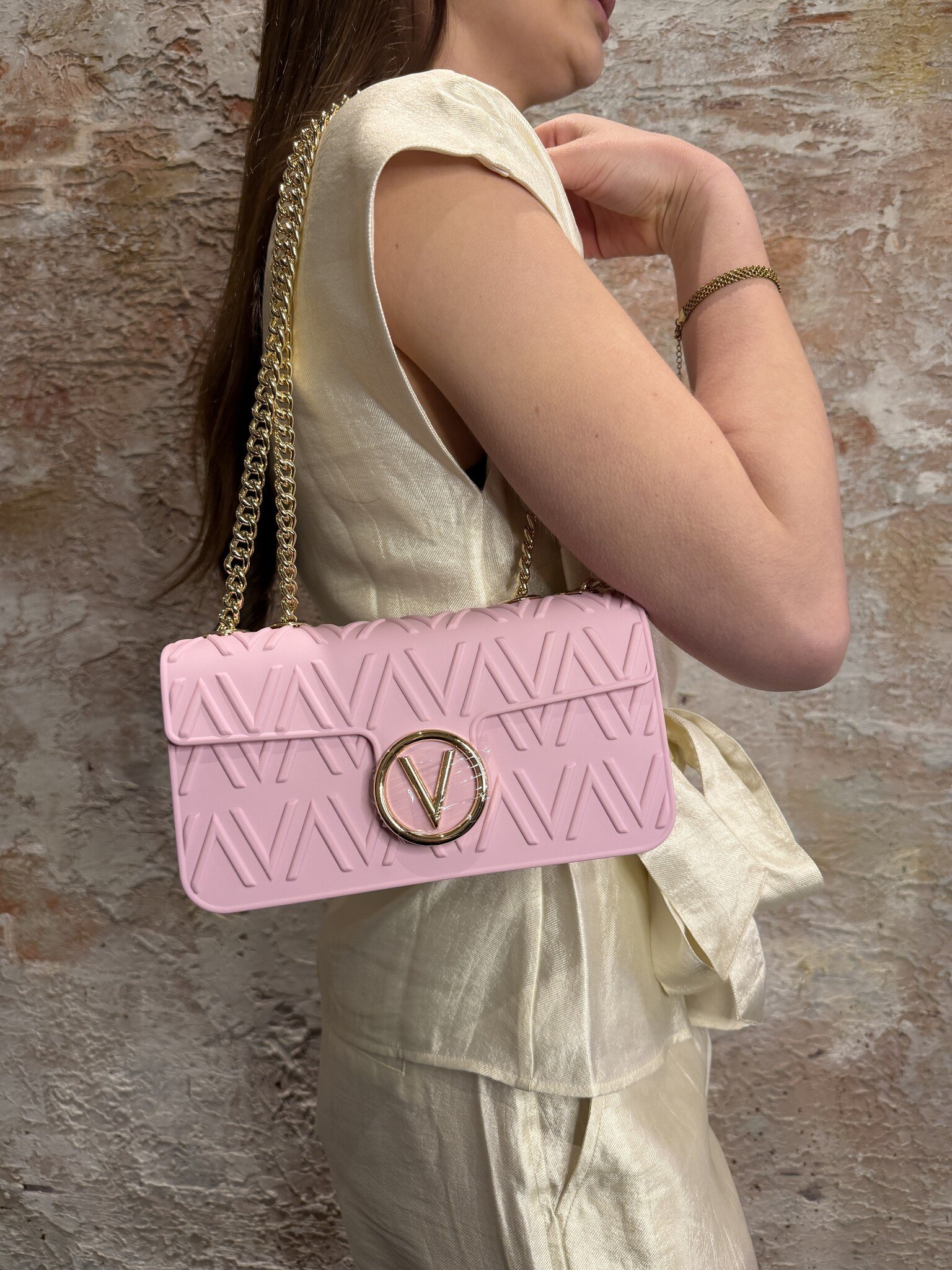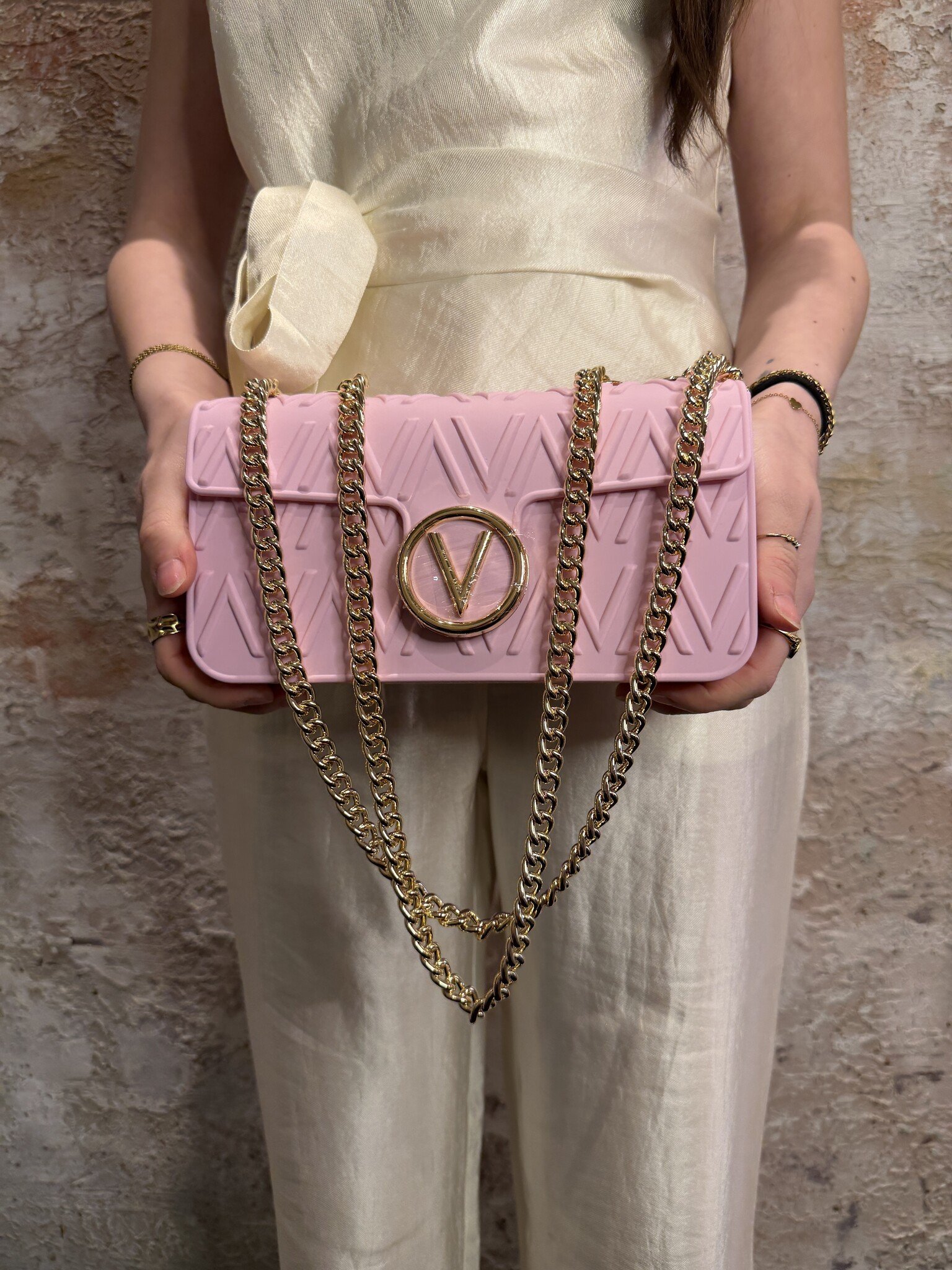 Valentino Flap Bag Bubble in cipria met luxe V-logo en opvallend reliëf. Voorzien van gouden ketting en flapsluiting. Compact en stijlvol, perfect voor een elegante look en ideaal voor elke gelegenheid. Kuntstof.