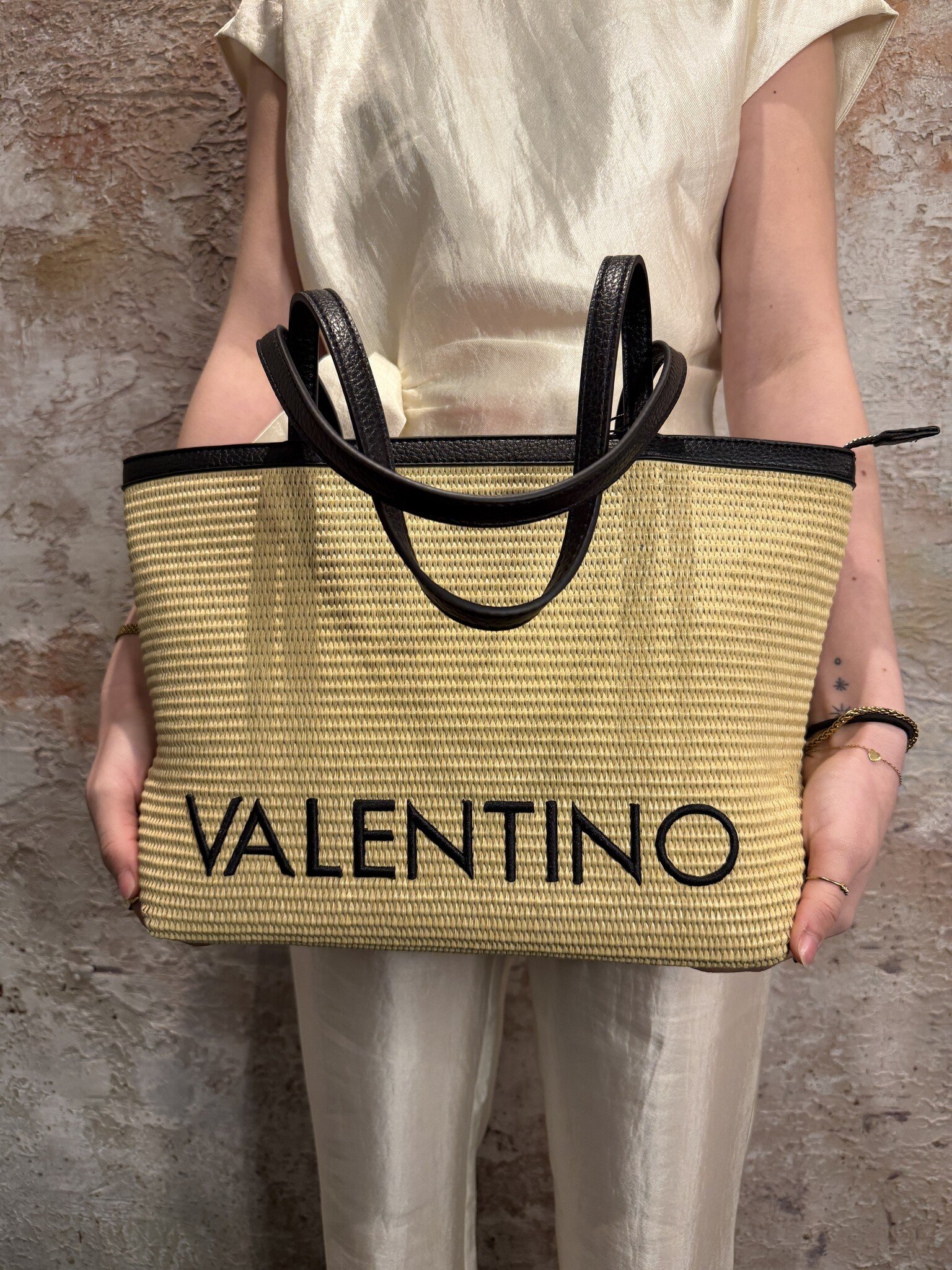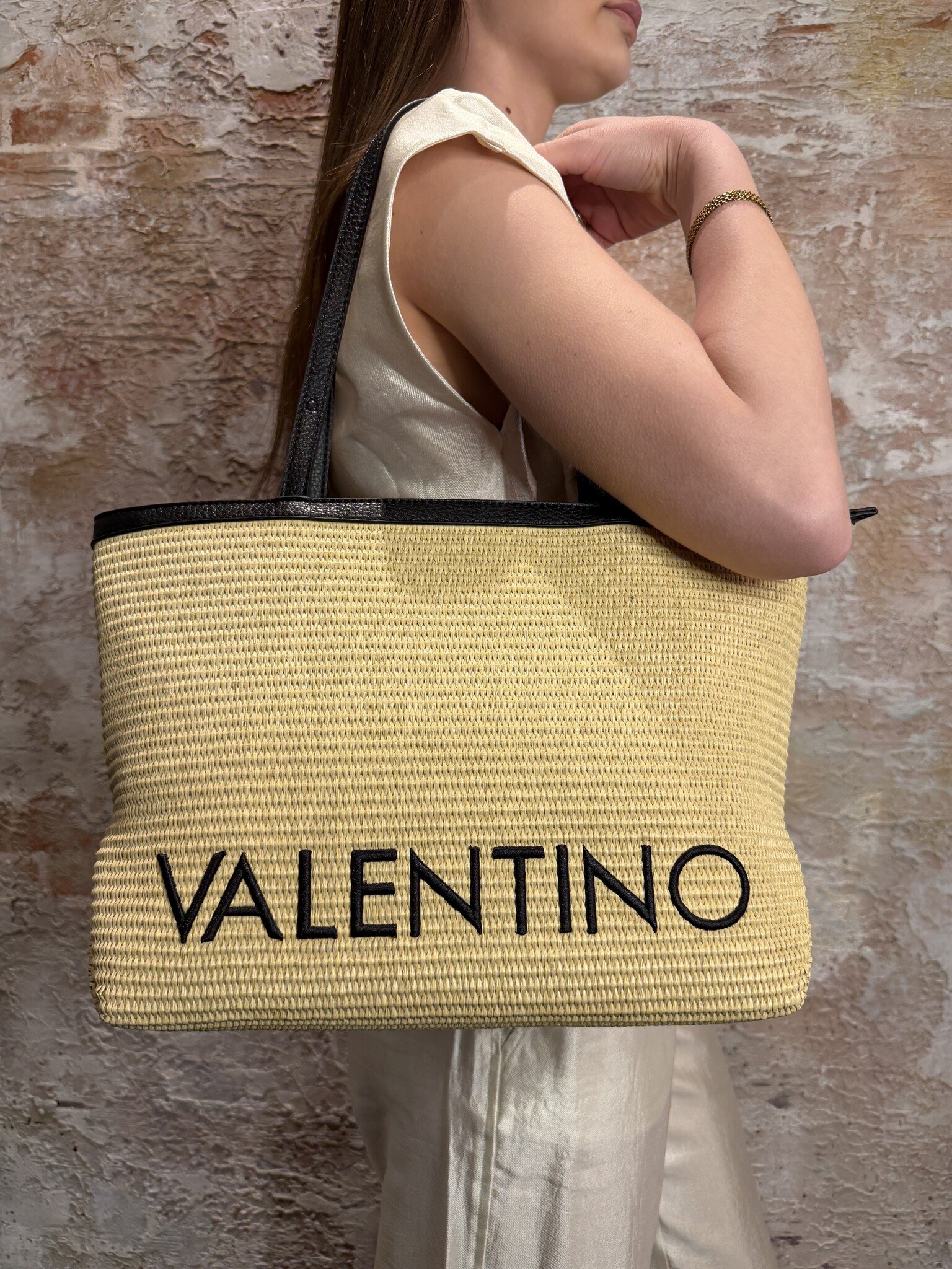 Valentino Maiam Shopping Bag in natural/nero met gevlochten look en contrasterend logo. Voorzien van stevige handvatten en ritssluiting. Ruim, licht en perfect voor een stijlvolle zomerse look of dagelijks gebruik.
