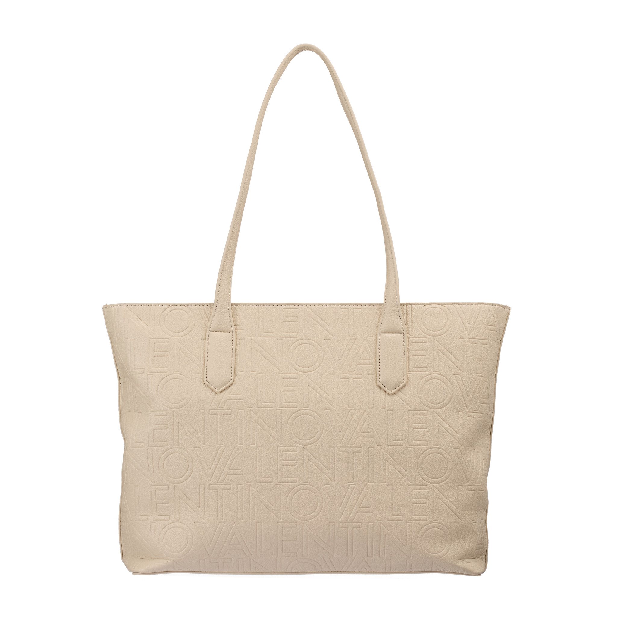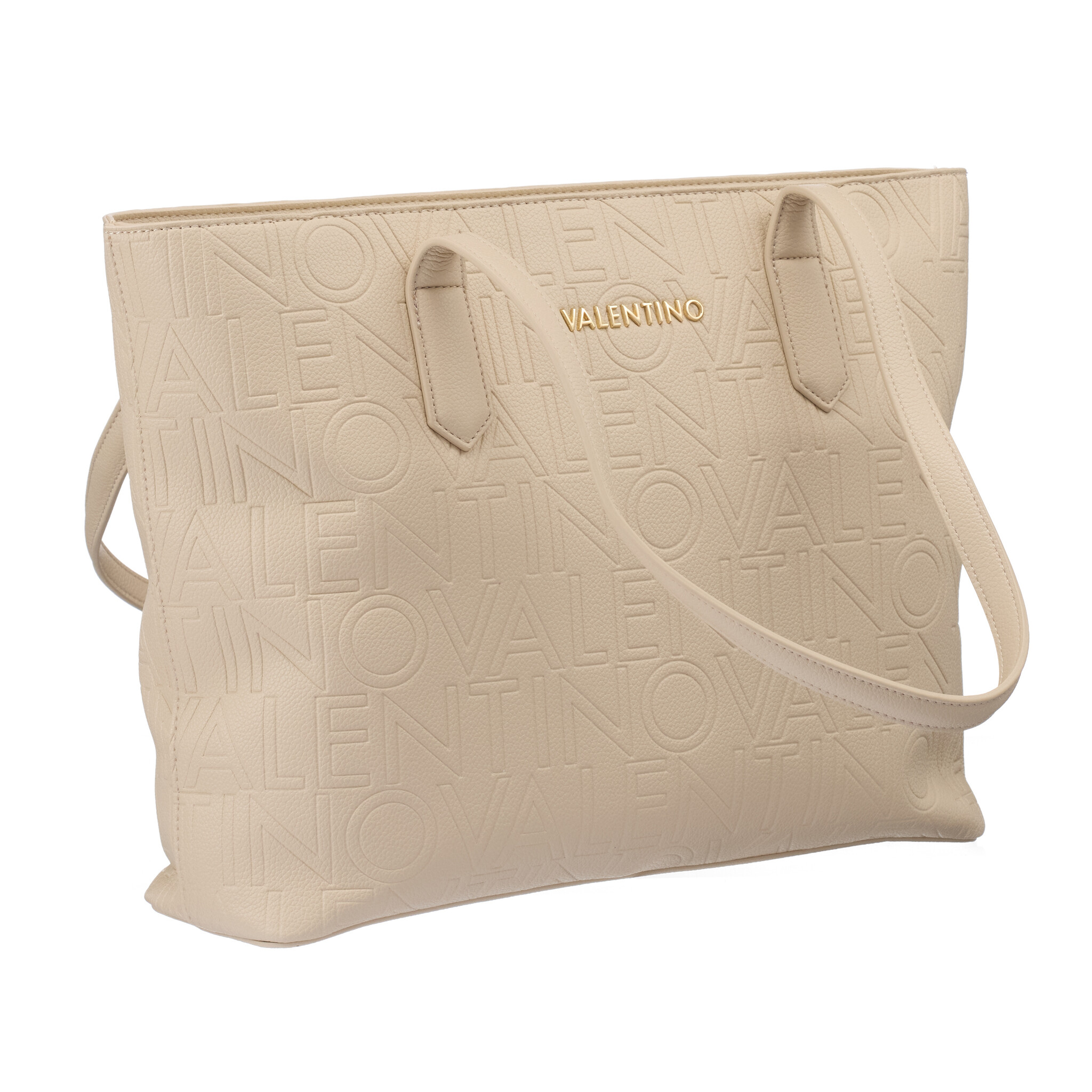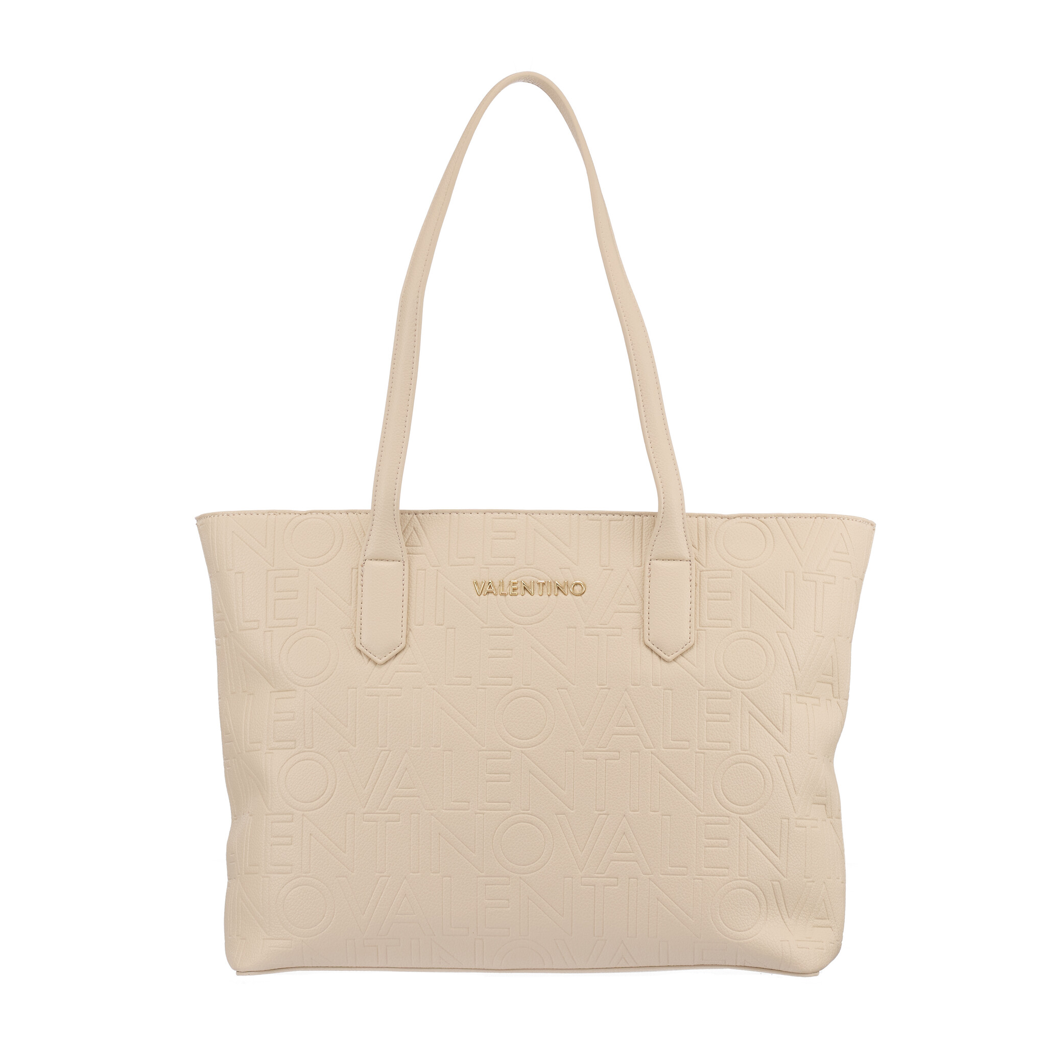 Valentino Pansy Shopping Ecru VBS8PG01: Elegante shopper in ecru met all-over reliëflogo en goudkleurig merkembleem. Ruim hoofdvak met rits, binnenvak en lange hengsels voor comfortabel dragen. Perfect voor stijlvol dagelijks gebruik.